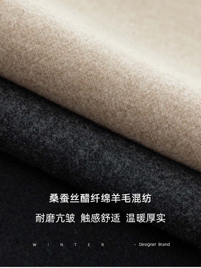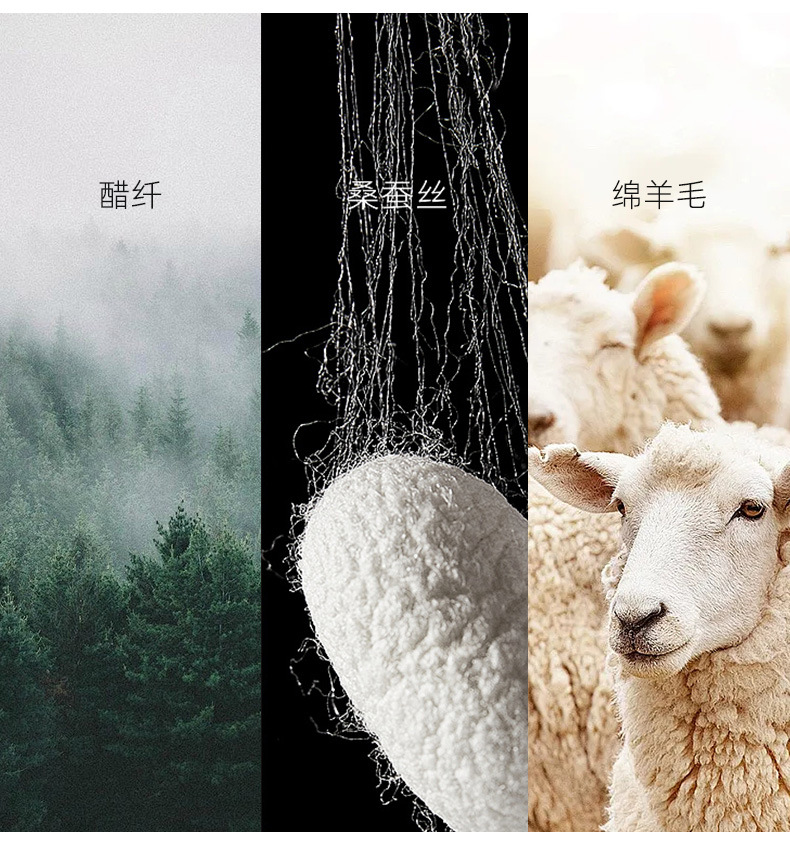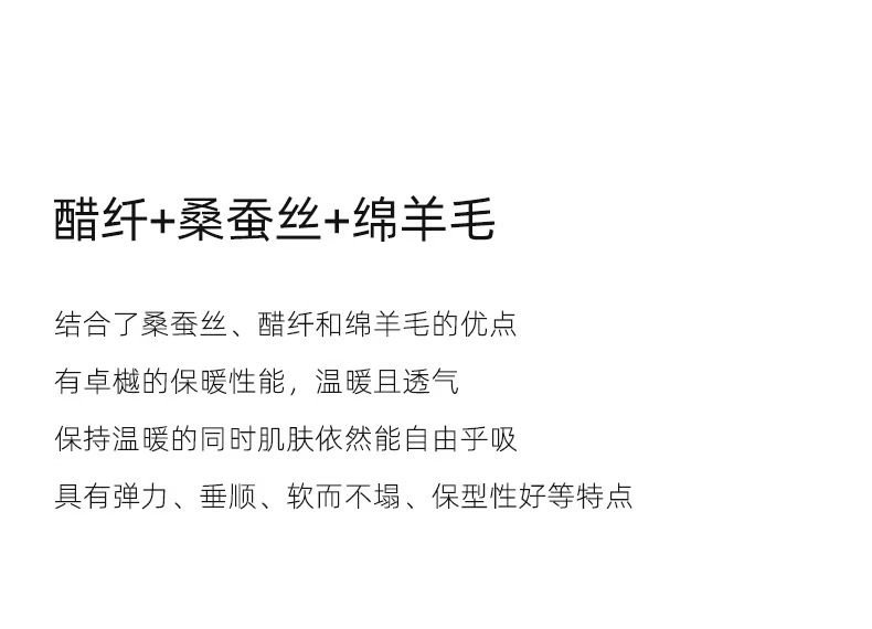 结合了桑蚕丝,醋纤和绵羊毛的优点,有卓樾的保暖性能,温暖且透气。