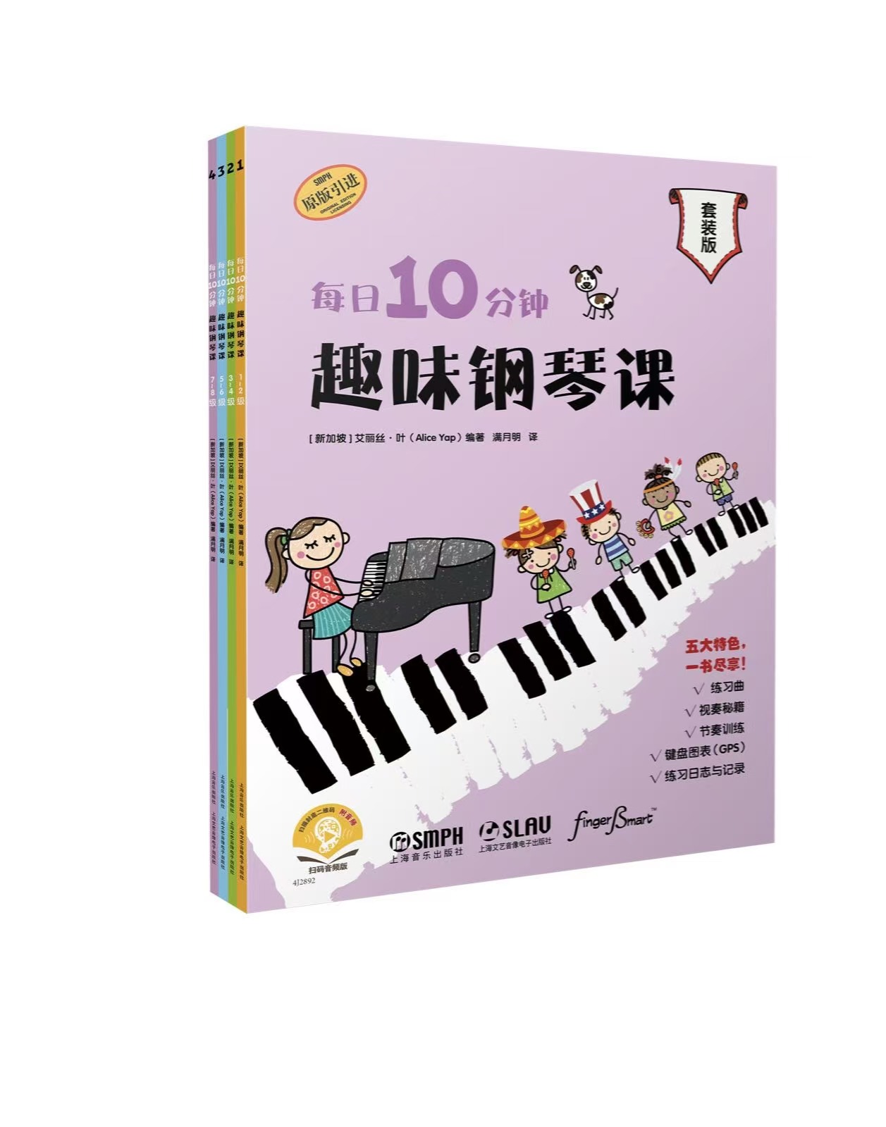 这是一套让你在每天的五分钟里,能够彻底改变自己的钢琴学习教程。教程包括4个学习级别,8个核心内容包括技巧、视谱、节奏、练习记录以及和弦图谱,并且还配有线上学习支持系统。每一册内容都精心设计,旨在让学习者每天用最短的时间达到最好的习琴效果。这些练习可以改善演奏技巧,强化音乐技能,加强节奏感,加倍提高视谱能力,并帮助学生运用不同风格进行即兴创作。