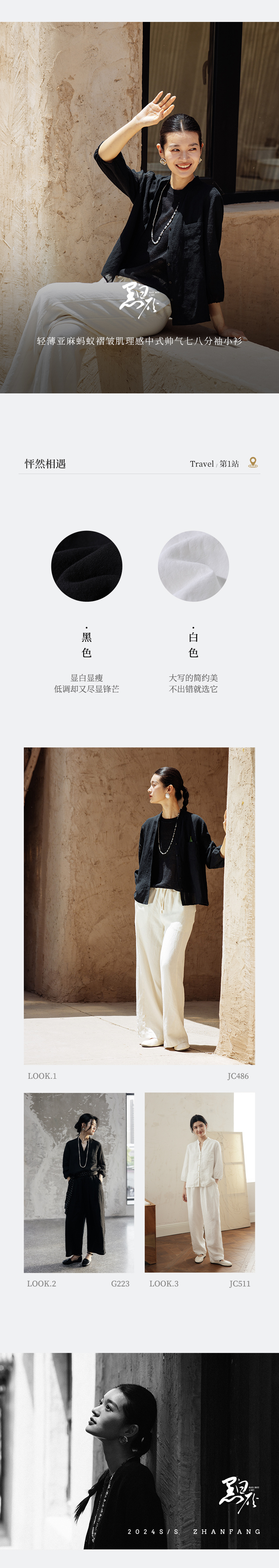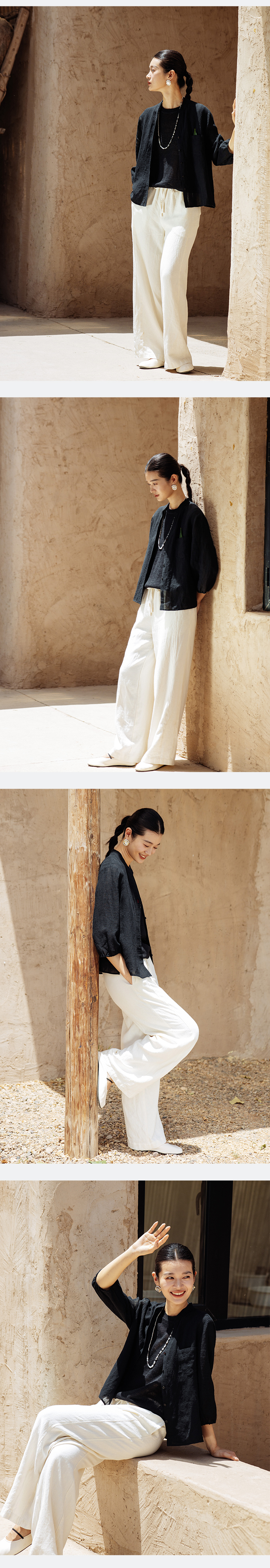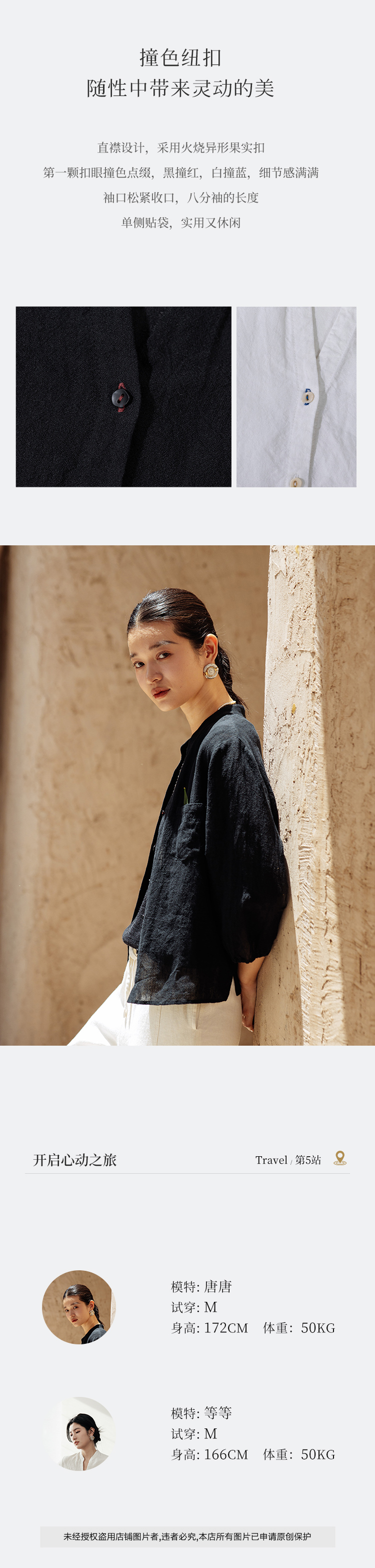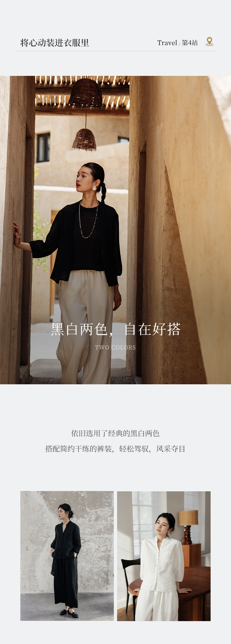 绽放旅行女装462朵【黑白灰系列】轻薄亚麻褶皱肌理感中式小衫