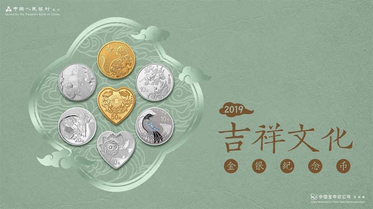 中国人民银行发行2019吉祥文化金银纪念币一套共7枚,其中金质纪念币2枚,银质纪念币5枚。