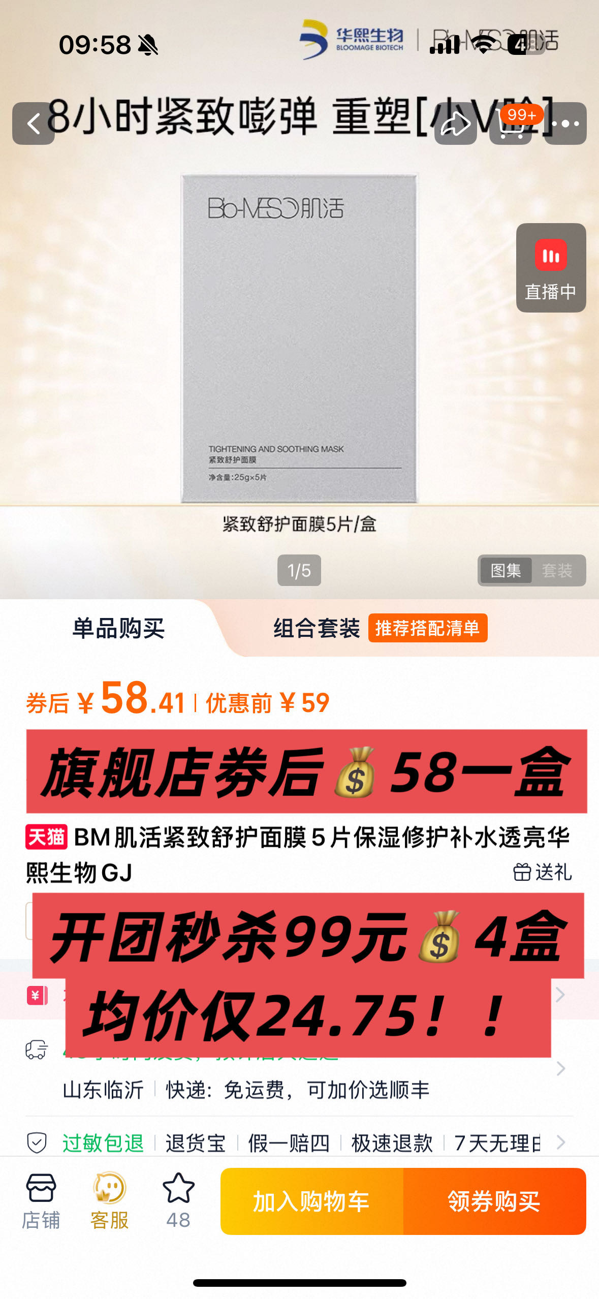【产品名称】:Bio-MESO肌活紧致舒护面膜 【规格】:单片 【发货时间】:下单后24-72小时内 【发货地】:山东 【到期日期】:2027年12月11日 【保质期】:3年 【快递】圆通中通申通 随机发 【不发地区】新疆西藏港澳台海外 【加运费区域】海南/甘肃/内蒙/宁夏/青海+3元/单 【关于售后】 1⃣ 产品出物流单号后,拒不支持拦截召回,不支持拒收,如若拒收拦截扣6元发出运费⚠ 2⃣客户留的地址、电话、备注等信息,导致货物不能正常送达,均不在售后范围内! 3⃣发货和上传单号有24-48小时的时差,没有单号/单号无物流不代表没有发货,全国各大仓库对接流程复杂,请耐心等待! 4⃣收到当场验货,有质量问题在签收24小时内,带快递面单和产品质量问题照片+订单信息,联系团长处理,超时不予处理⚠! 5⃣秒杀品无质量问题不退不换! ⚠⚠⚠⚠护肤品只能保证正品,不能保证适合每个人!但再贵的护肤品都不能保证0过敏率!故此,过敏不作为售后理由!已拆封不支持退换货