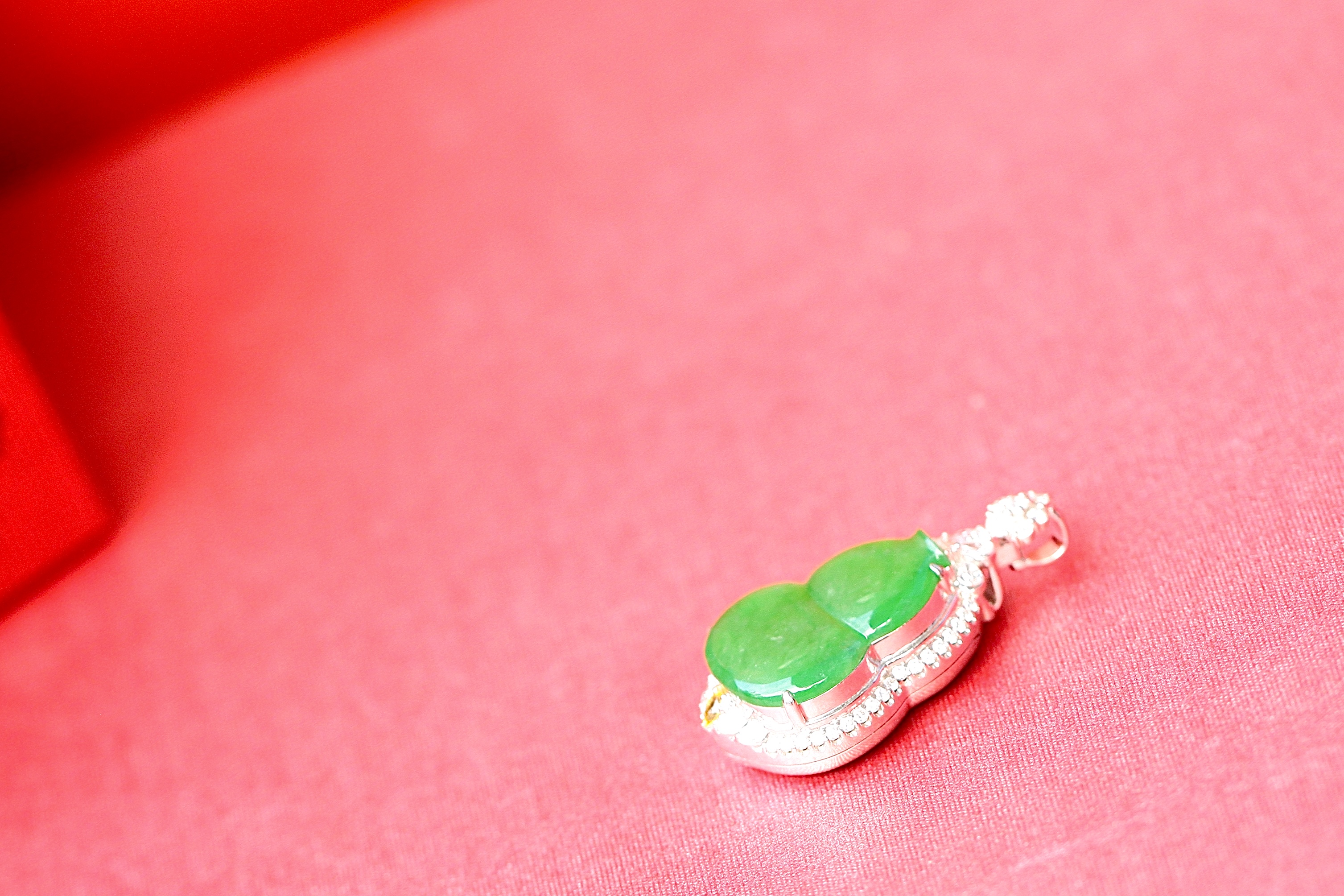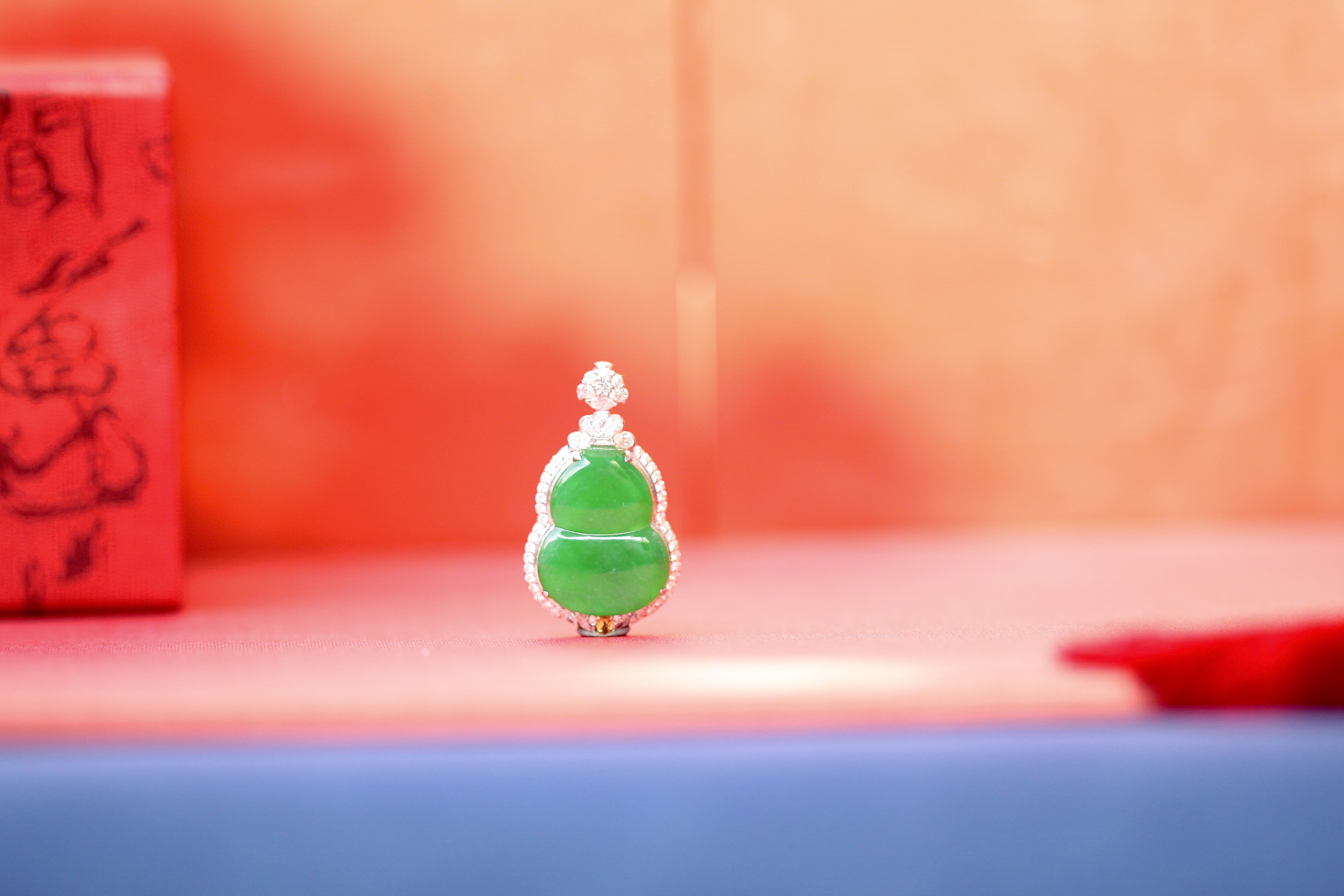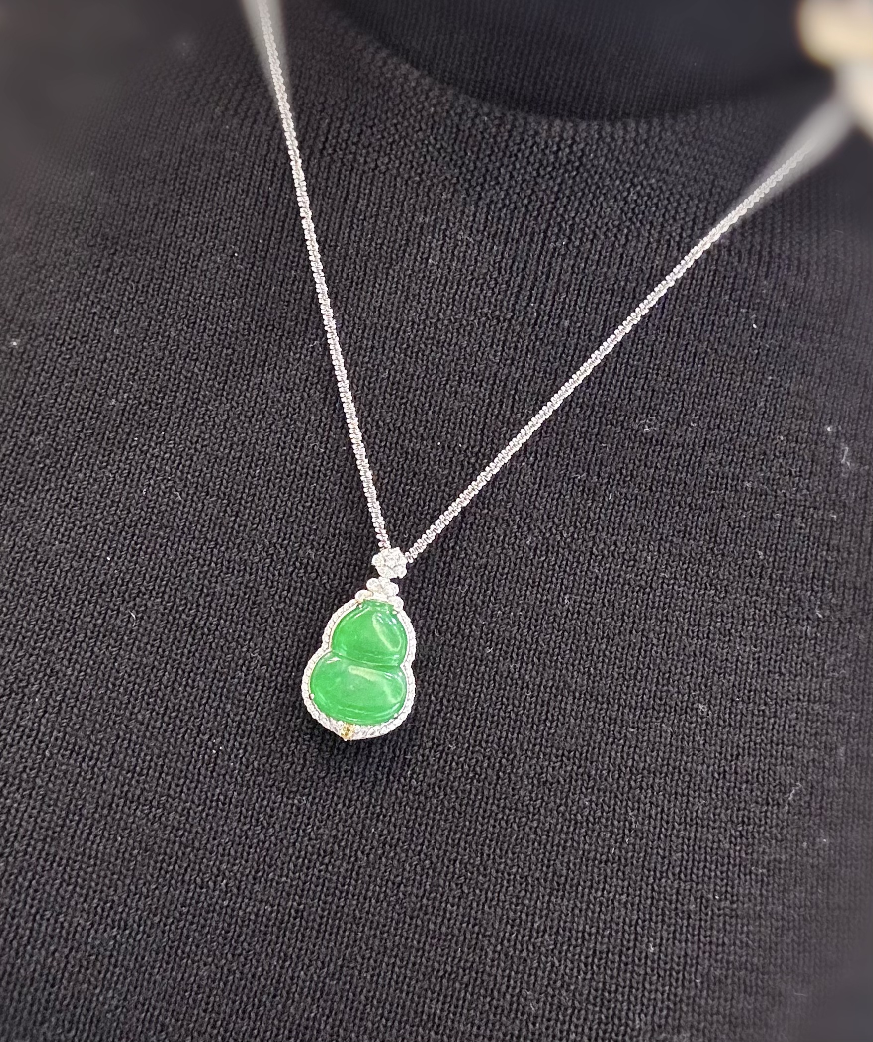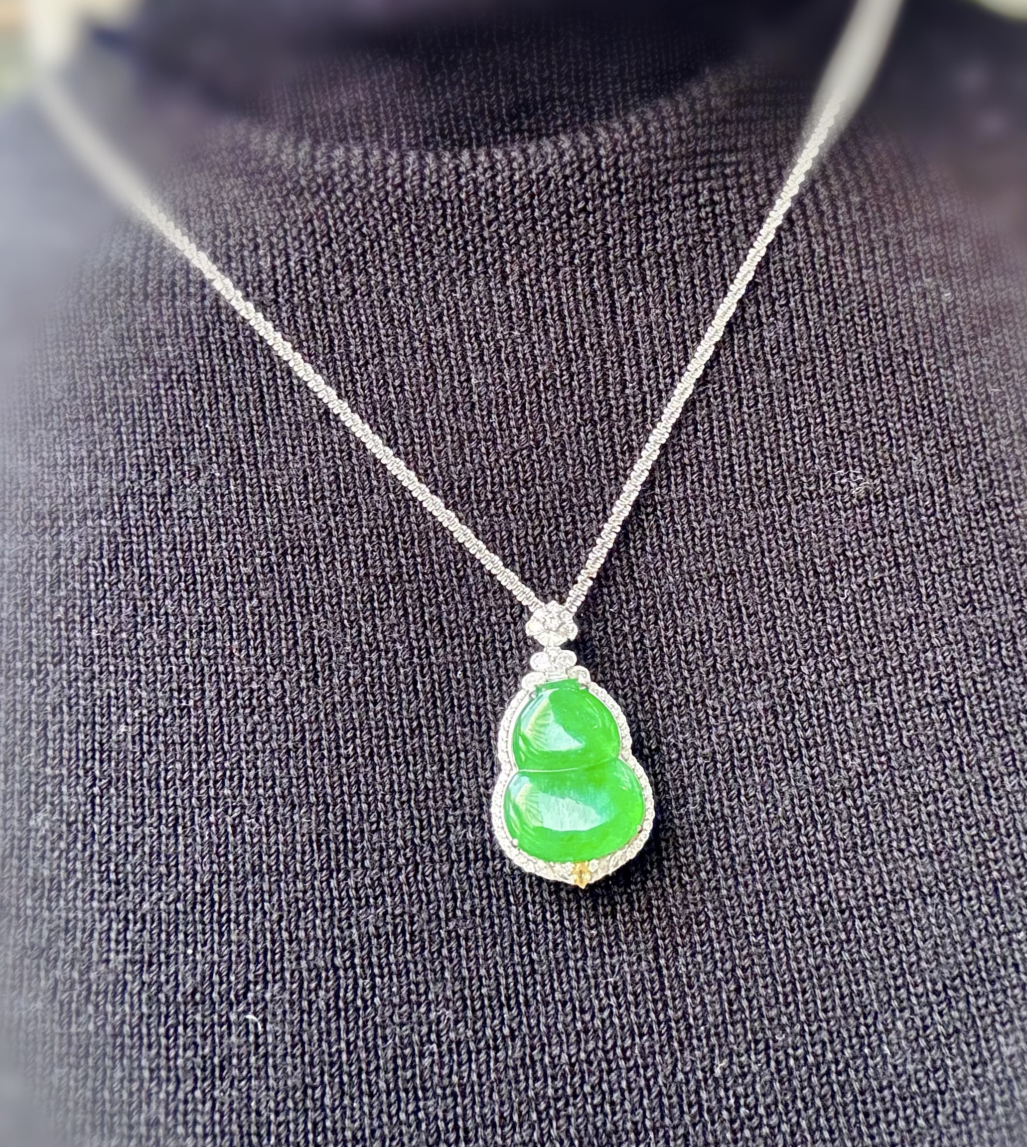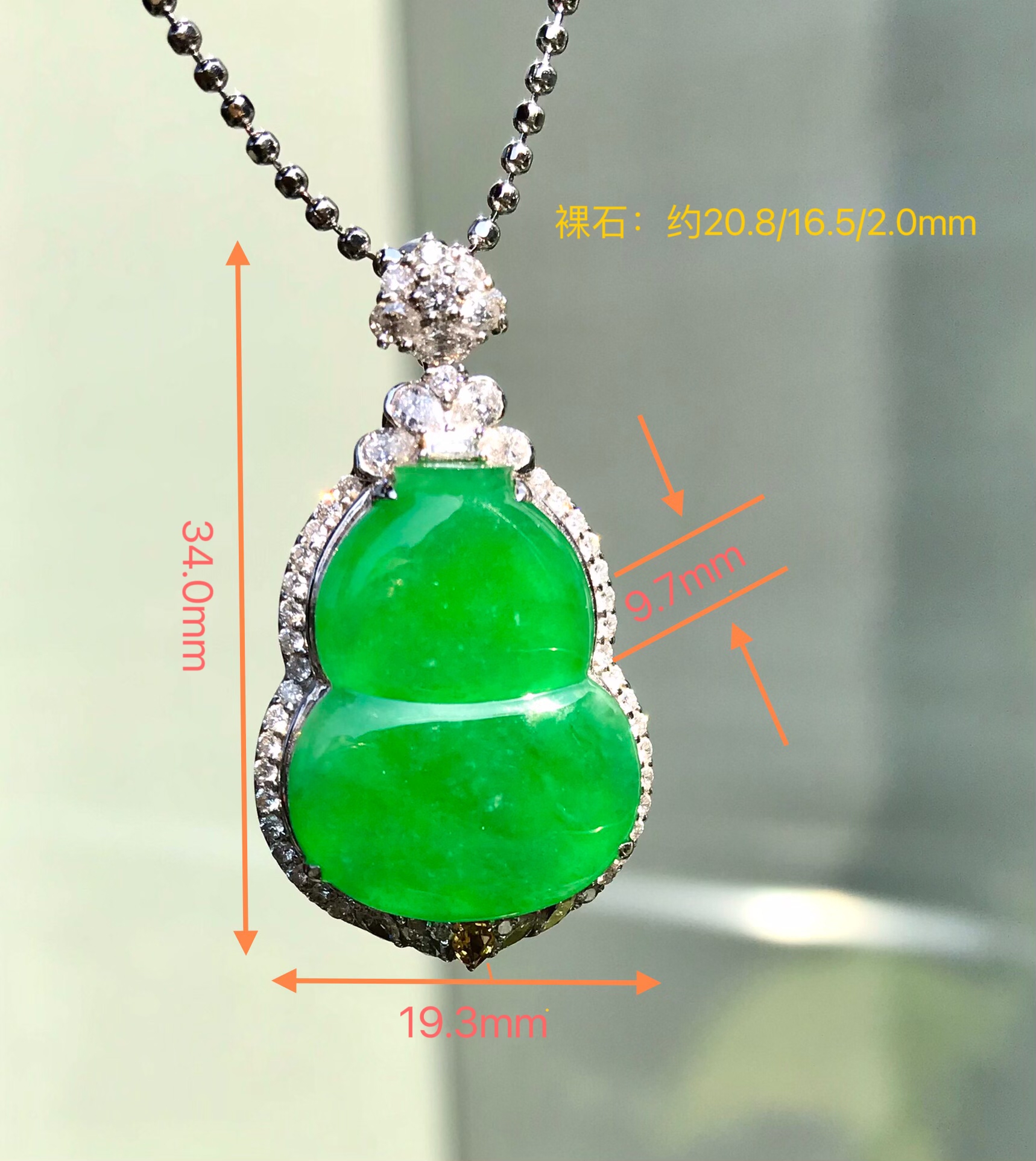 高这件冰地满绿葫芦,牌面特别大,绿光盈盈,种老水足。镶嵌上也是很舍得,高净度钻石包镶,钻石花朵扣头,底部黄宝石加持,奢华贵气;背面白k金可开口式封底托镶,使吊坠显得饱满大气。