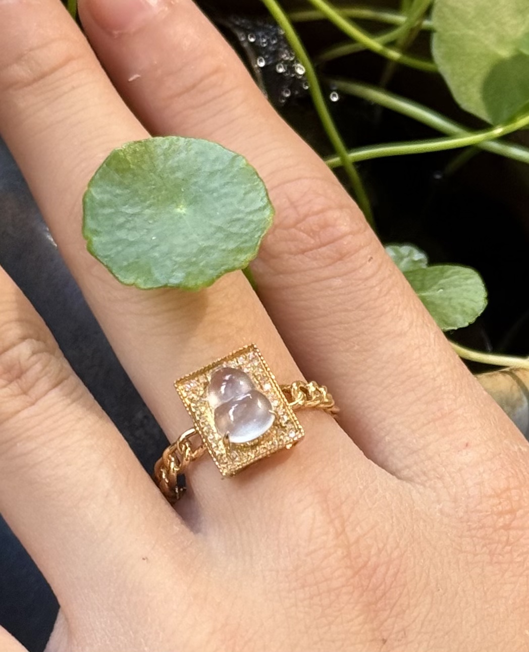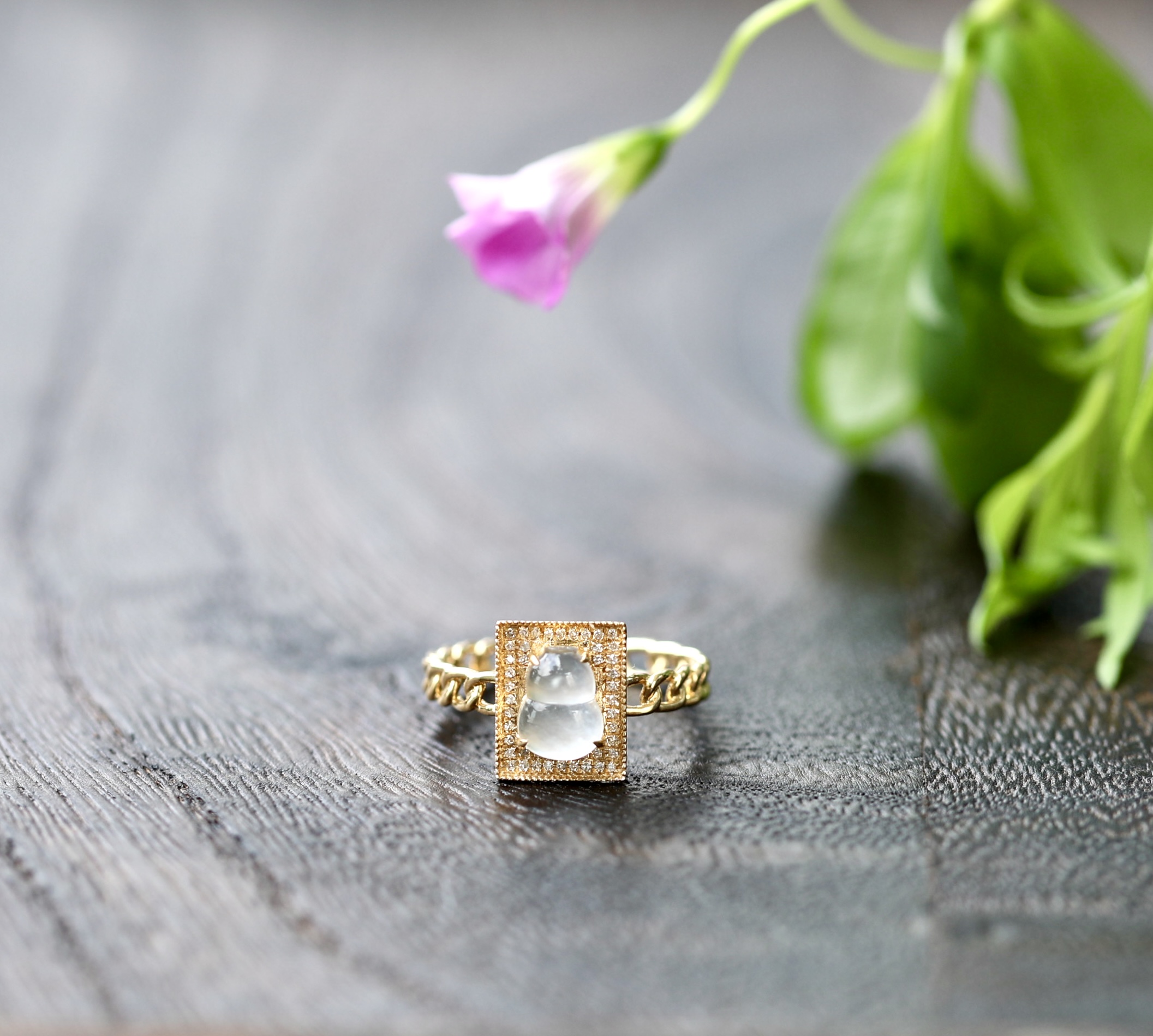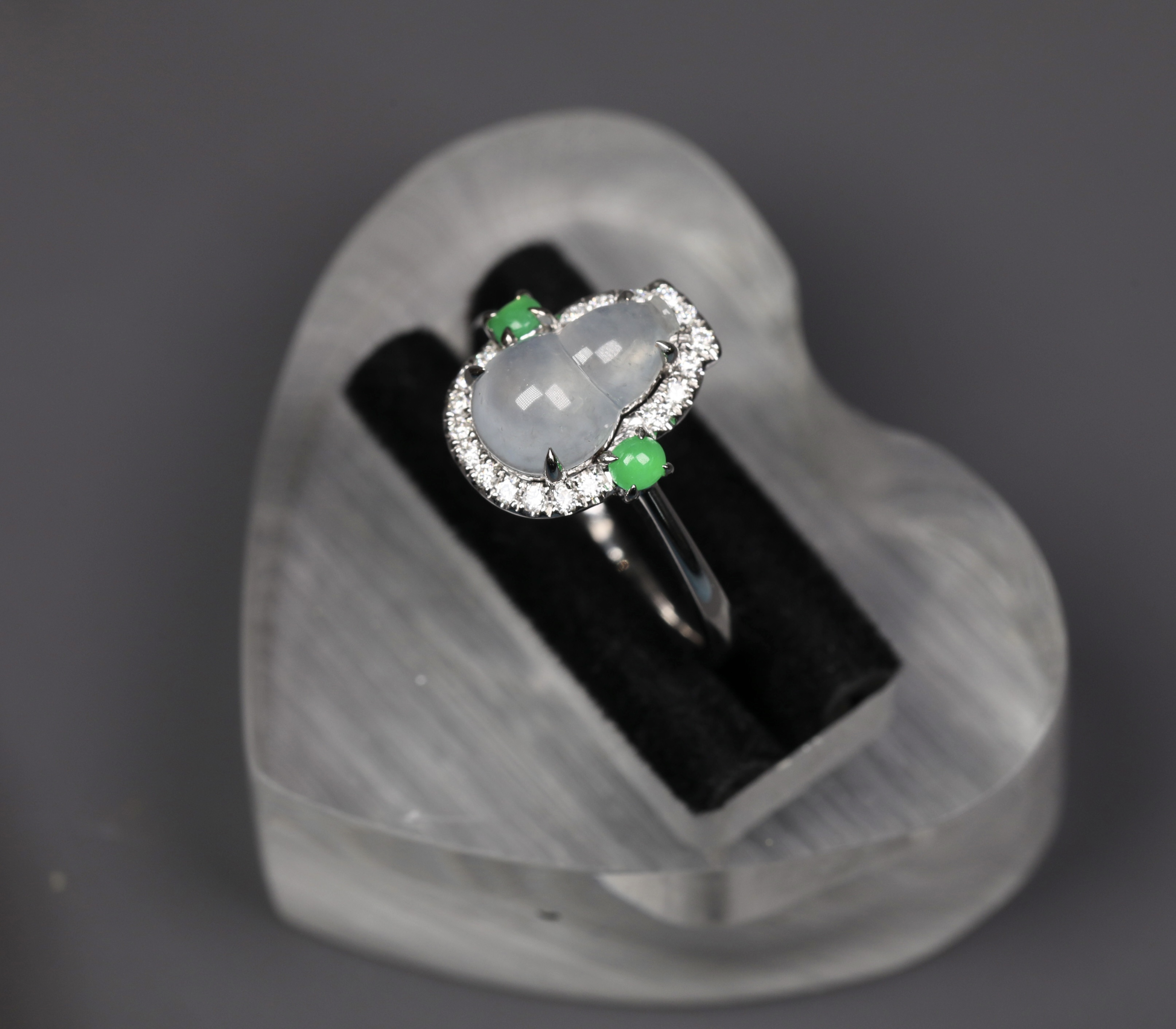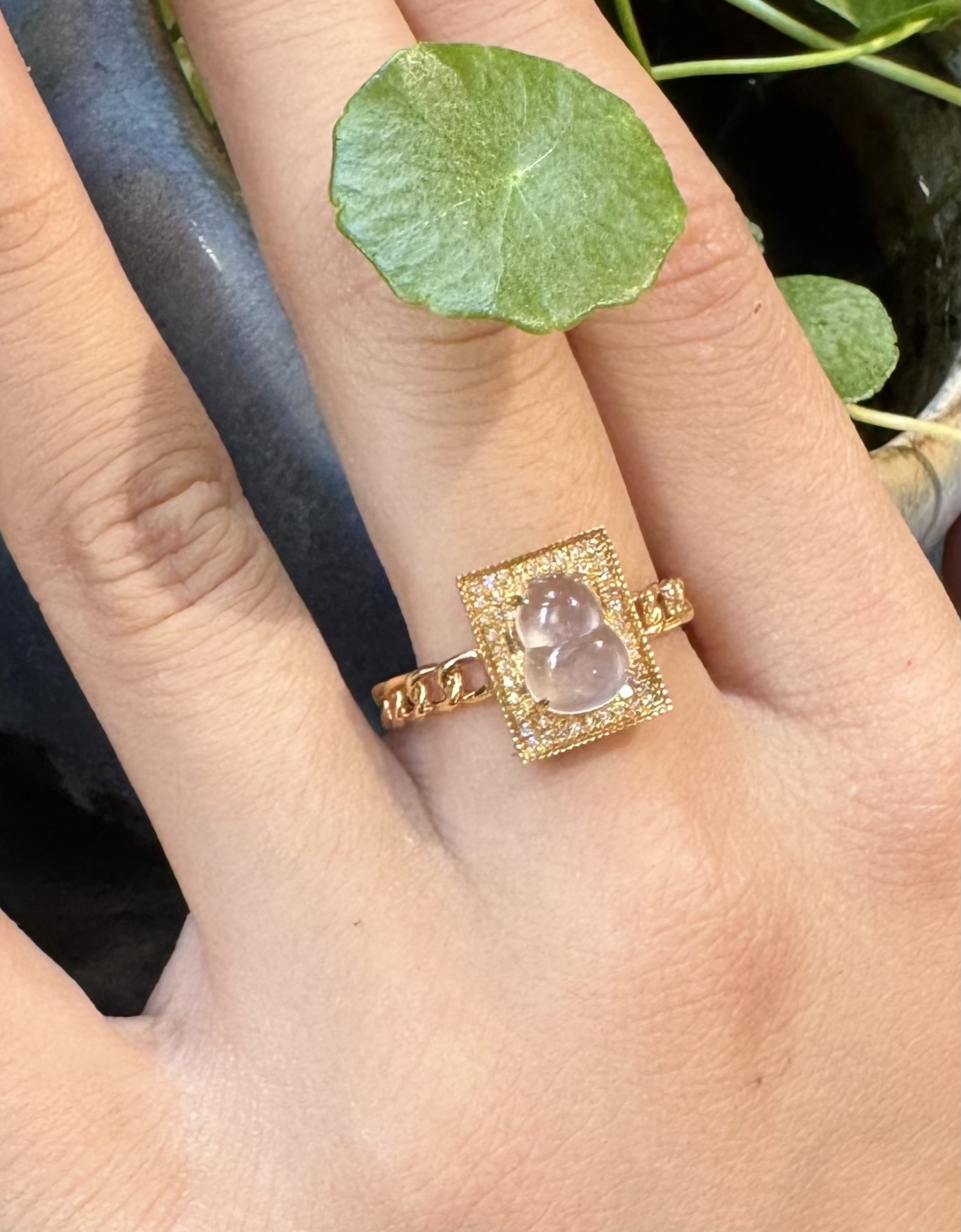 纯净完美的翡翠,雕刻葫芦造型,18K方形底托设计,尽显干练与独特个性。戒臂采用波纹链造型设计,将中国风的翡翠,装点出时尚风!