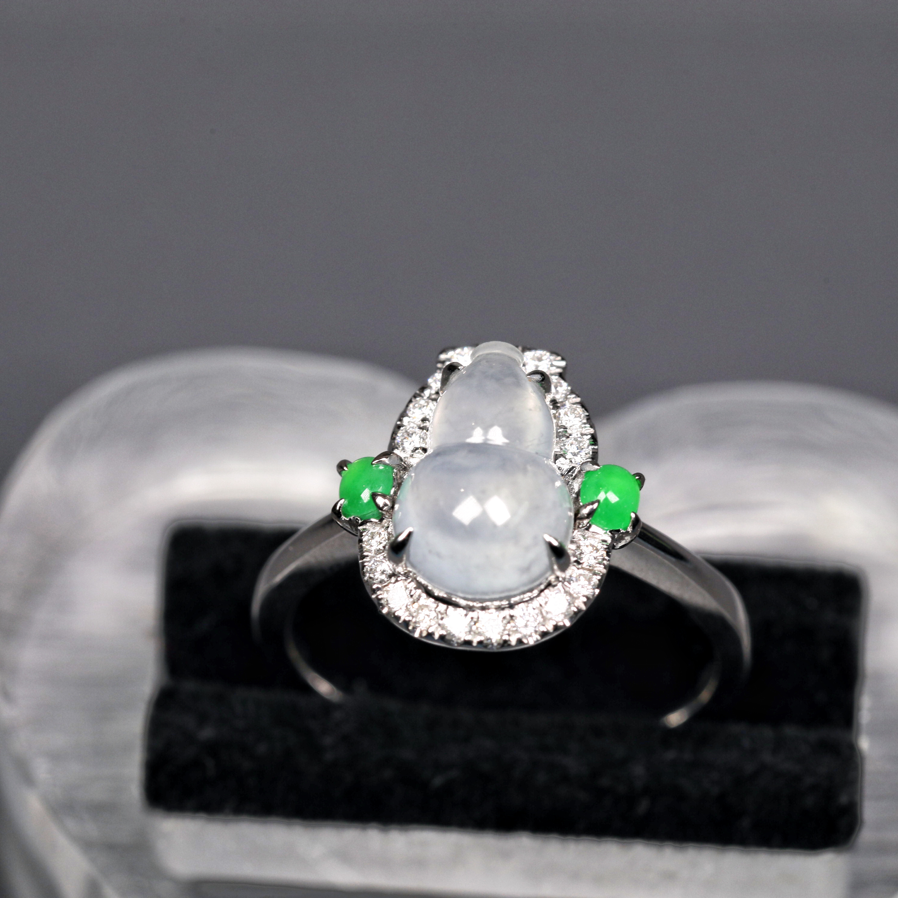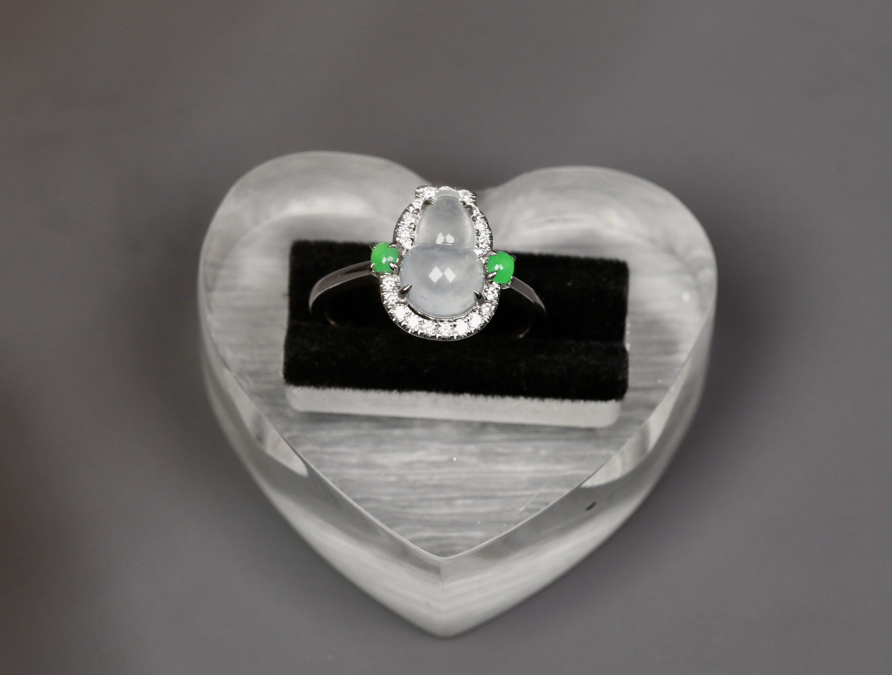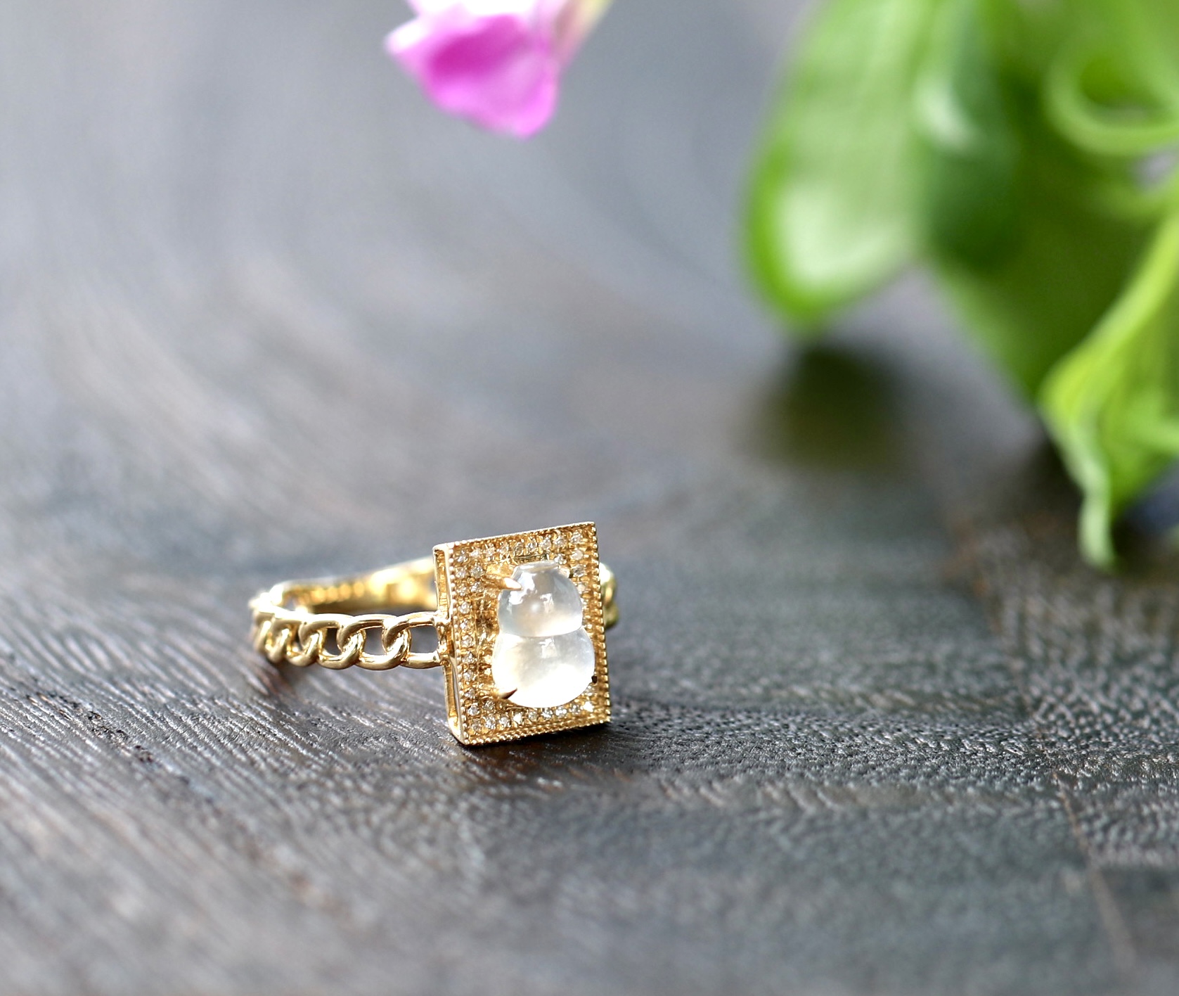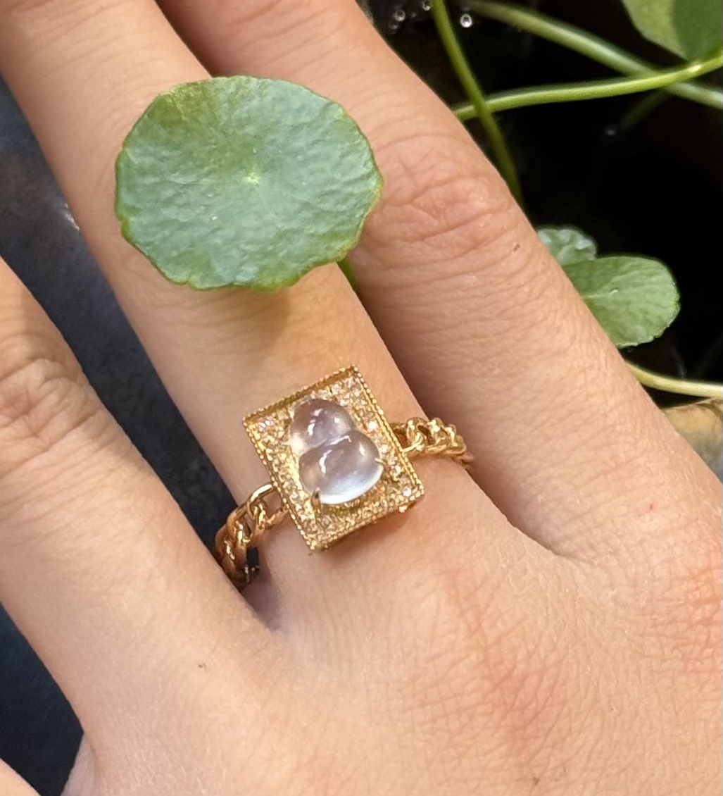 纯净完美的翡翠,雕刻葫芦造型,18K方形底托设计,尽显干练与独特个性。戒臂采用波纹链造型设计,将中国风的翡翠,装点出时尚风!