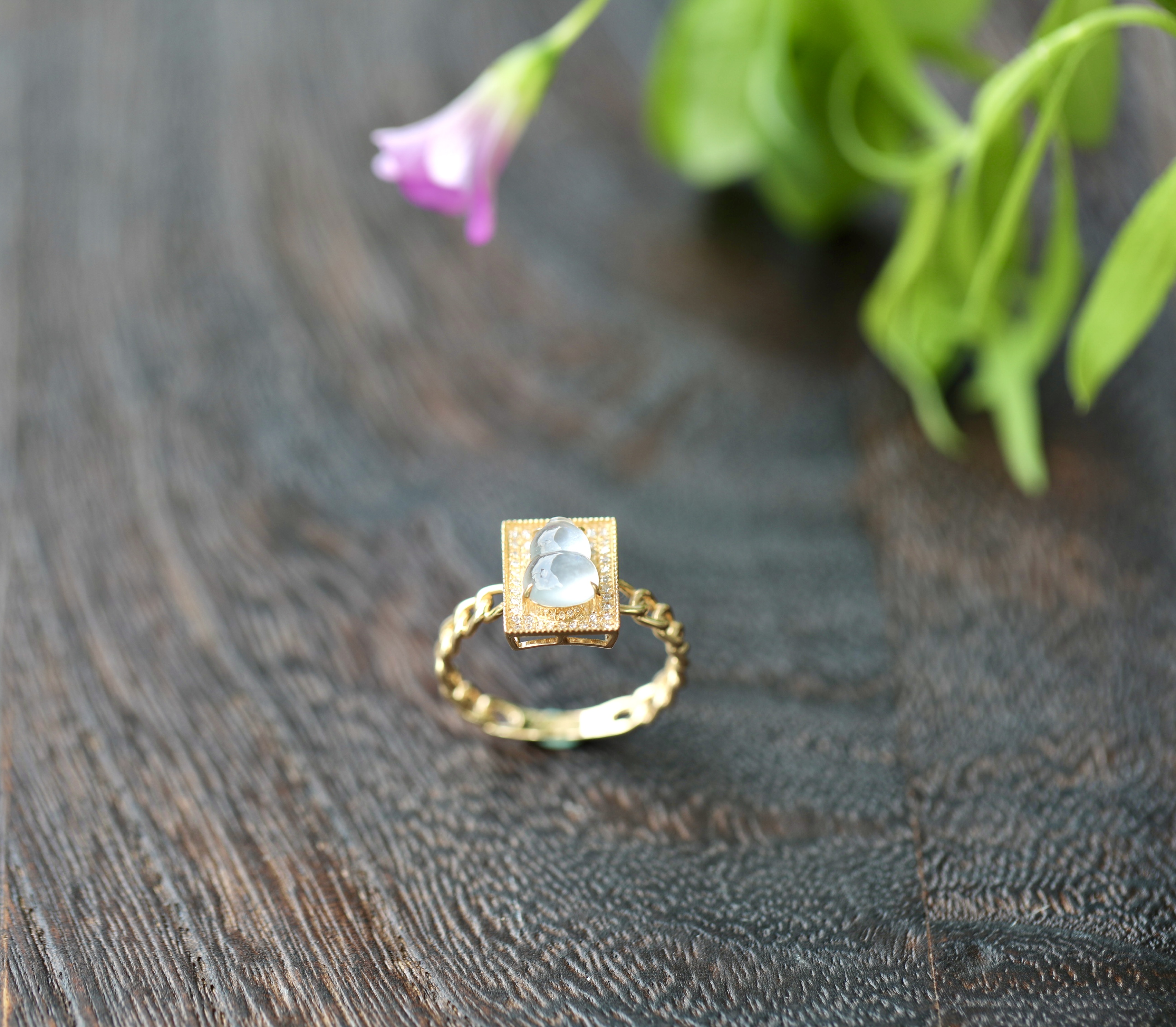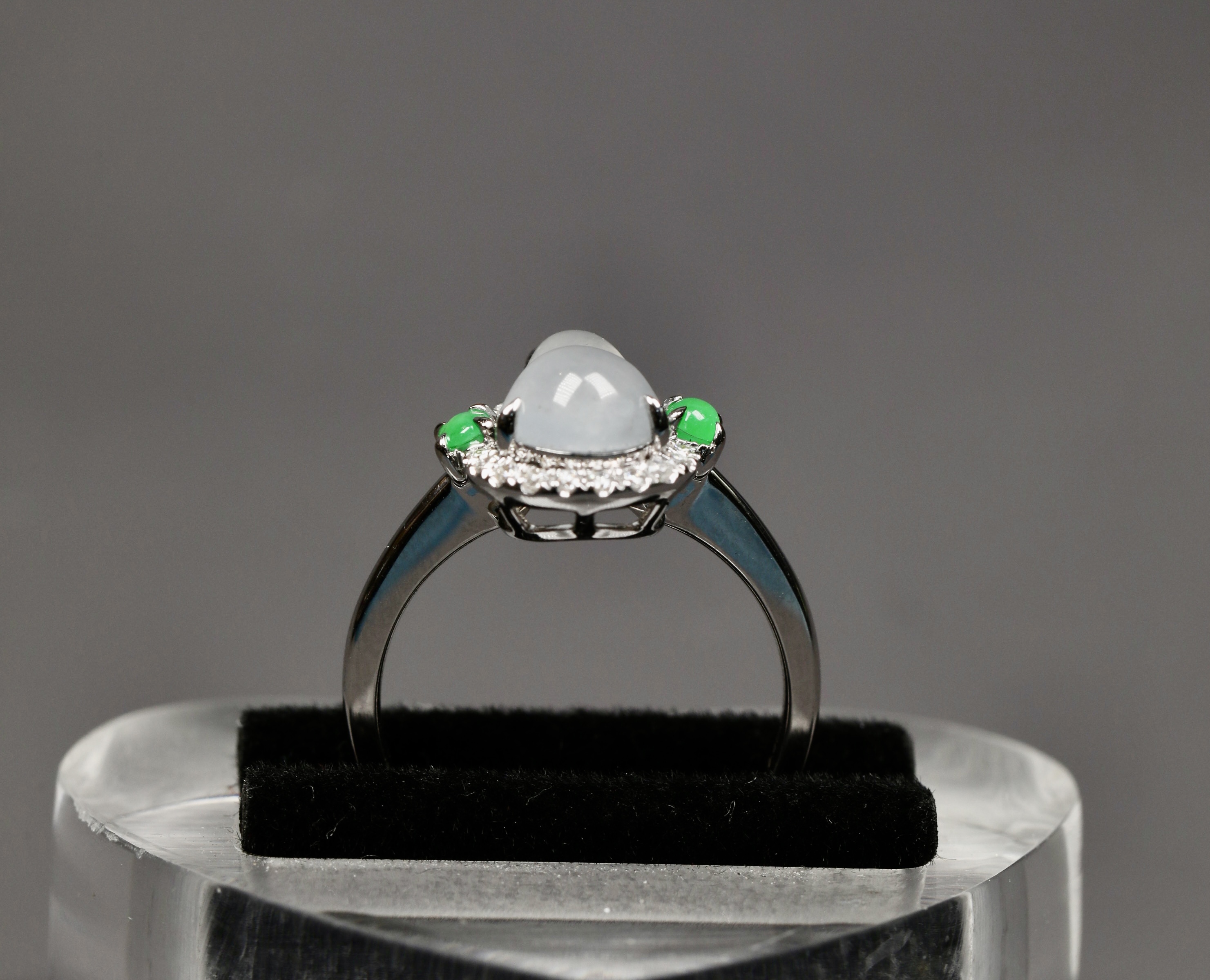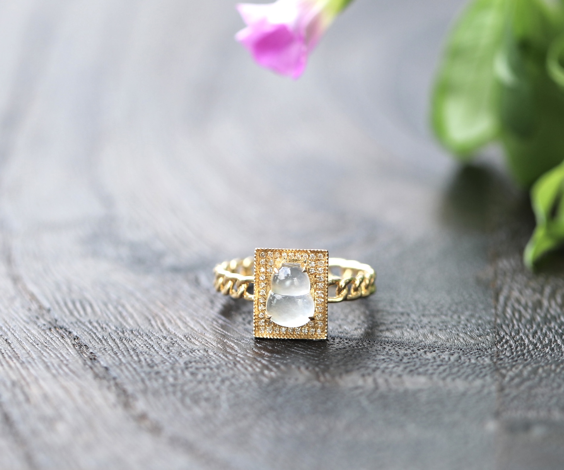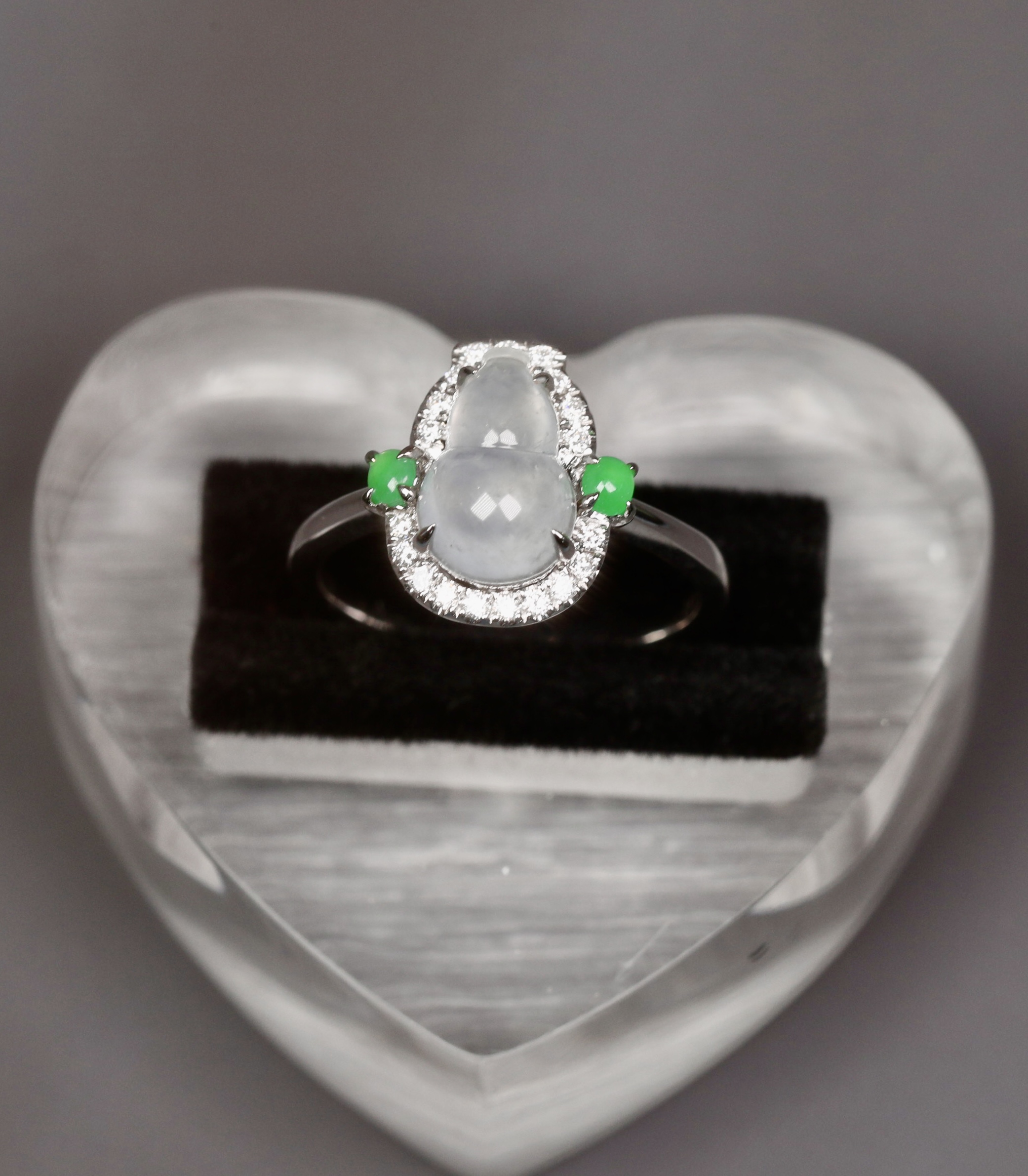纯净完美的翡翠,雕刻葫芦造型,18K方形底托设计,尽显干练与独特个性。戒臂采用波纹链造型设计,将中国风的翡翠,装点出时尚风!