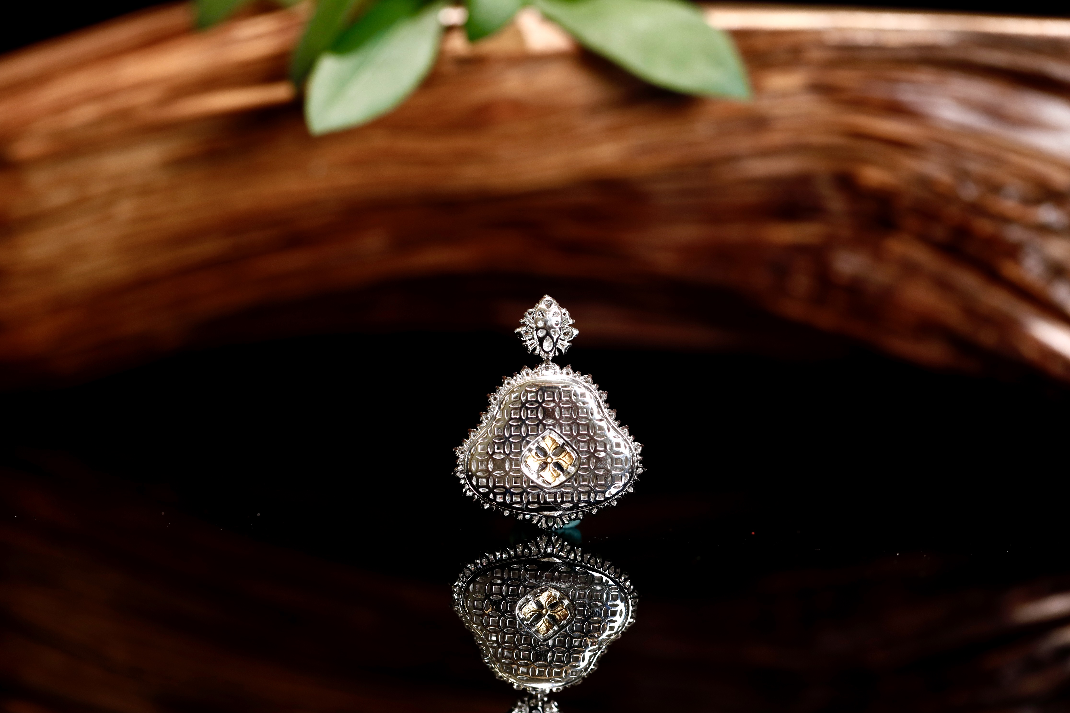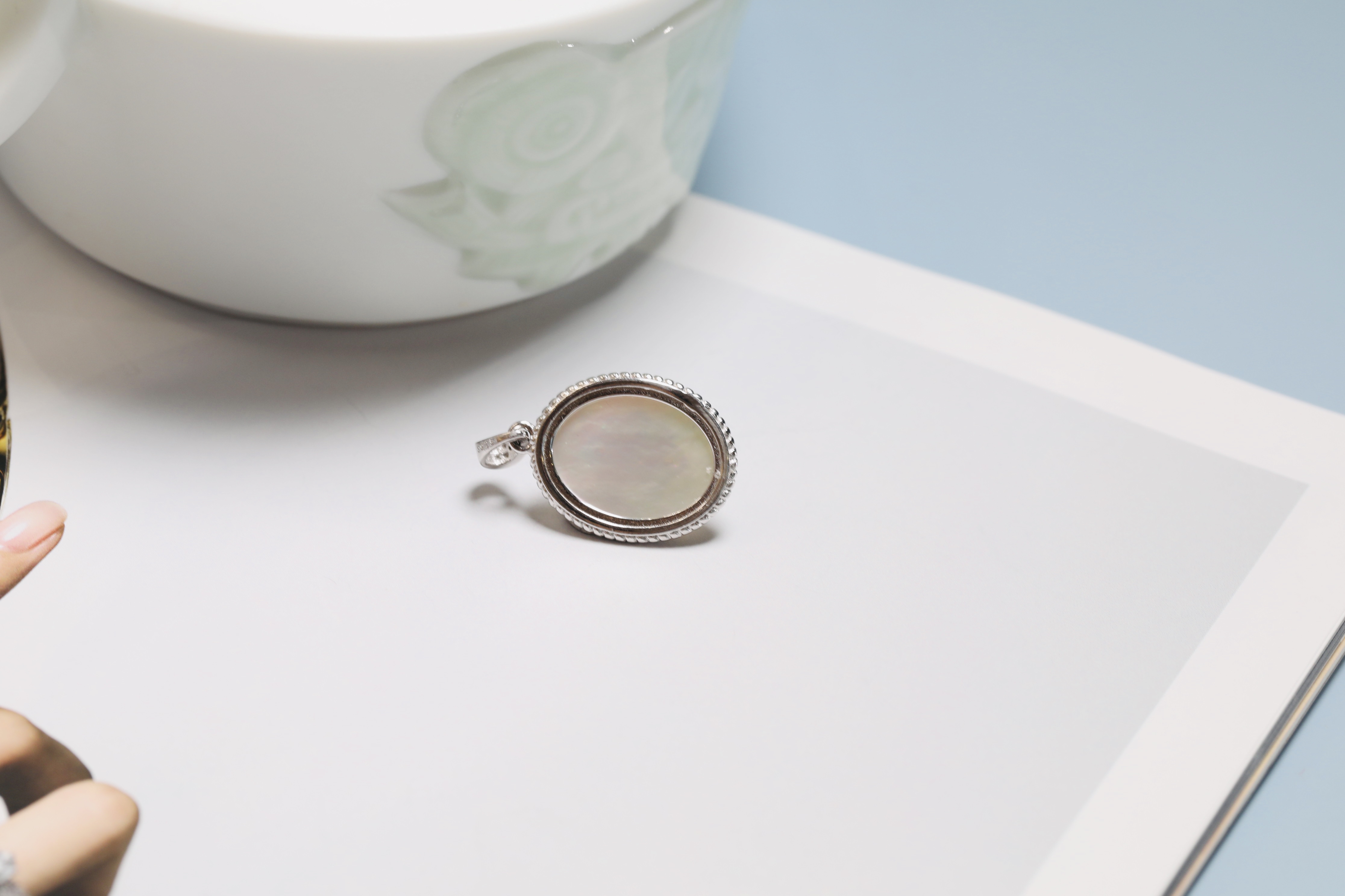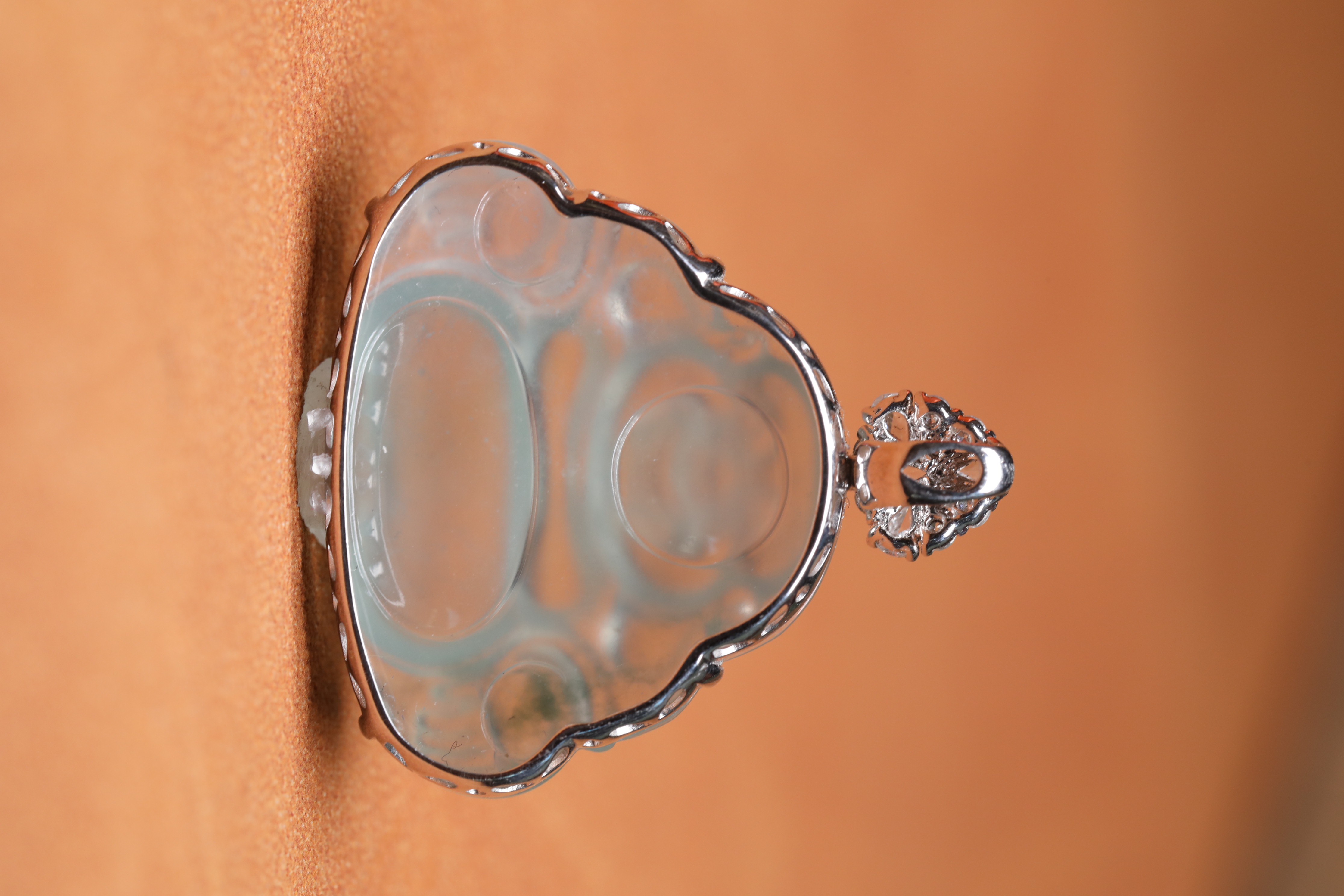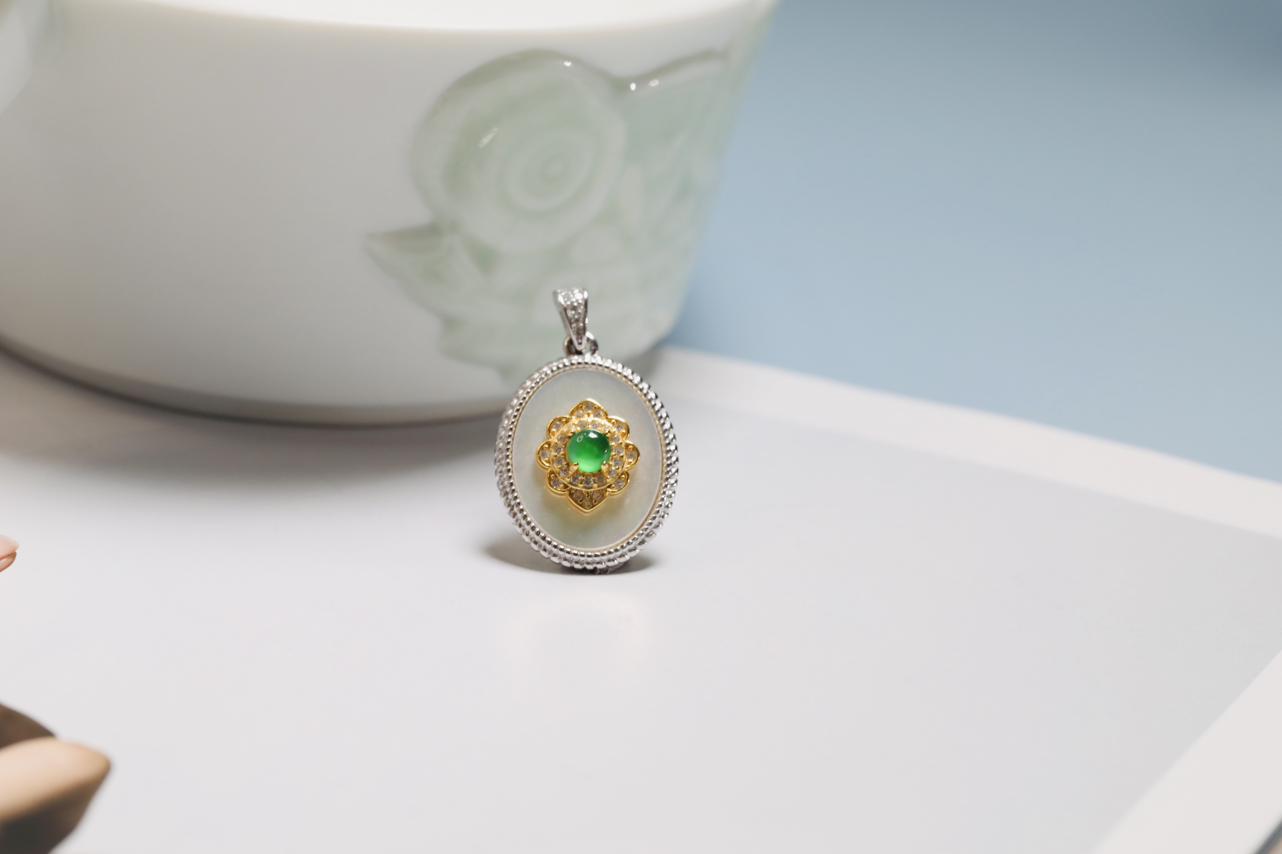翡翠贝母吊坠结合了翡翠和贝母两种材质的首饰,具有独特的美感和文化寓意。翡翠象征着吉祥、平安和富贵,常被用作护身符或传家宝。贝母是一种来自贝壳内层的天然材料,具有珍珠般的光泽和独特的虹彩效果,象征着纯洁、智慧和保护。材质以银镶嵌,翡翠作为主石,贝母作为背景,两者相辅相成,形成鲜明的对比和层次感,具有独特的视觉效果。