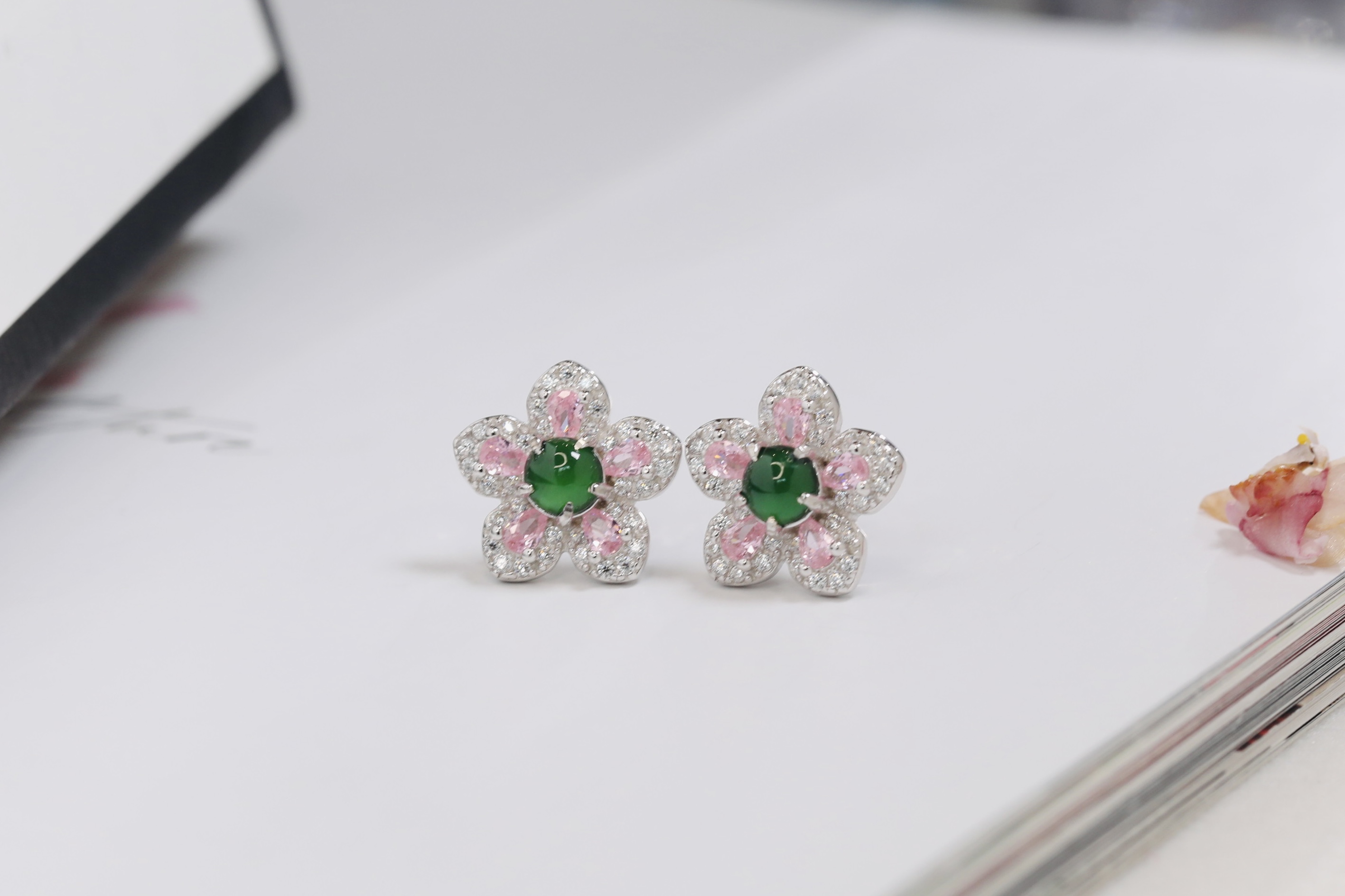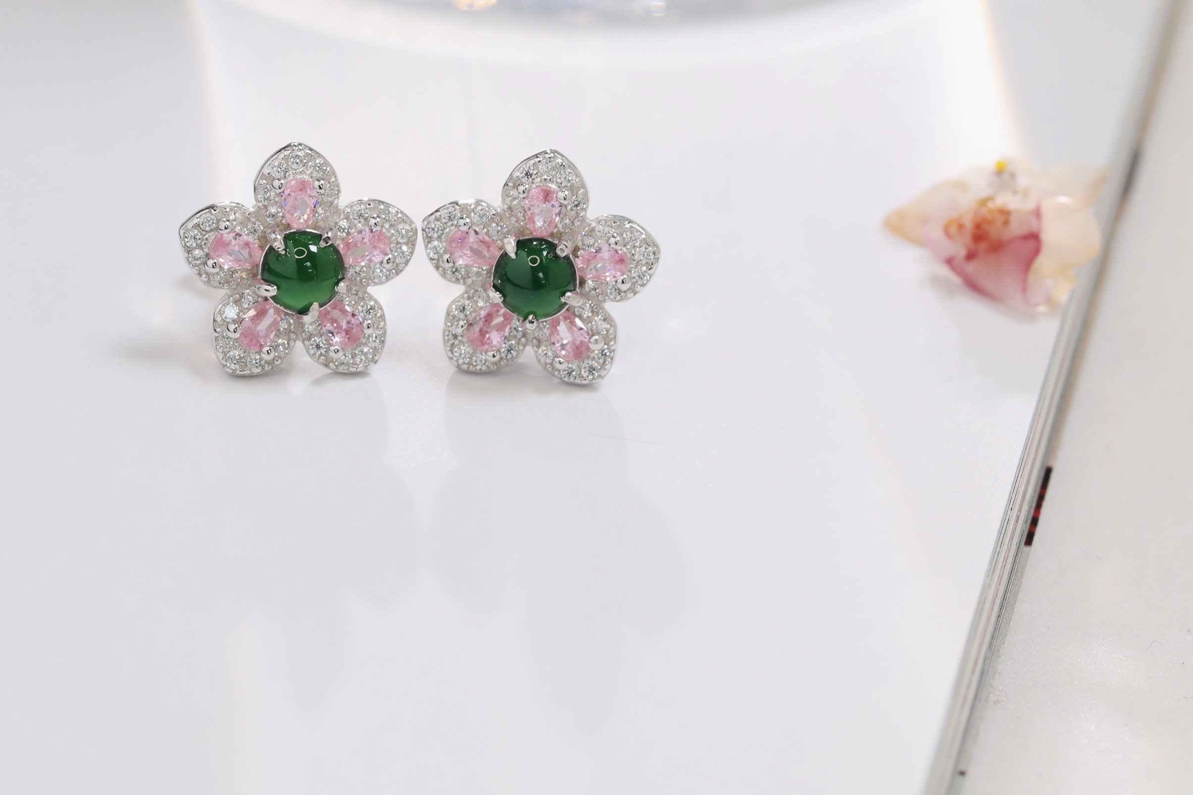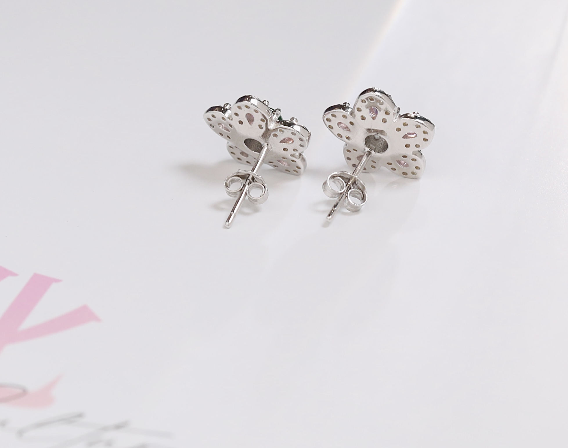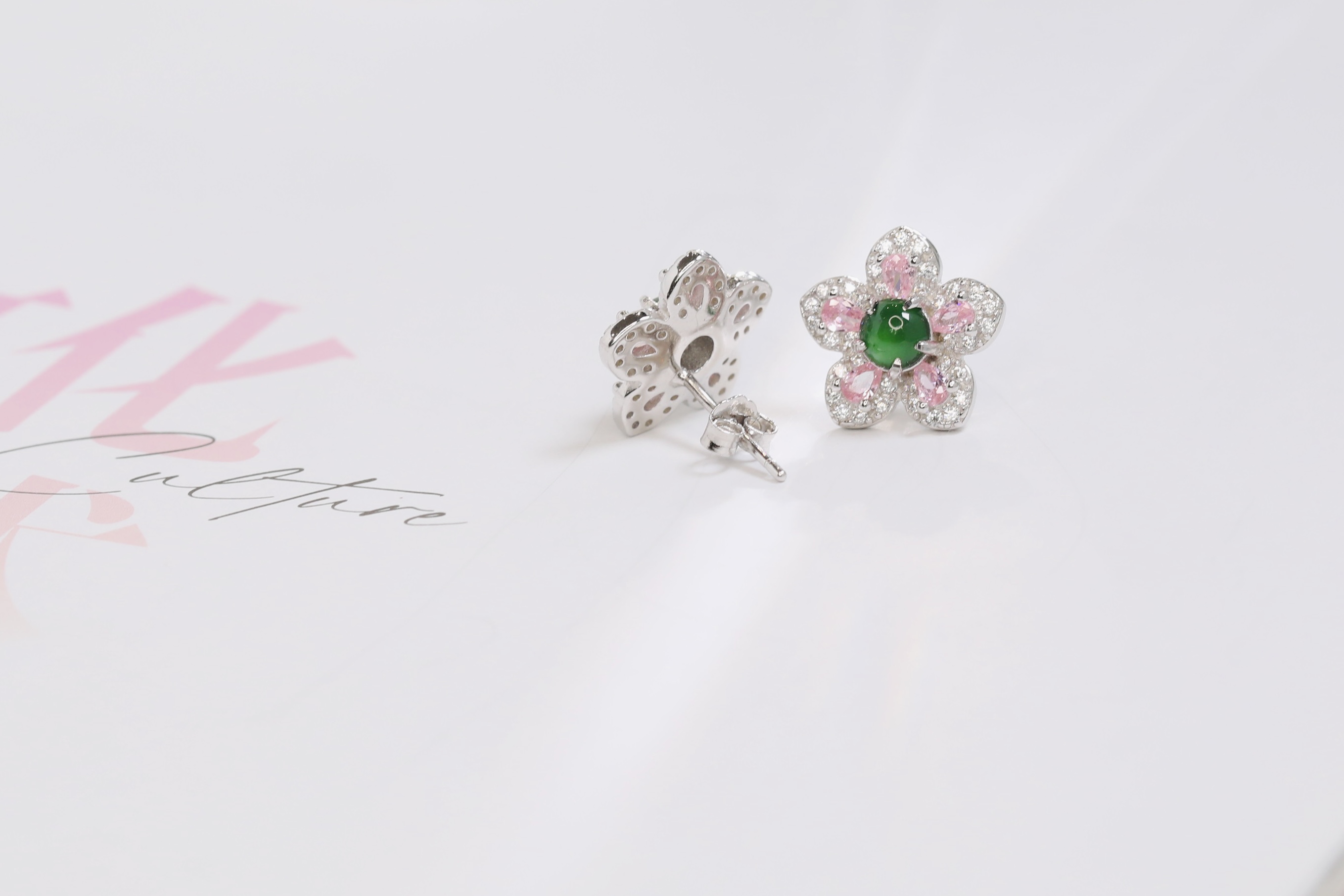 耳钉以银镶嵌粉锆石点缀花瓣,增加耳钉的闪耀感并与桃花主题相得益彰,戴上非常浪漫与优雅。