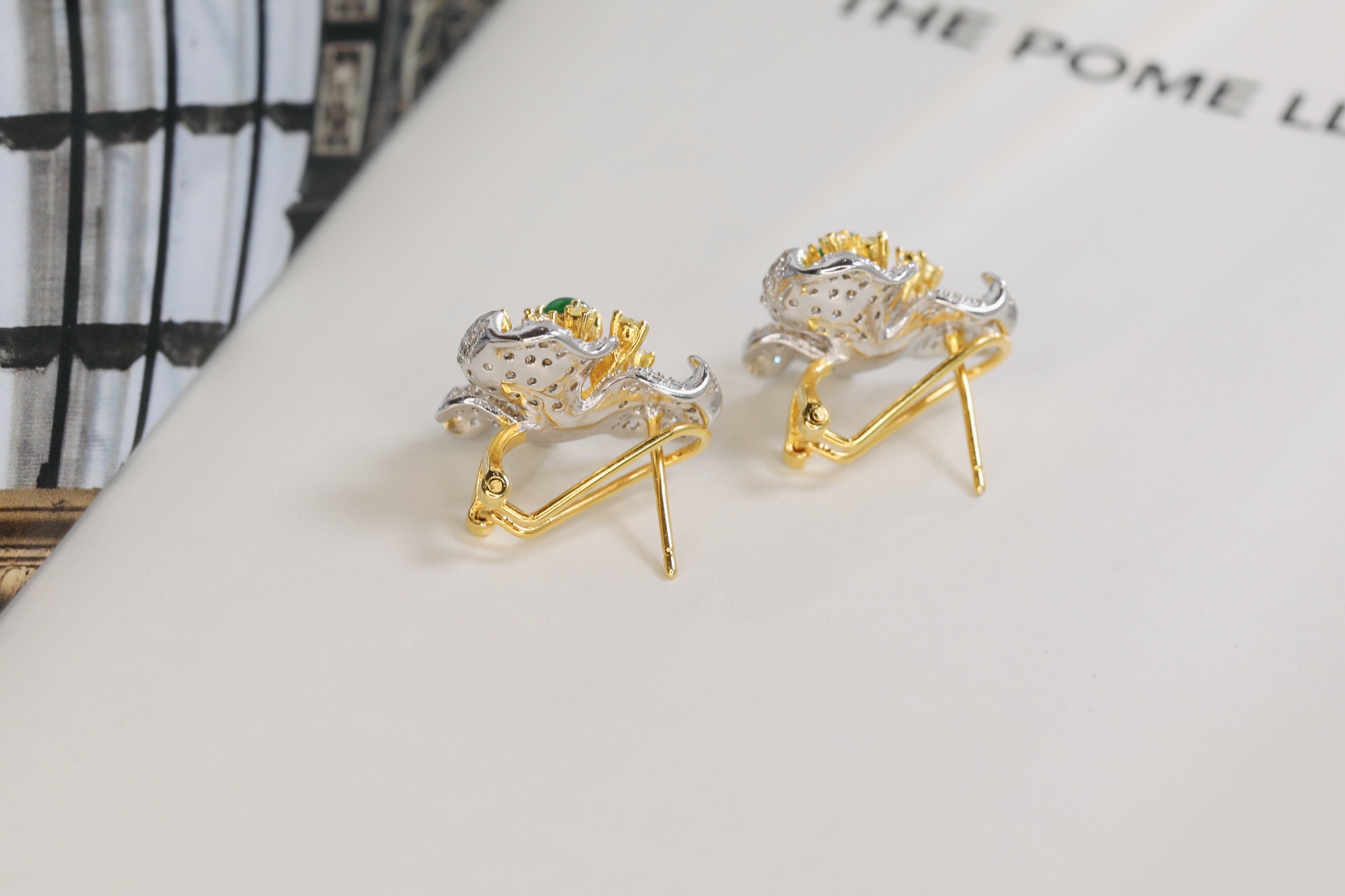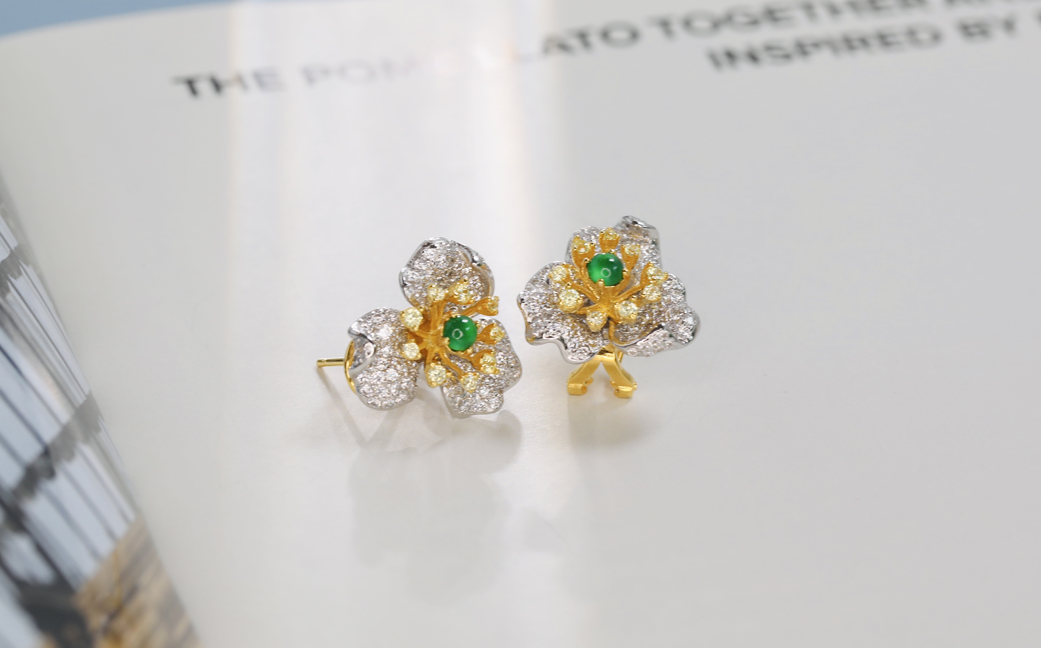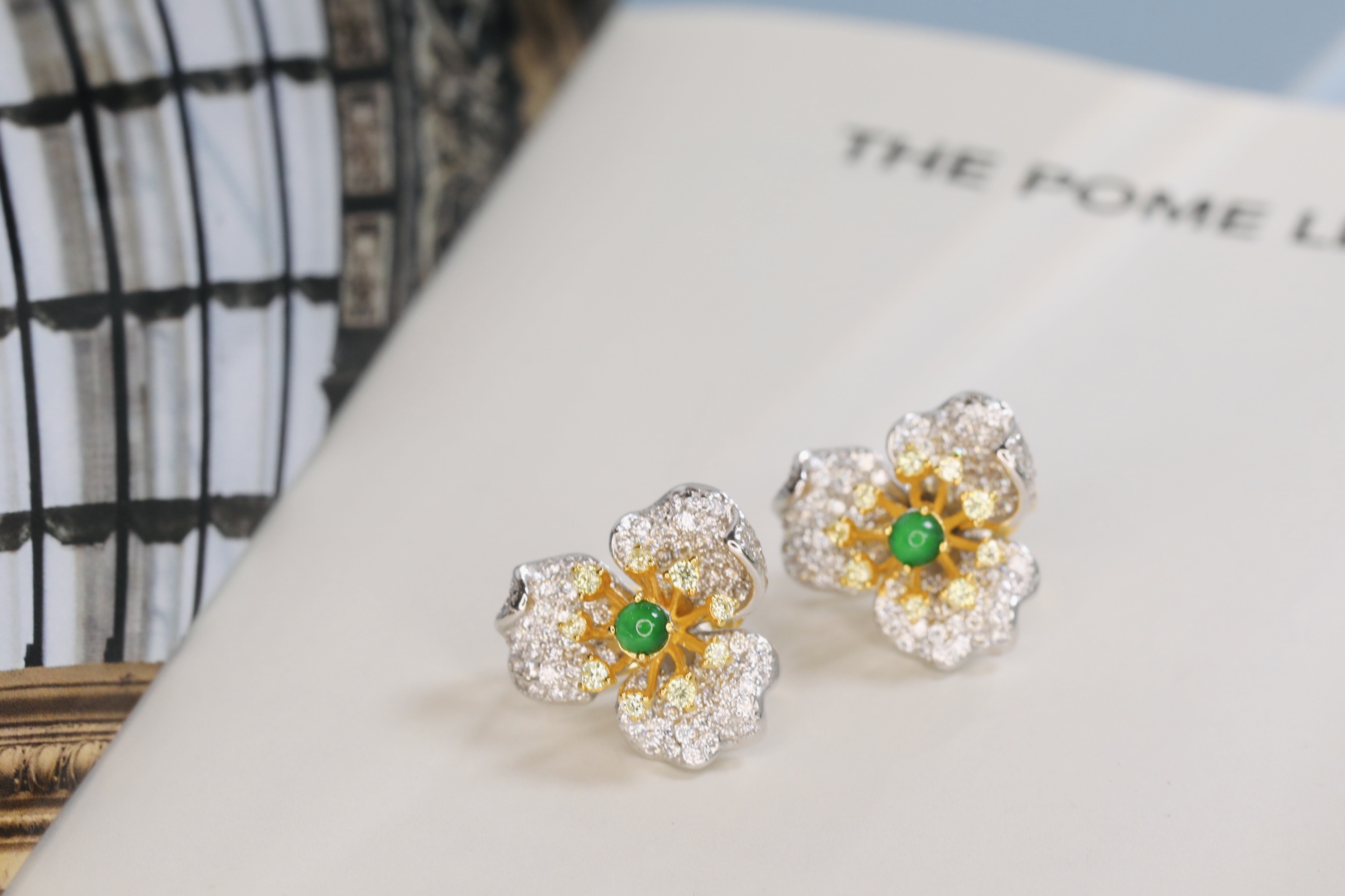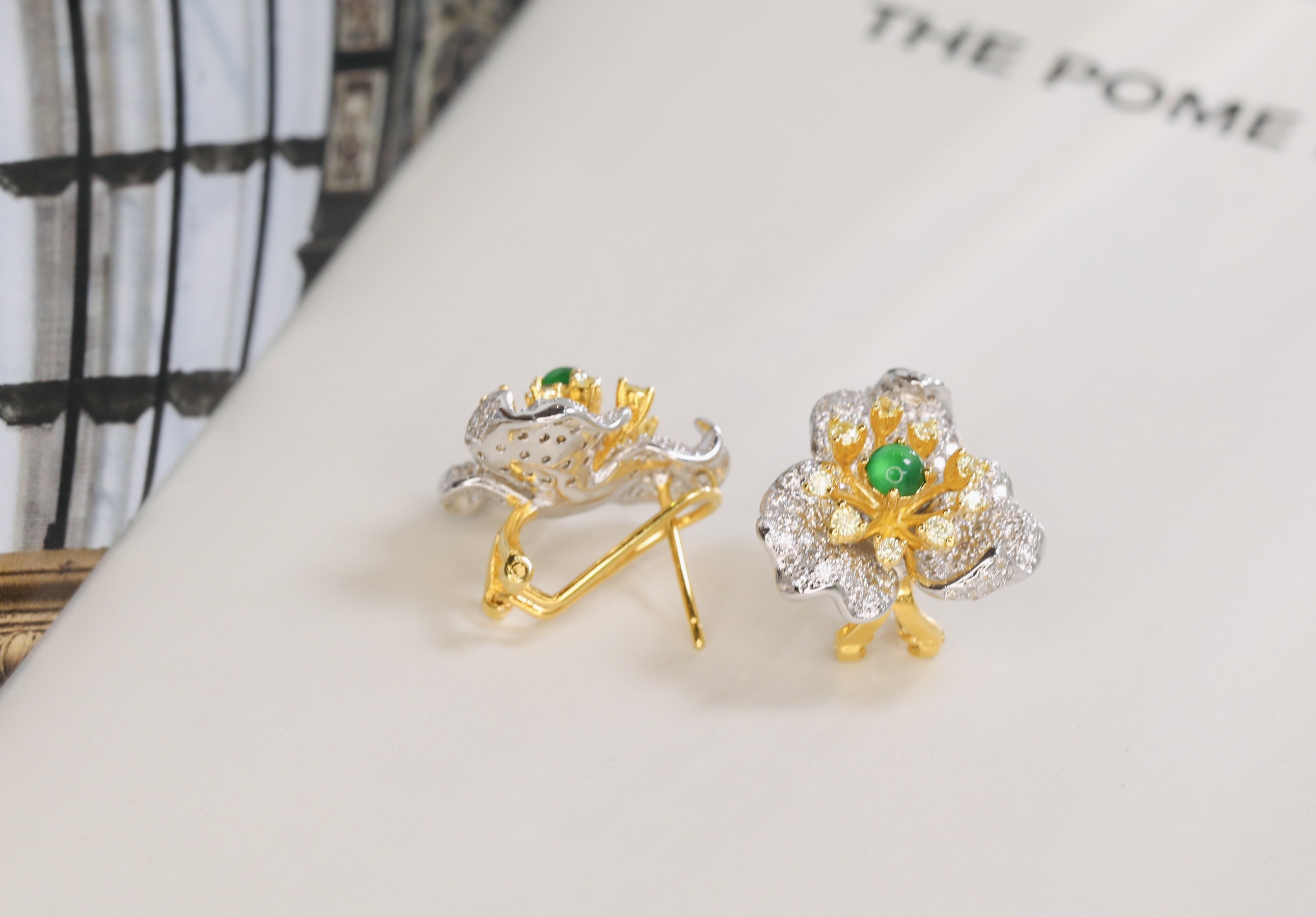 繁花耳钉以立体绽放的花朵,花瓣层层叠叠,栩栩如生,仿佛一朵正在盛开的鲜花,充满了生机与活力,中央镶嵌的翡翠,闪耀着迷人的光芒,法式优雅风格,既浪漫又高贵。