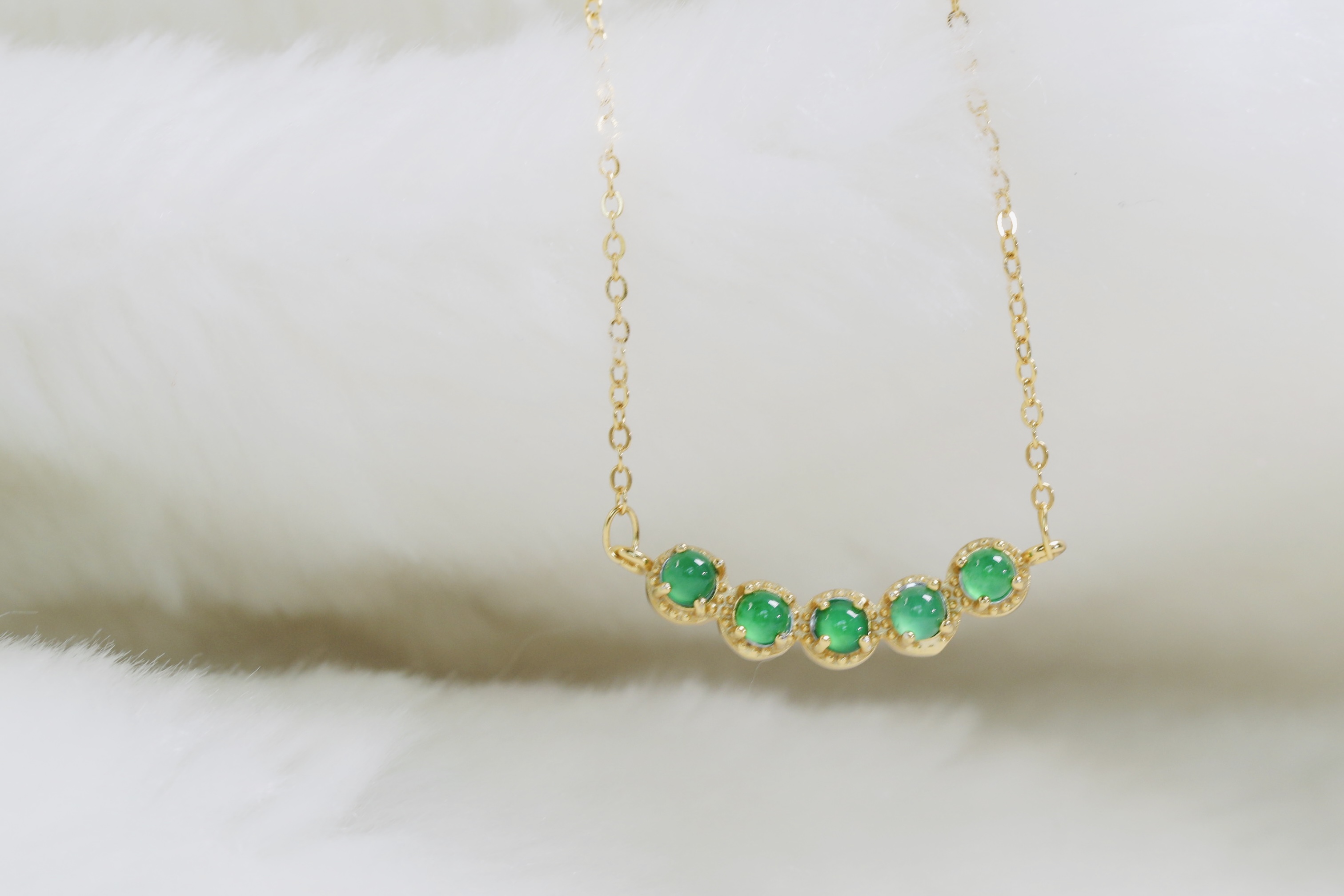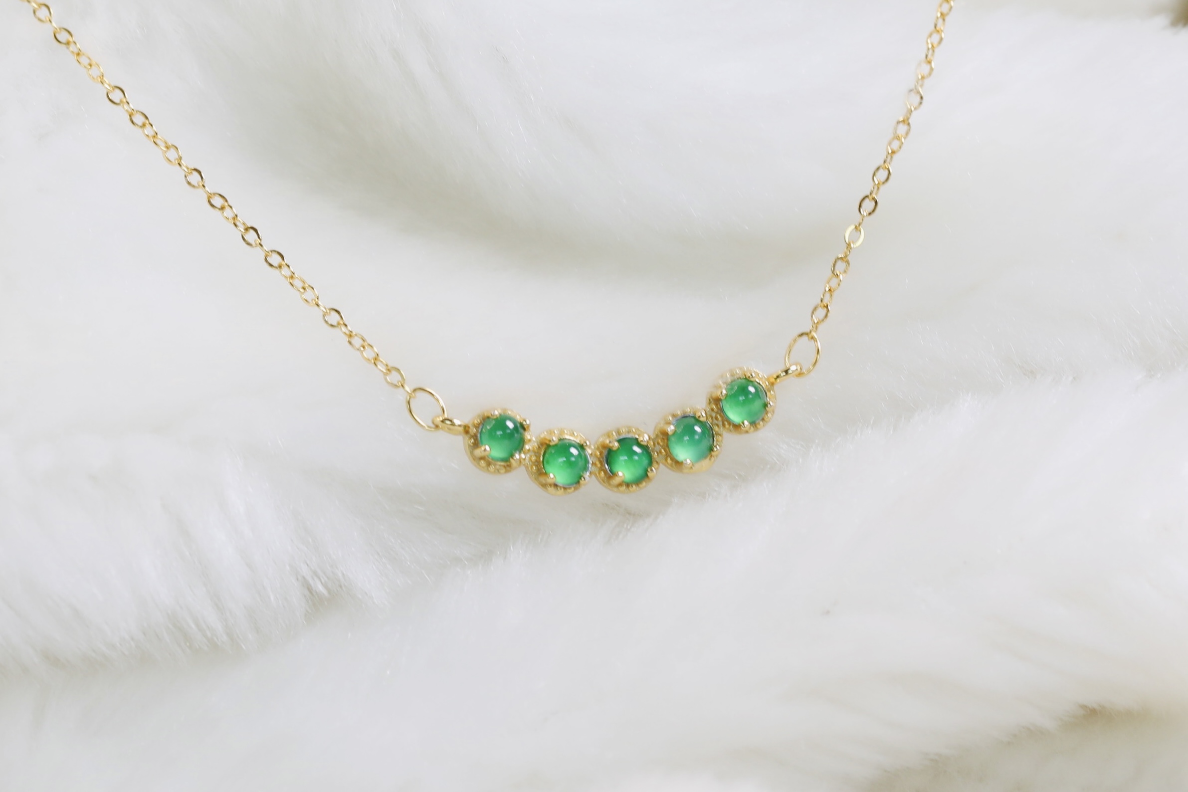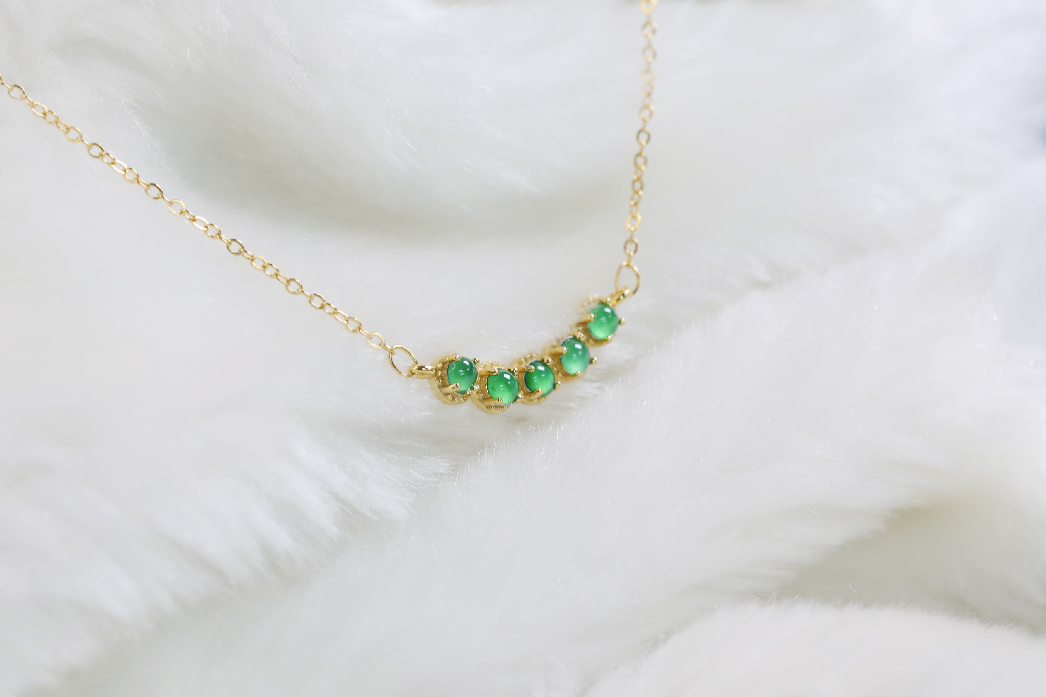 五福临门小蛋面套链是一款融合了传统文化与精致工艺的珠宝饰品,以翡翠为核心材质,采用925银镶嵌,翡翠晶莹剔透,质地细腻、颜色均匀,展现翡翠的天然美感,蛋面切割圆润光滑、饱满,象征圆满与和谐,搭配五福元素,传递吉祥如意的美好祝愿。