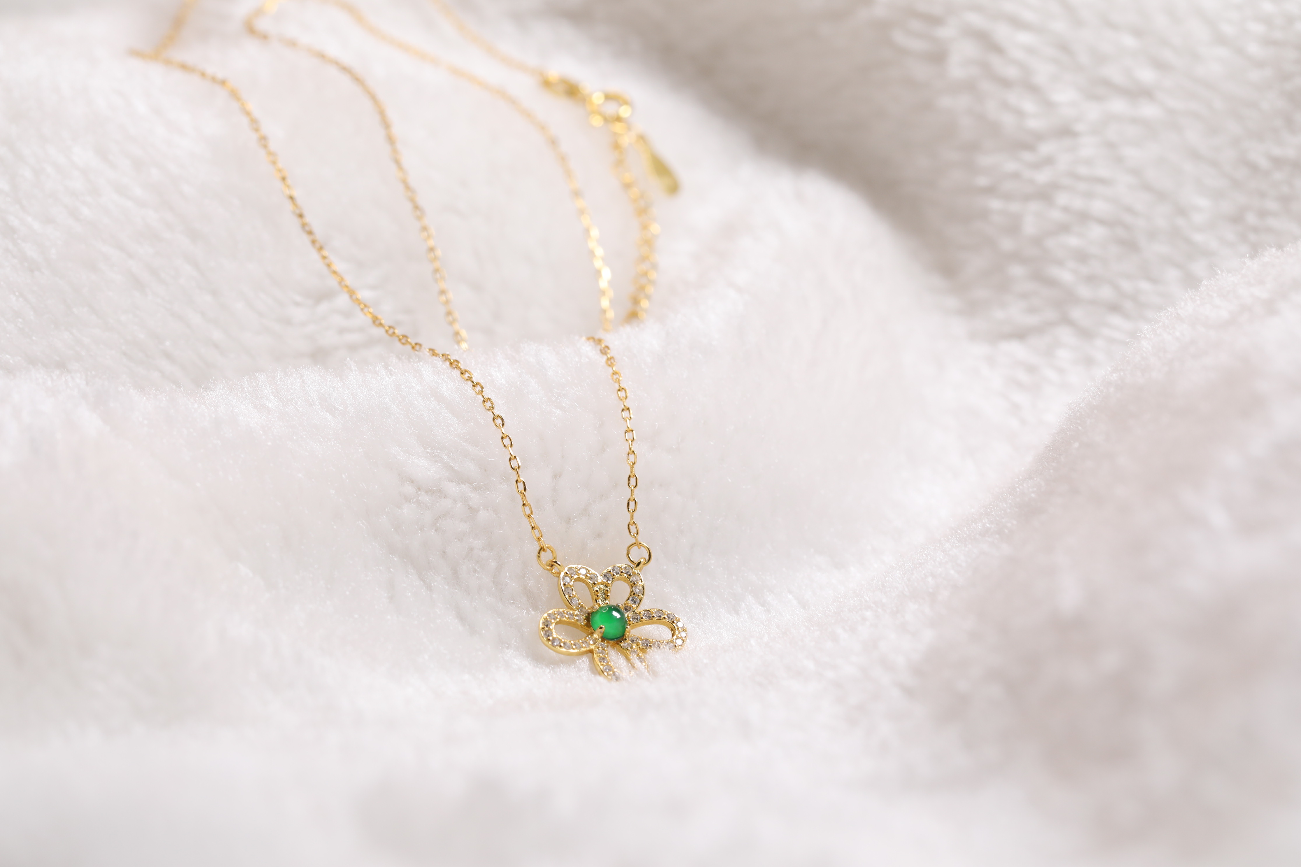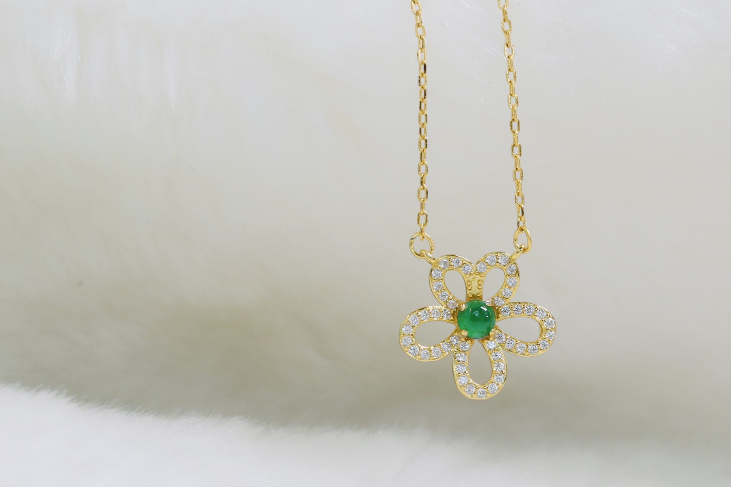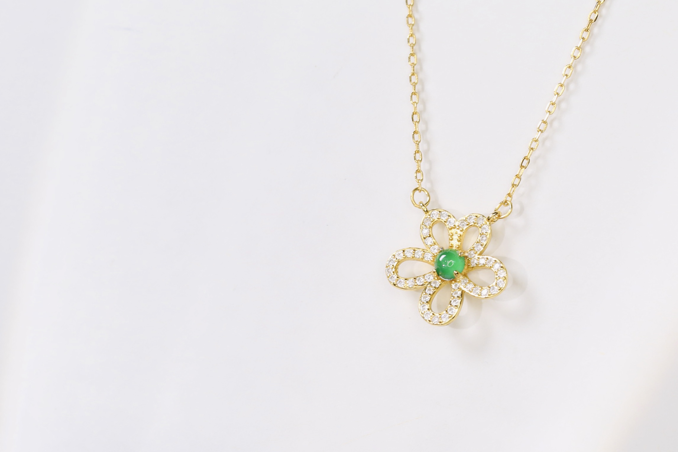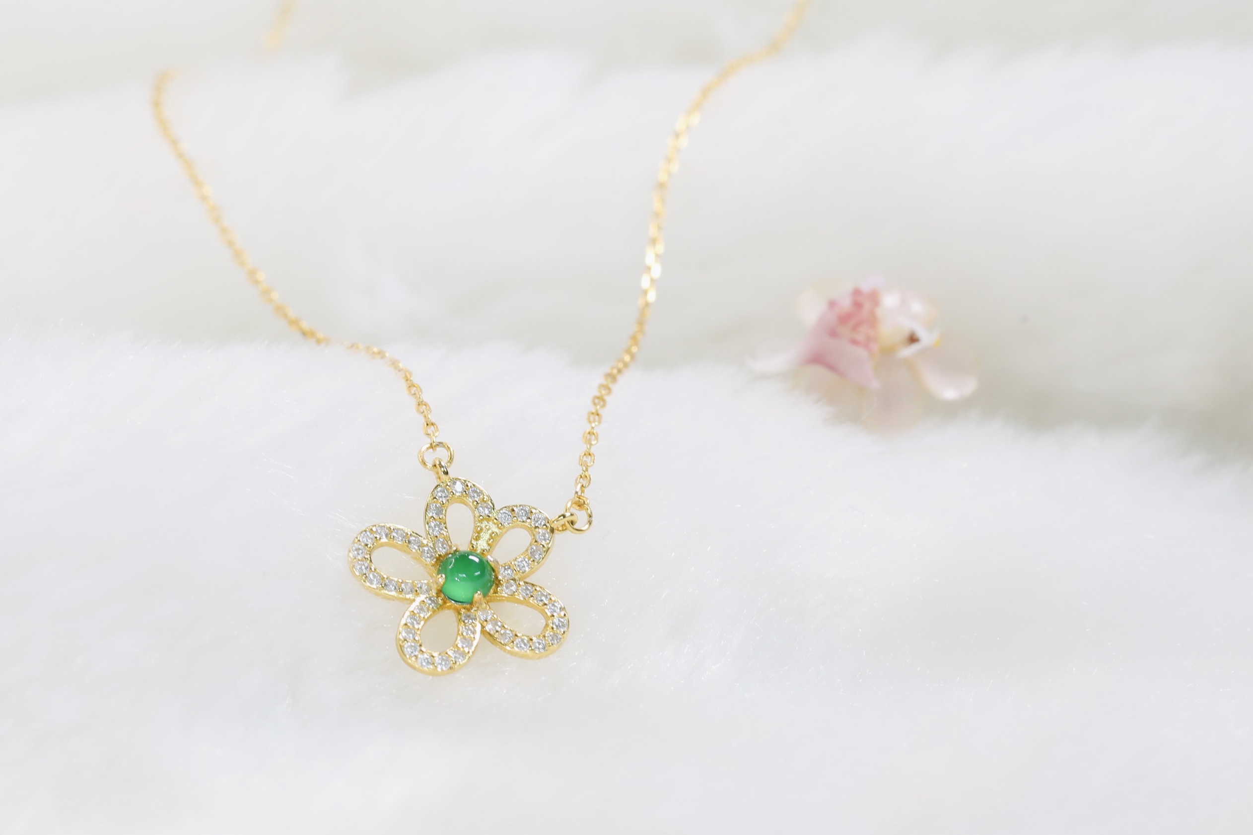 一路生花锁骨链设计精美,以花朵自然元素为设计灵感,寓意人生旅途充满希望与美好,像花朵一样绽放光彩。锁骨链的长度刚好落在锁骨位置,能够凸显颈部线条,展现优雅气质。此链采用925银镶嵌翡翠和宝石,精细的雕刻与镶嵌工艺,确保“花朵”栩栩如生,展现细腻的美感。
