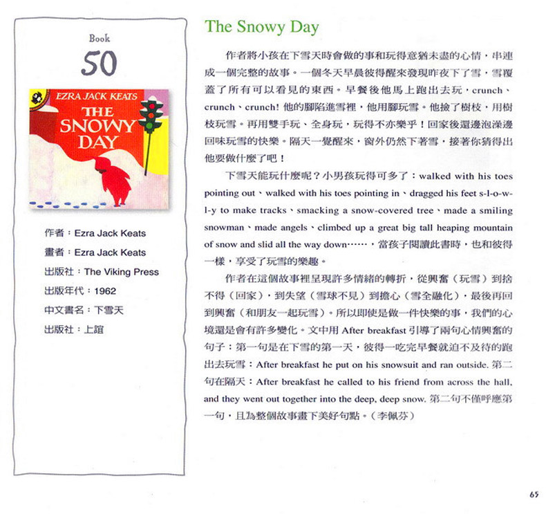 艾兹拉�9�9杰克�9�9季兹,1916年出生,在美国布鲁克林长大,一生几乎都居住在纽约市。他的父母为波兰移民,家境贫穷。季兹是犹太人,年轻时饱受歧视,因此他对其他受歧视的种族,具有深刻的同情心。艾兹拉�9�9杰克�9�9季兹是美国首位以小黑人为主角的童书创作者,希望能借由图画书消弭种族间的歧视。幸运的是,美国凯迪克奖,并没有因为主角肤色而忽略这位伟大的创作者,将金奖颁给了他的第1本作品《下雪天》。