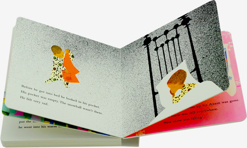 小男孩彼得,一早醒来发现昨夜下了雪,兴奋地跑到雪地里玩各种游戏,他堆了一个雪人和一个天使。回家前,还把在院子里捏的雪球放进口袋里,想留到明天再玩。回家后彼得泡在浴缸里,还忍不住一再回味,于是睡前去翻口袋,找寻带回来的雪,口袋却是空的,小雪球不见了,让他很失望。上床后又梦到太阳融化了所有的雪。但他一觉醒来,窗外却正在下着雪……