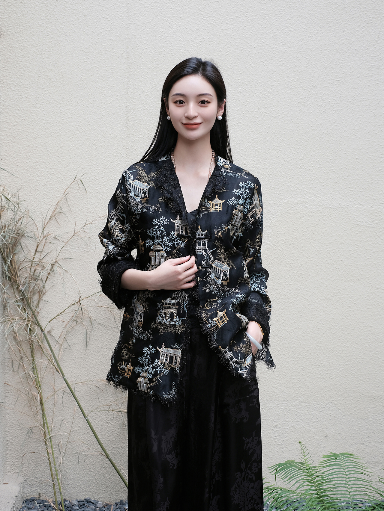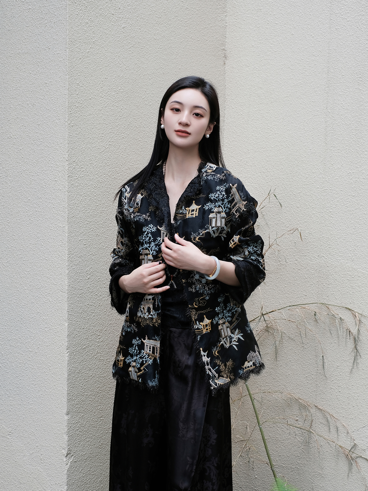 盛唐牡丹 |黑色真丝绡如意湖亭外套