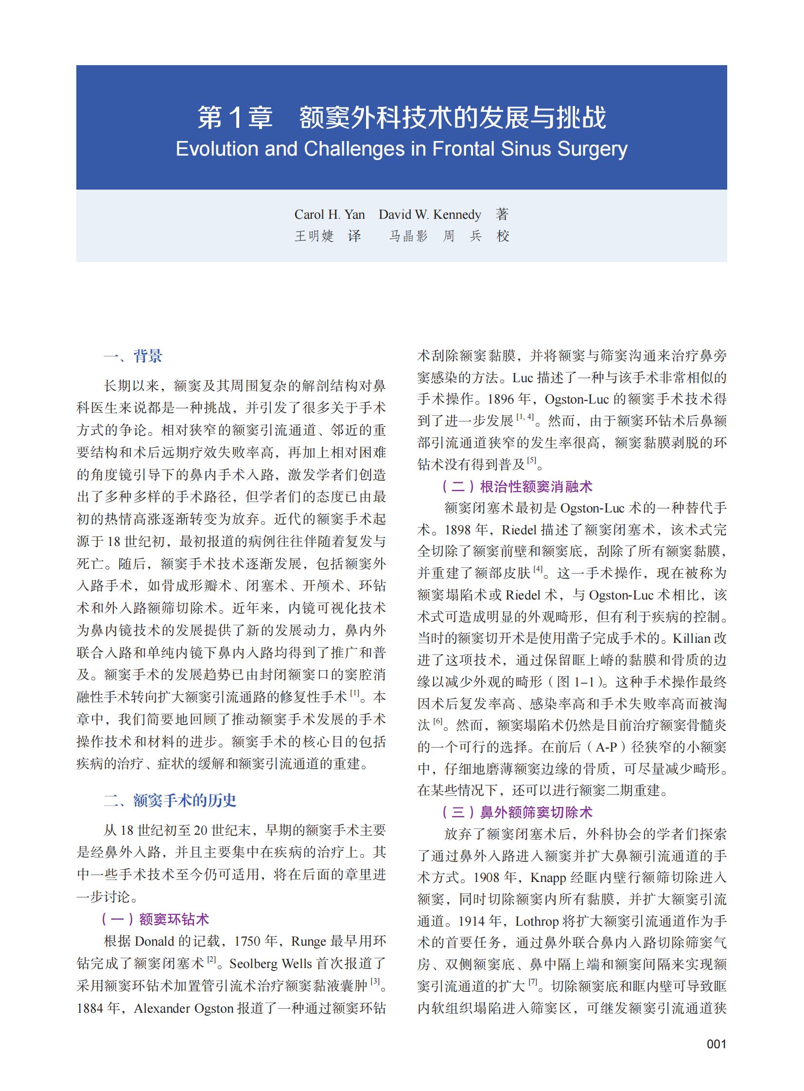 本书引进自 Springer 出版社,是一部系统介绍额窦手术的实用指南。全书共 30 章,从疾病治疗的角度,阐述了基于解剖学、生理学、病理学的多种手术方法、并发症及相关主题的研究,循序渐进地探索出了极具指导性的分步演示视频。本书语言简洁,图文并茂,内容全面且富有洞察力,相信是所有鼻外科医生在其职业生涯的任何阶段都不可或缺的。