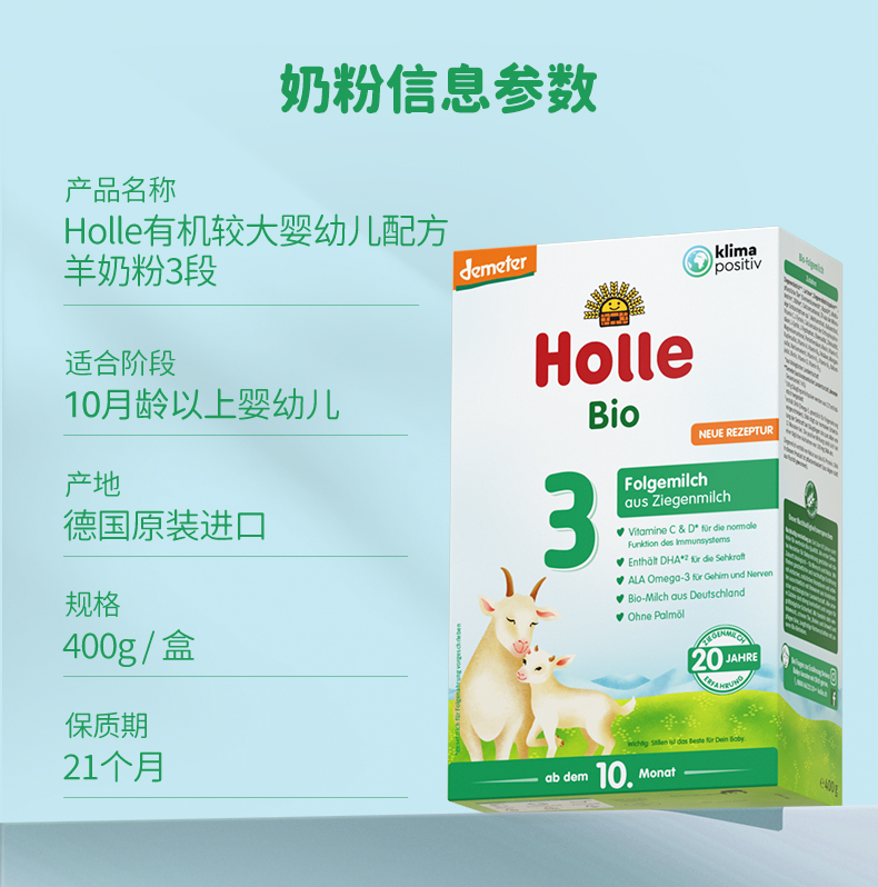 Holle(泓乐)有机婴儿配方羊奶粉3段400g/盒 强化DHA/ALA 幼儿宝宝有机山羊奶粉 适用于10月龄以上宝宝,效期到2027-2-8 含税价(未税价:228元/盒)