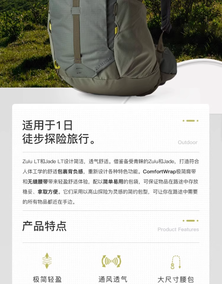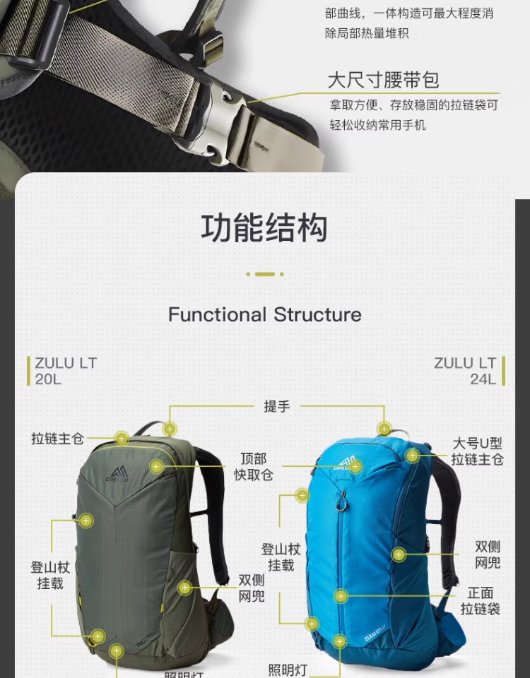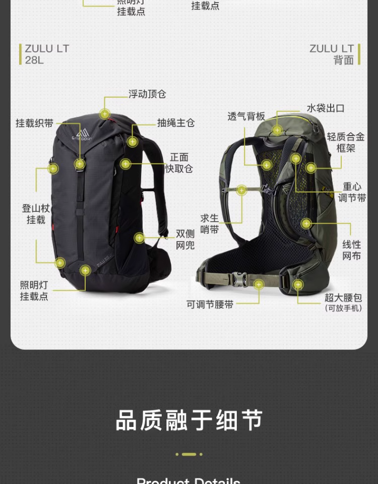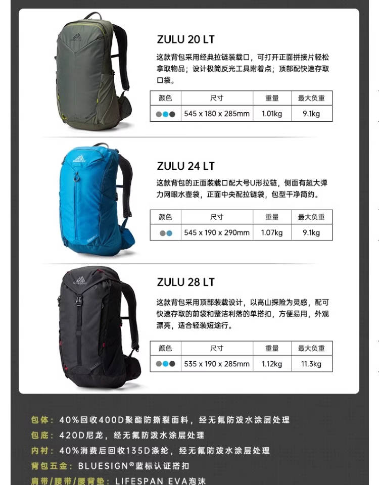 GREGORY格里高利ZULU LT探迹24轻量化徒步登山包透气舒适双肩包男款