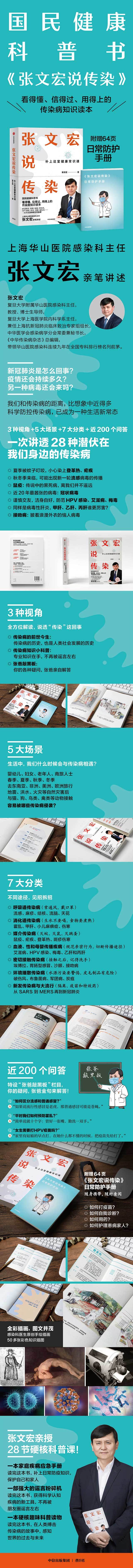所以就有了《张文宏说传染》这本书。如何用大众最乐于接受的方式,普及传染病专业知识,是我一直在想、在做的事。编写《张文宏说传染》的时候,敲下每句话之前,我都会问自己:没有医学常识的普通人能看懂吗?我们生活中处处可能受到传染病的侵袭:家里有老人、孩子,旅行的时候,换季的时候,自然灾害后……对每一种传染病,本书都对其历史和现实中的暴发流行进行了全面的介绍。在让大家了解疾病流行的同时,还提供了翔实的生活防护贴士,让我们既在历史中看清未来的走向,也在现实生活中过得更加安全。相信随着科学的发展,人类控制住传染病也只是时间的问题。
