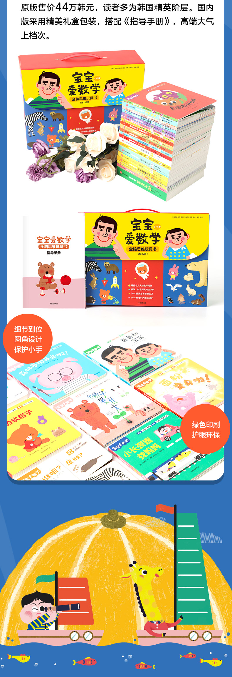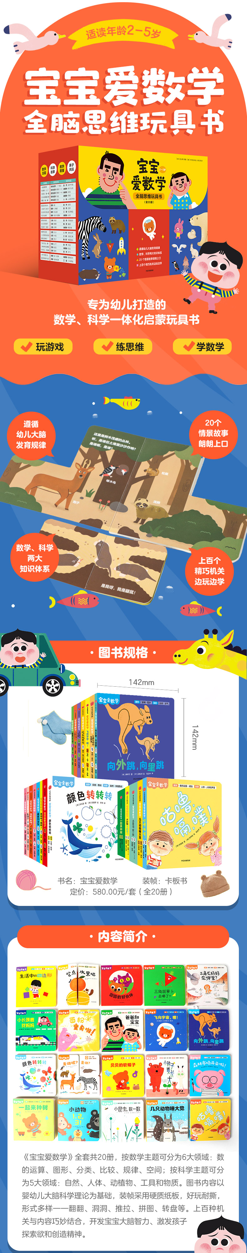 “宝宝爱数学"系列是一套专为0-3岁儿童打造、启蒙数学与科学知识的游戏玩具绘本。本系列一共有20册玩具书,由韩国屈指的教育集团打造,是一套专为0~3岁孩子打造的数学、科学一体化启蒙书。它以婴幼儿大脑科学理论为基础,将数学与科学融合到日常生活中常见的动物、植物、事物中去。