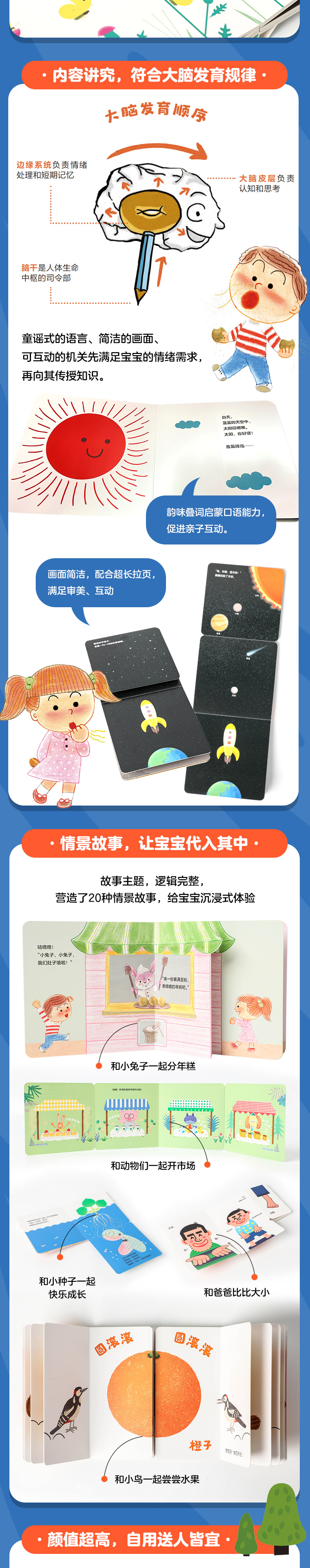 《宝宝爱数学》适合2-5岁、大脑处于发育黄金时期的幼儿阅读。本套书从宝宝的喜好出发,用情景丰富的故事、童谣式的语言、简洁的画面和市面上少见的精巧机关充分安抚宝宝的情绪,先满足他们互动需求,然后再传授知识,这样可以帮助宝宝更好的训练数学思维、学习科学概念、促进思考与推理能力的发育。