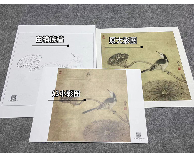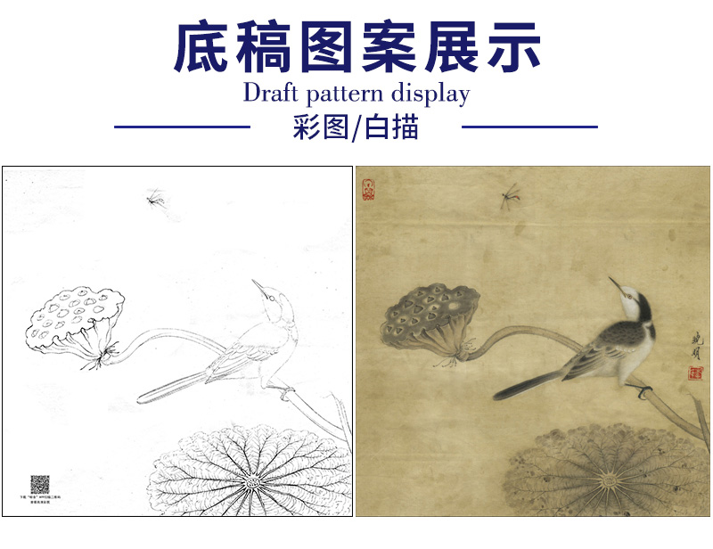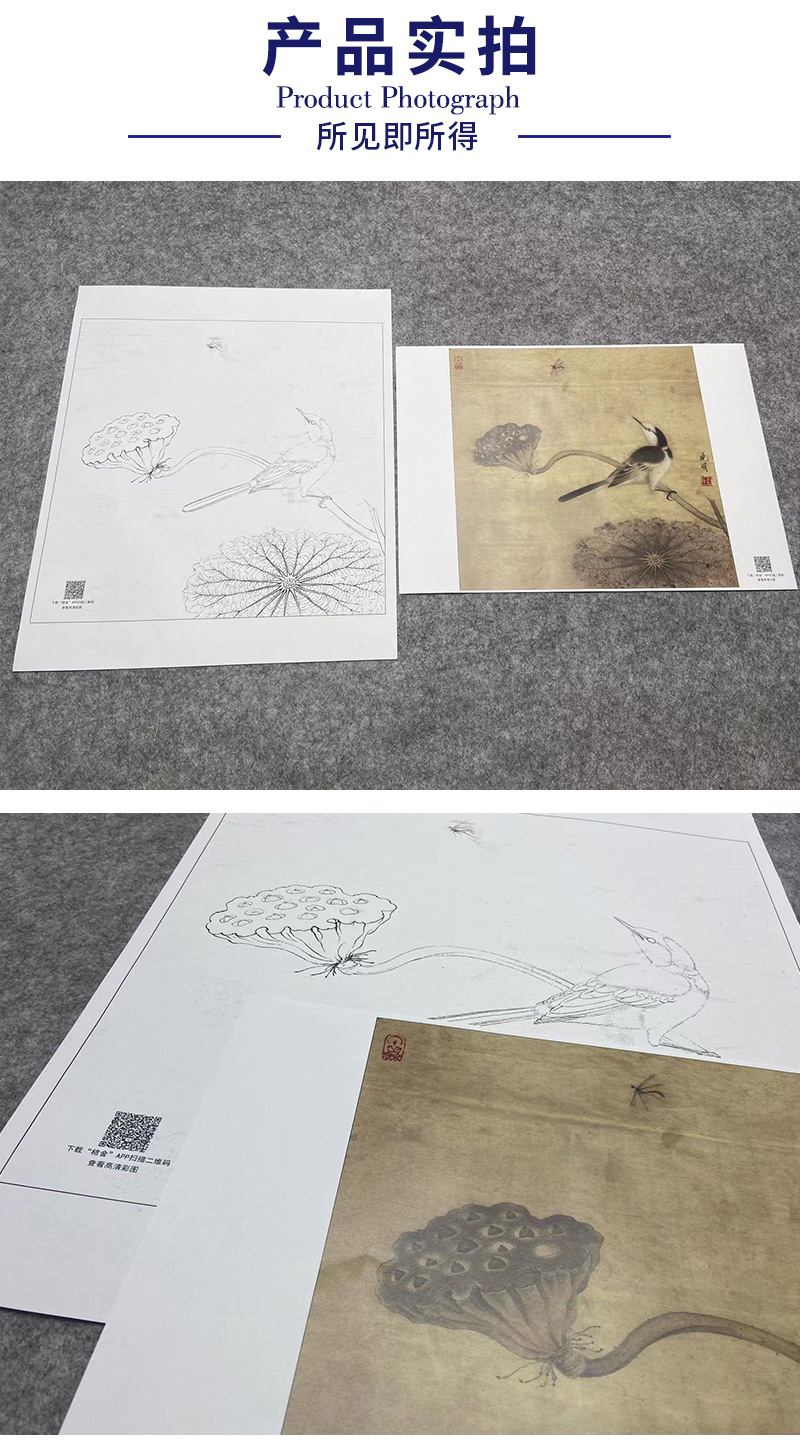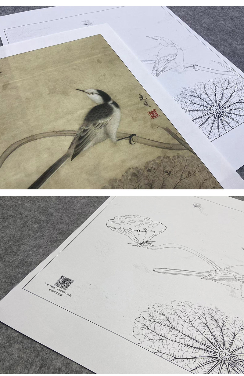 【大彩图】李晓明工笔画白描底稿斗方小品《临宋疏荷沙鸟图》临摹勾线花鸟线稿K067