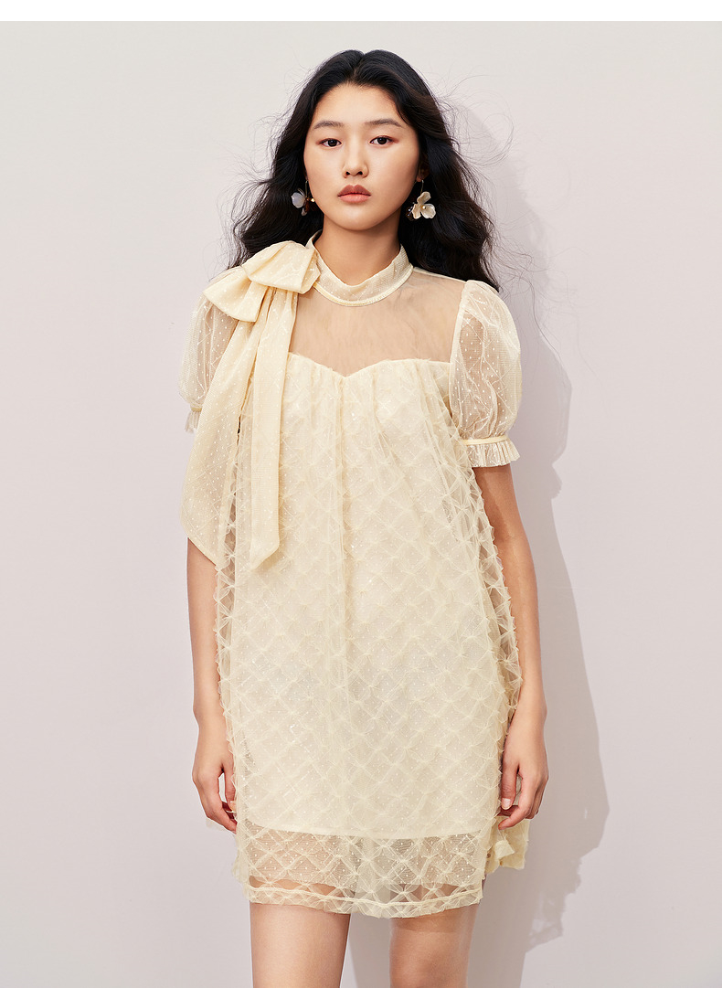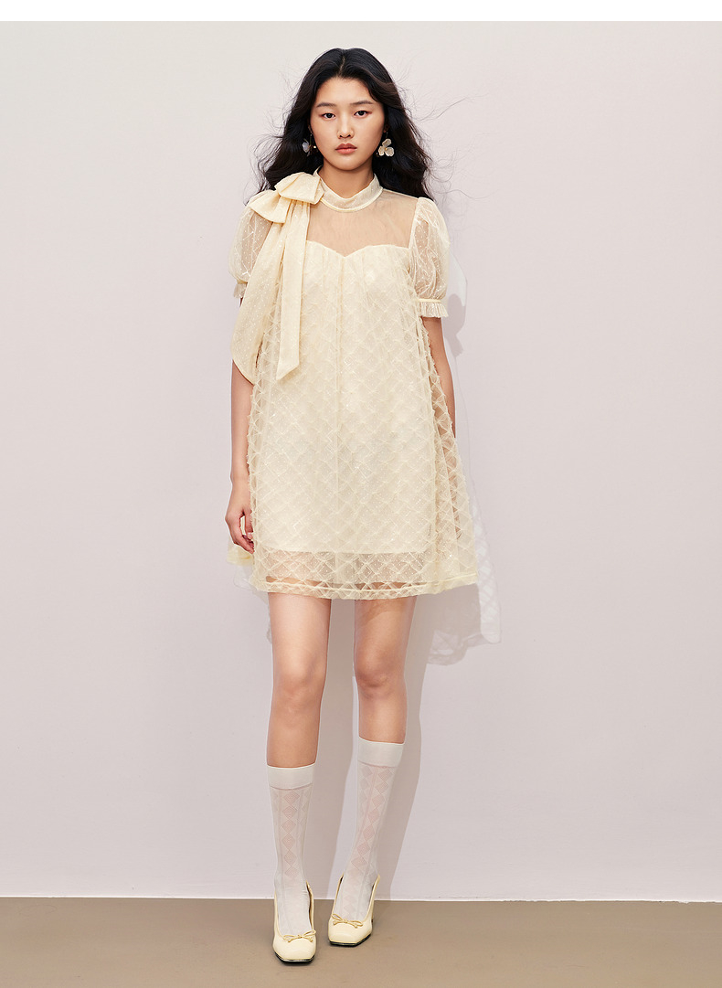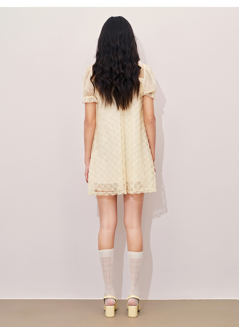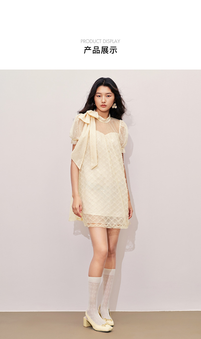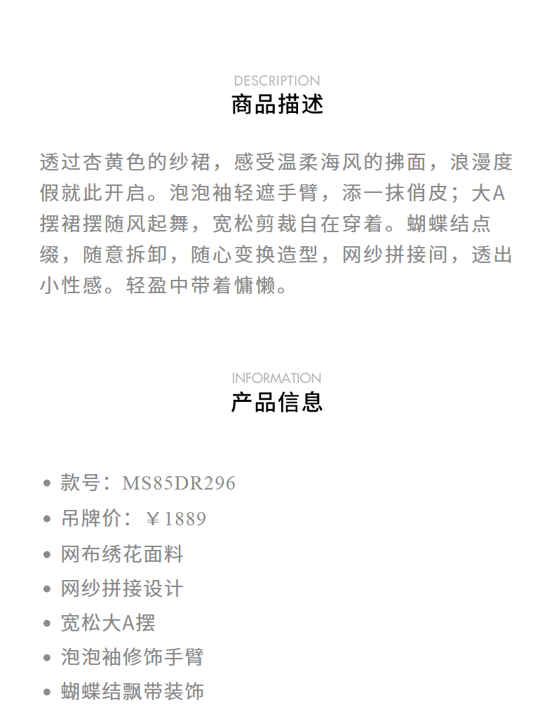 MAXRIENY浪漫度假风连衣裙网纱拼接设计2024夏款泡泡袖a摆裙子(货号:MS85DR296)