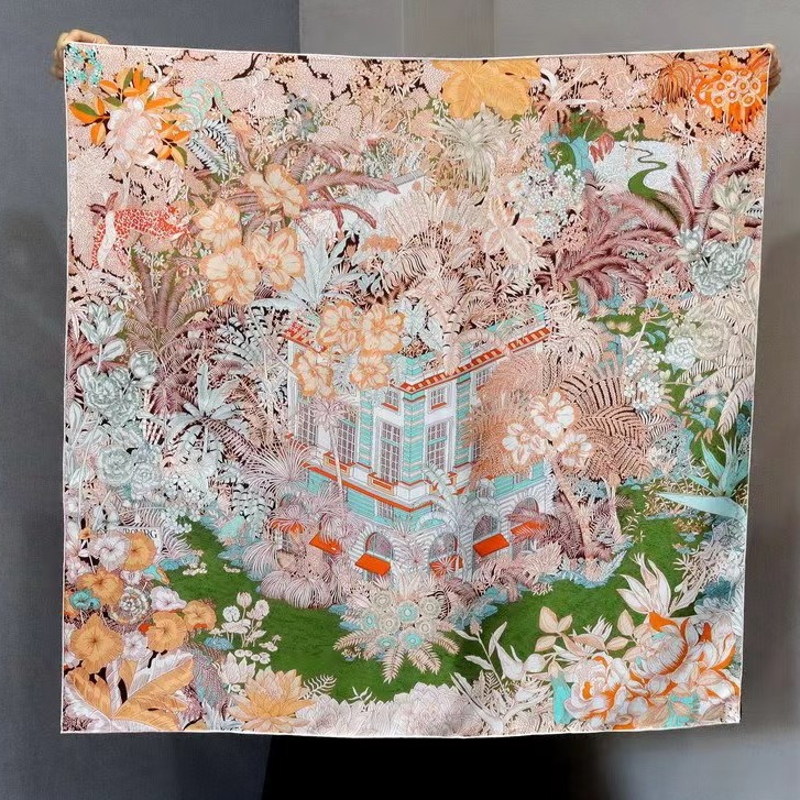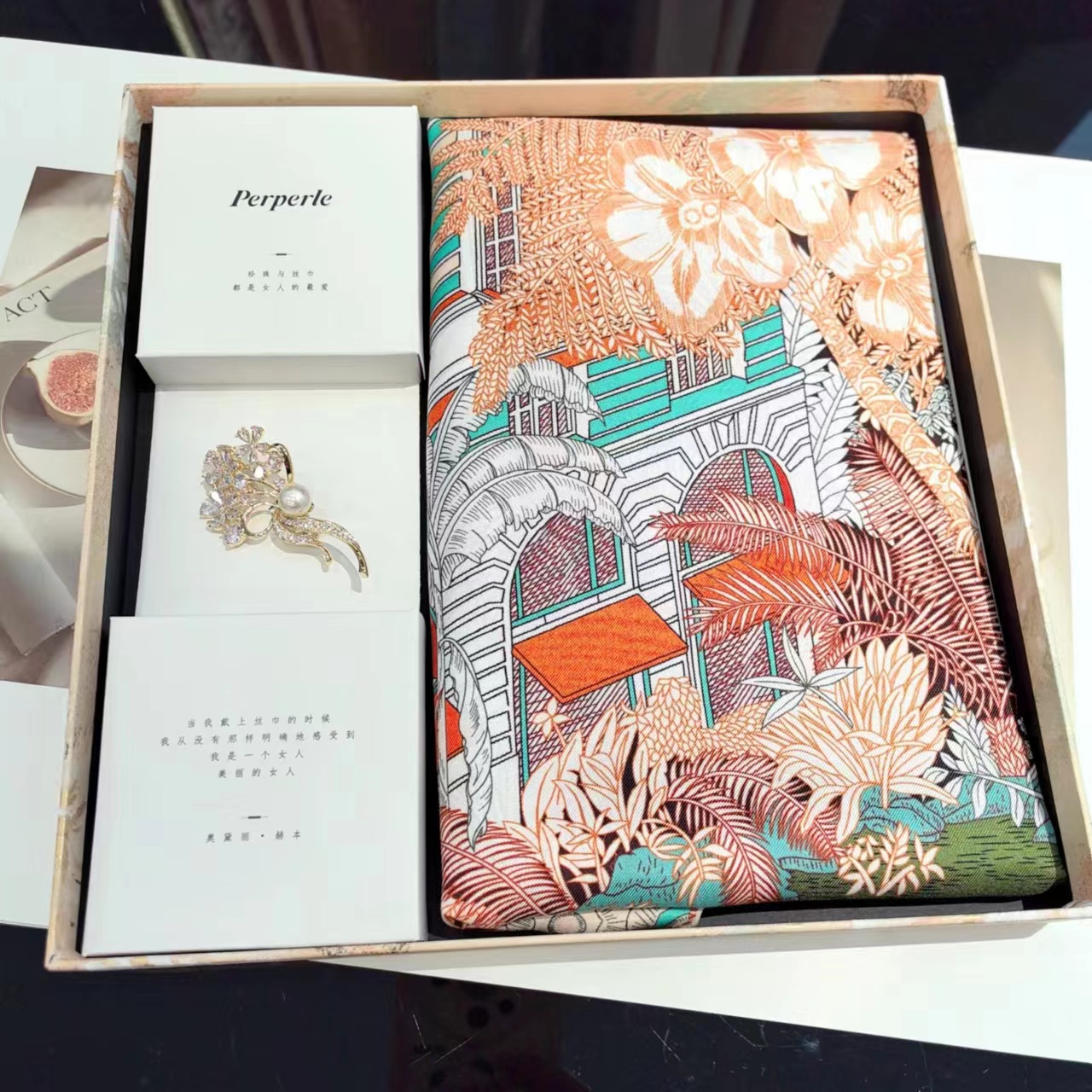 【甄珠贝·时尚高级感系列】90*90cm辛德瑞花园丝巾和丝带花胸针礼盒套装