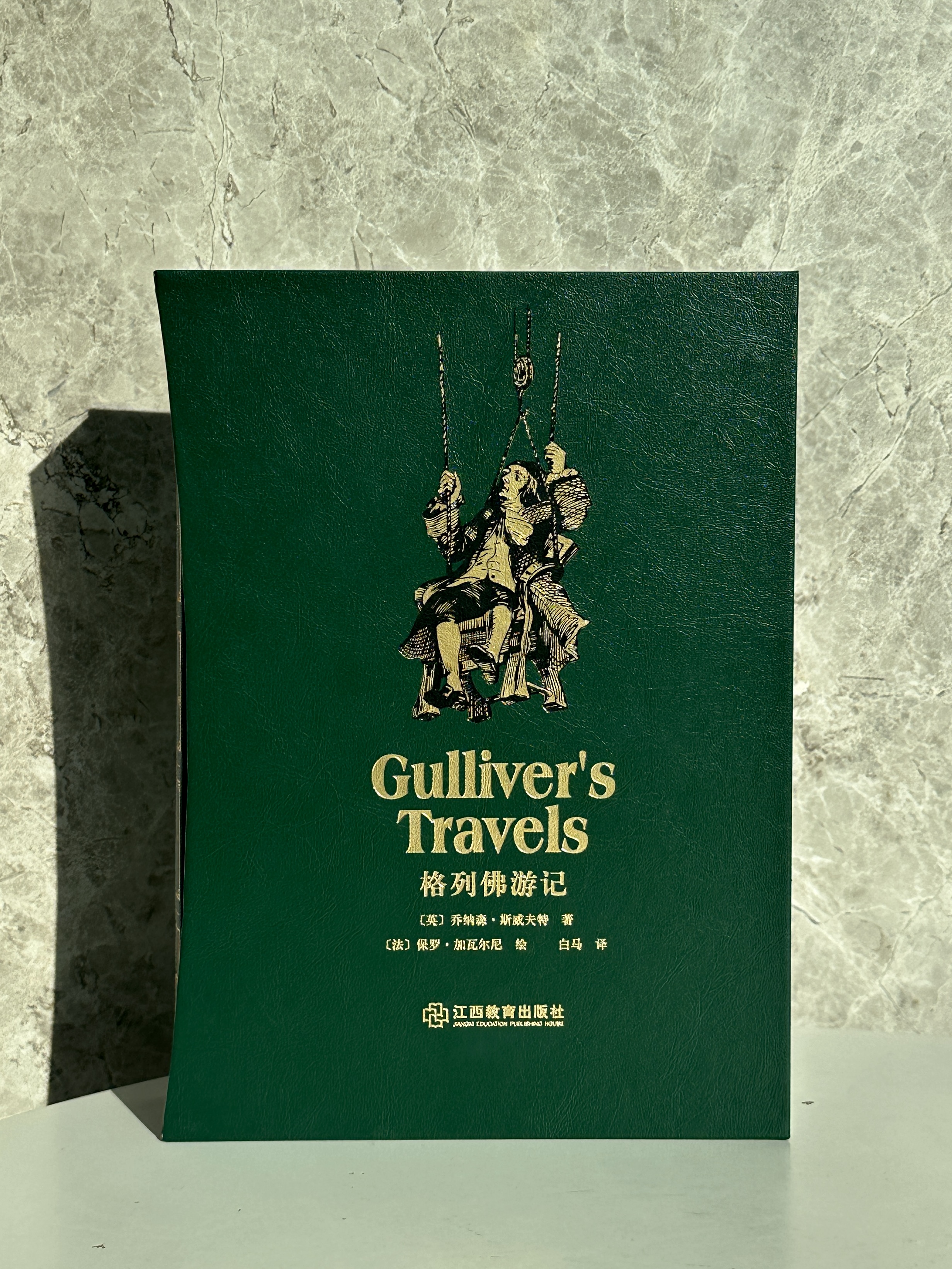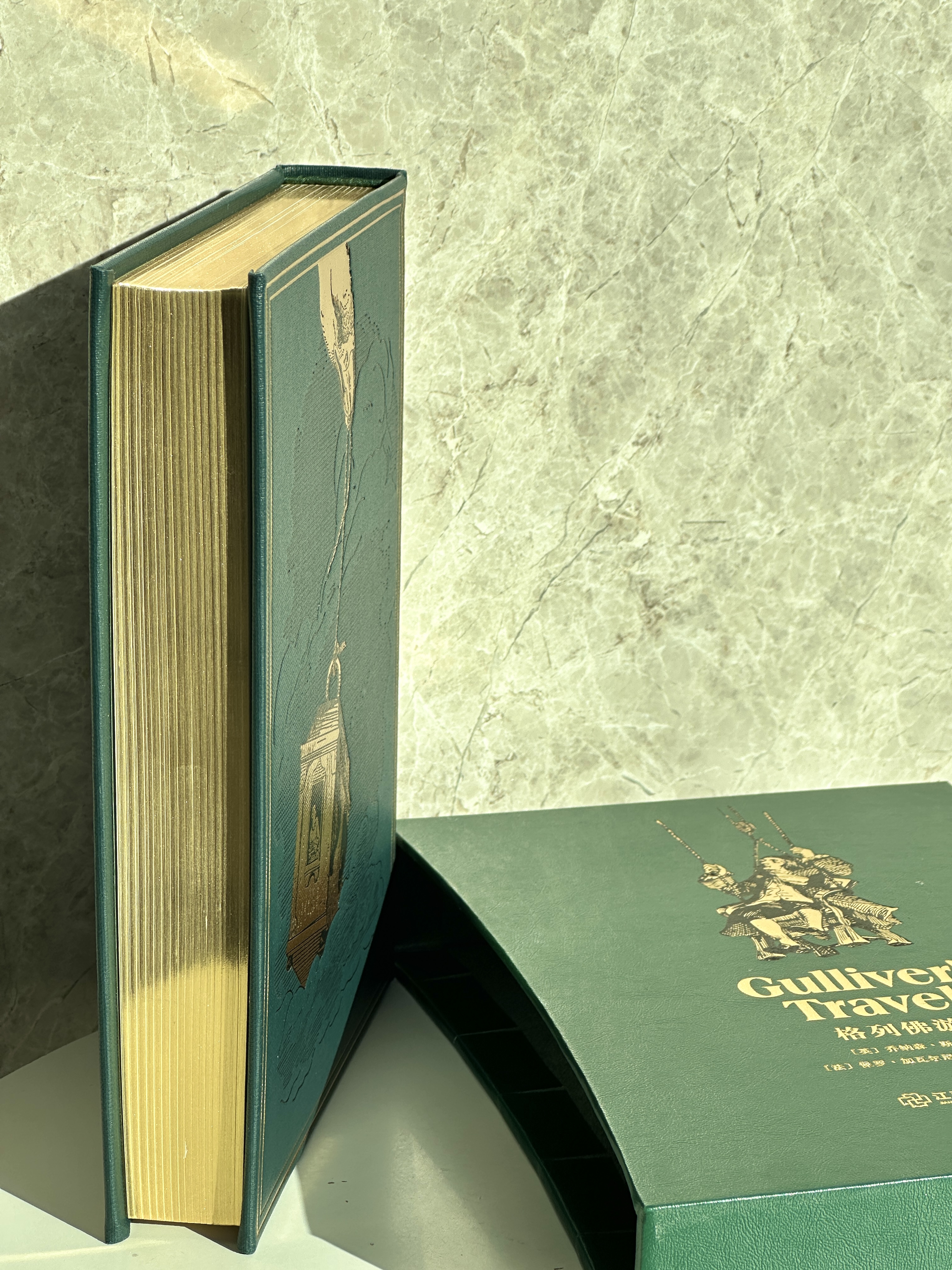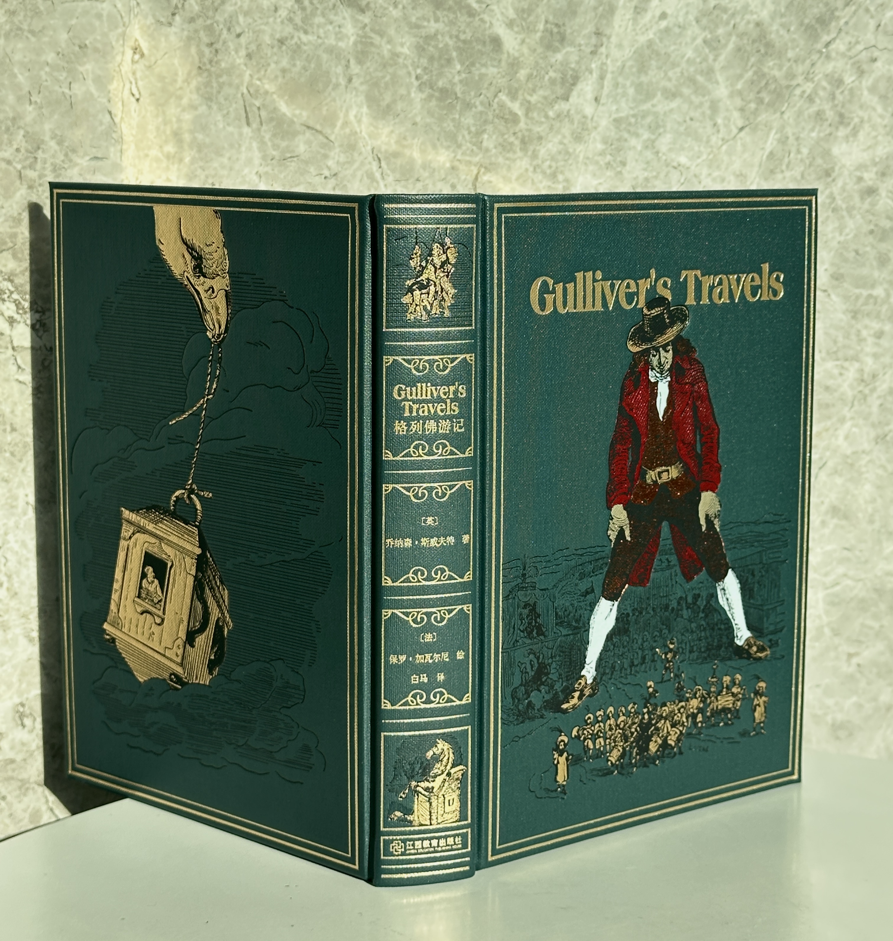 以烫金烫印工艺精细呈现格列佛第三次航海中被接引至悬浮于空中的飞岛国的经典场景。