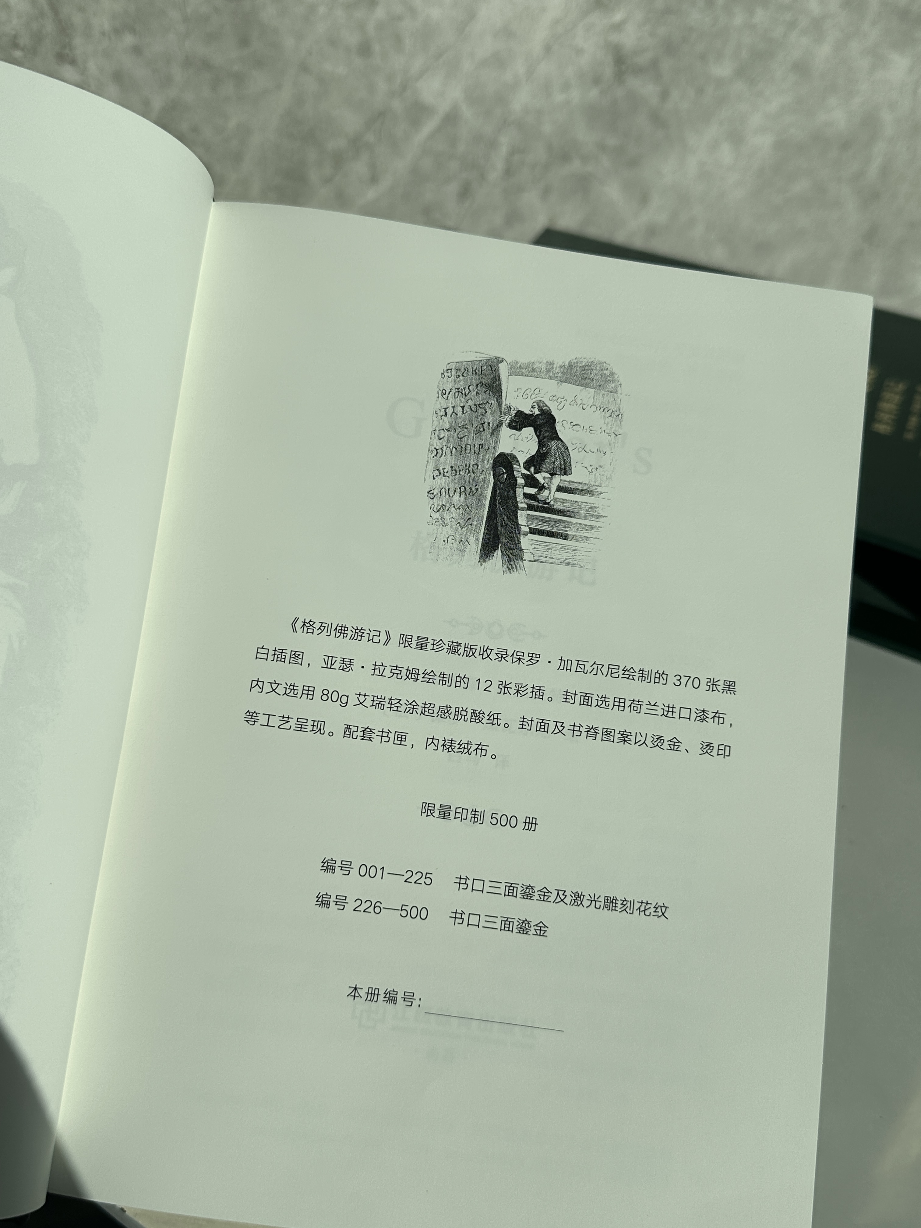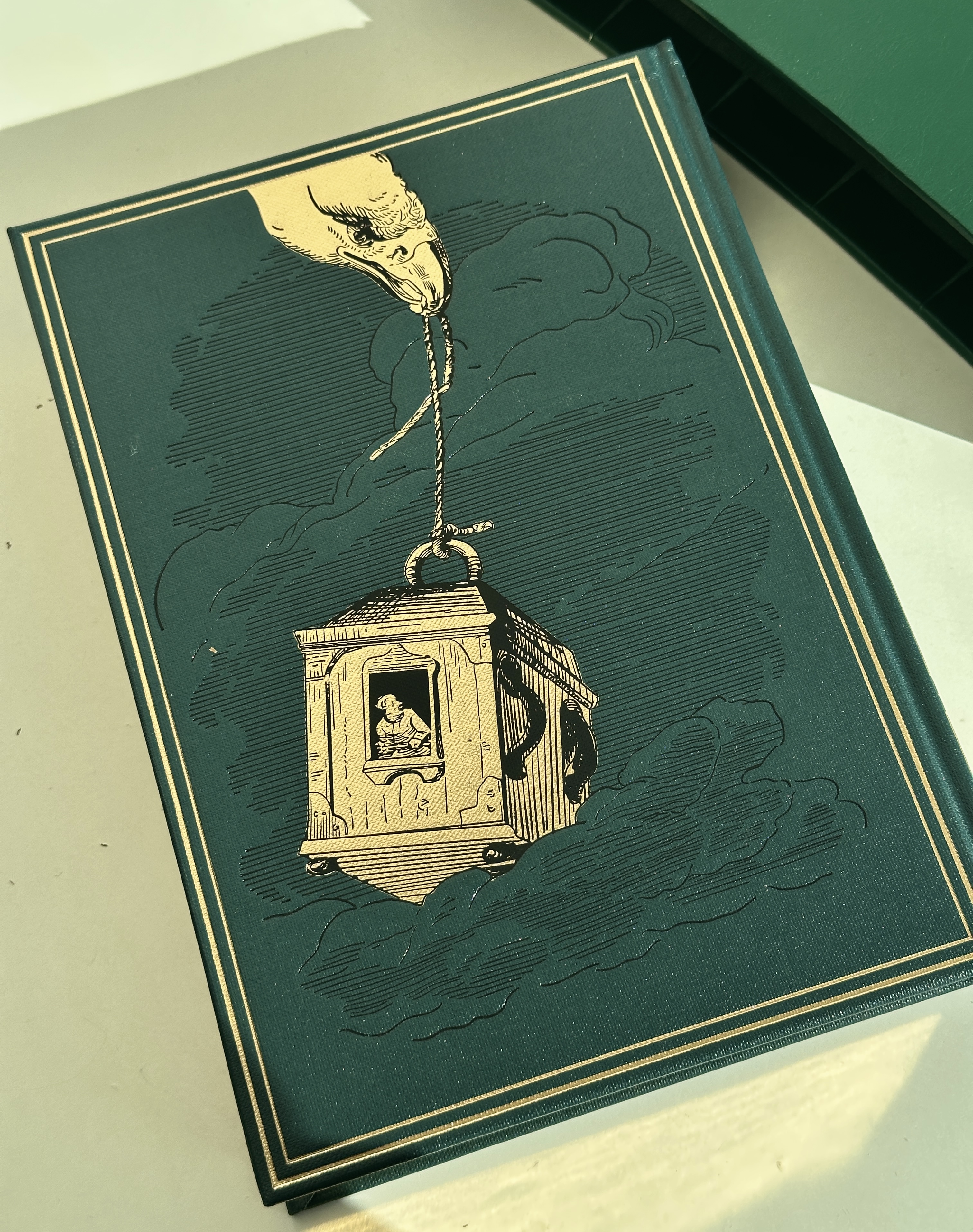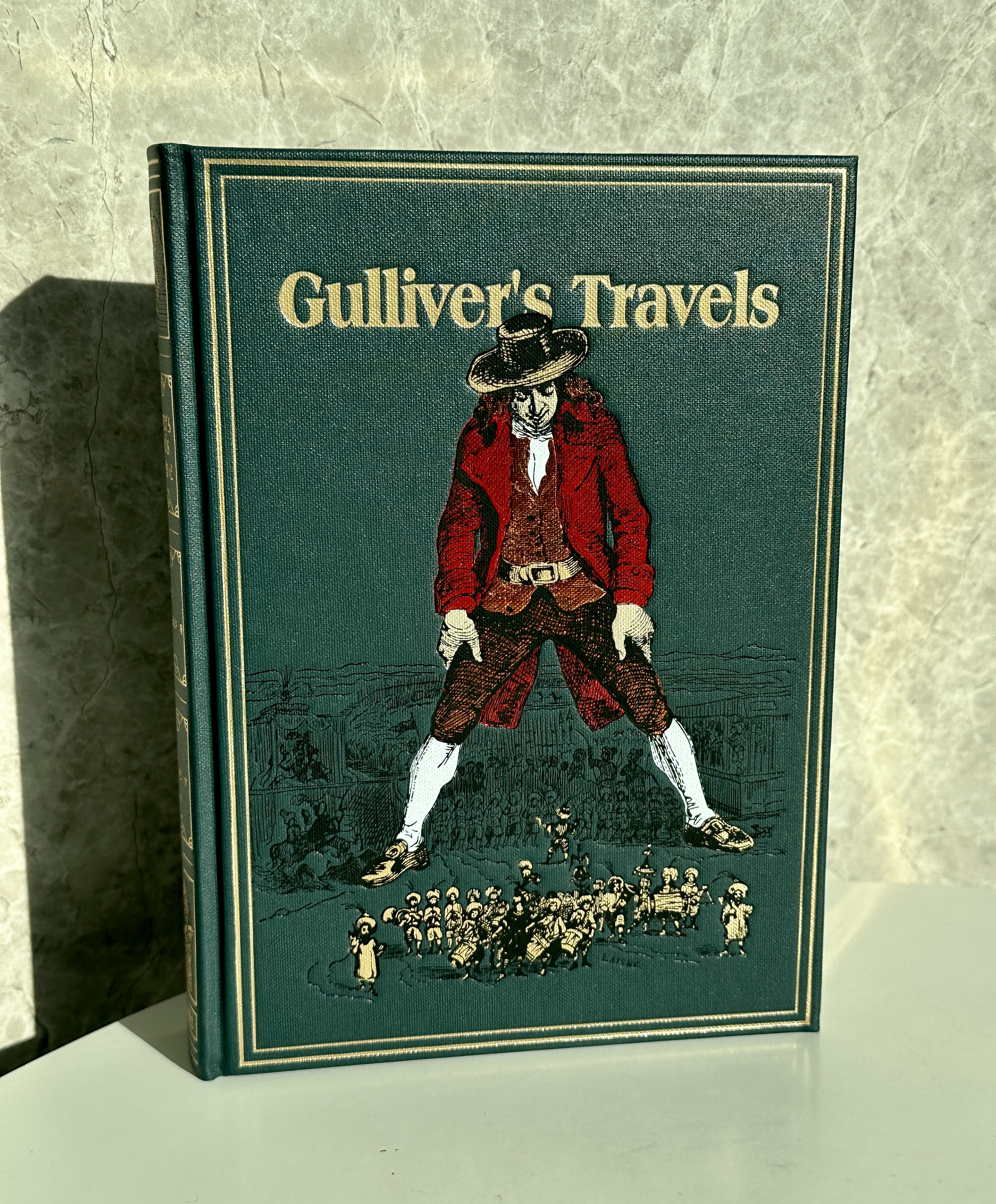 以烫金烫印工艺精细呈现格列佛第三次航海中被接引至悬浮于空中的飞岛国的经典场景。