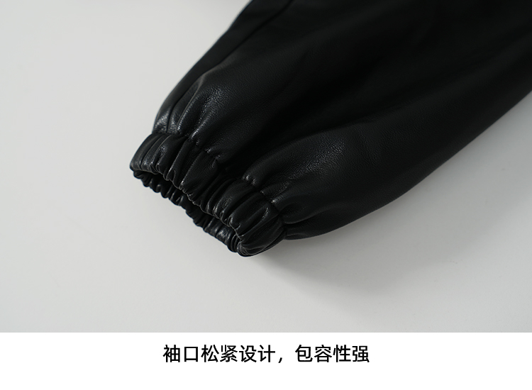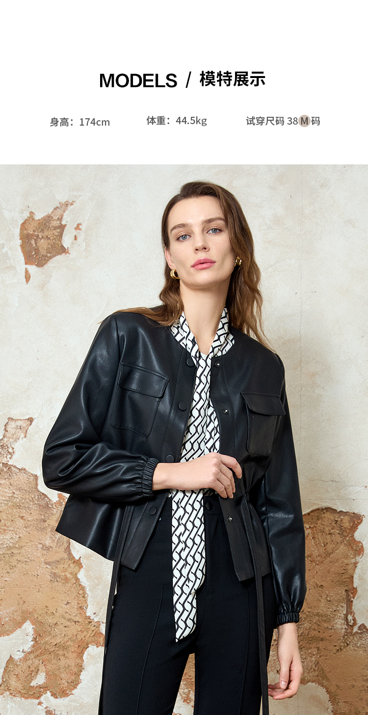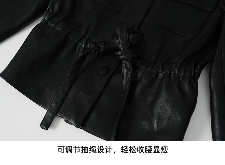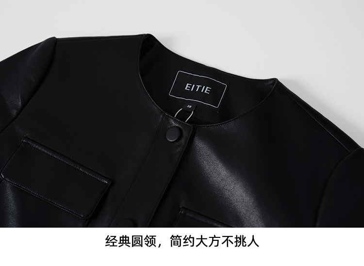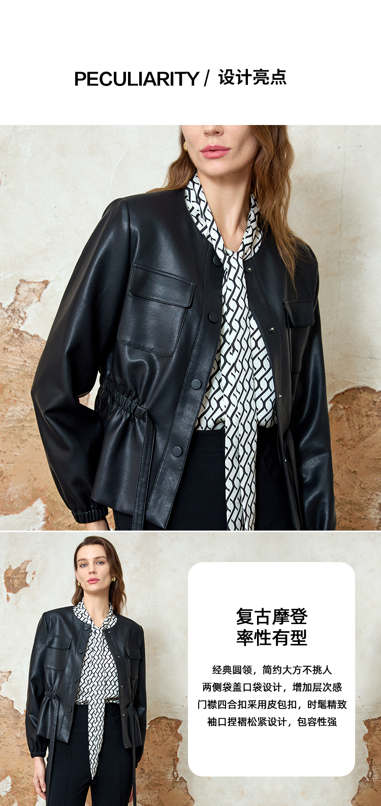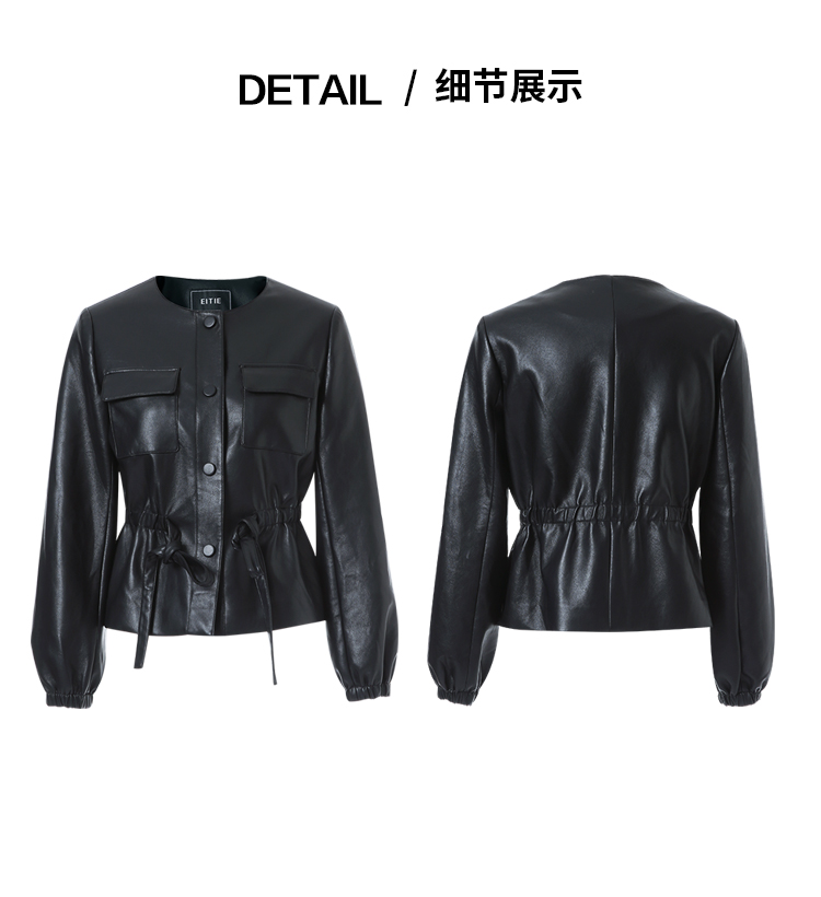 EITIE爱特爱2025春季新款时尚通勤复古圆领百搭抽绳显瘦皮衣外套8103817