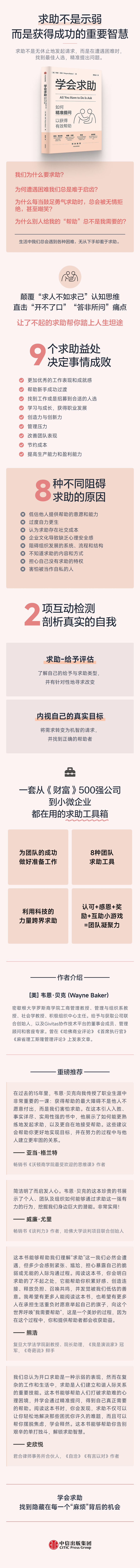 在这本书中,作者提供了精心设计且多年来已被 广泛应用的测试,让读者在阅读中深度剖析自己 无法求助的内在原因,并根据具体情况给出了应 对思路和策略。这本书不仅为个人量身定制了破解求助难题的方法,更系统总结了一套已被谷歌、通用汽车等公司使用的求助工具包。借助这些工具,个人、团队和组织能够充分利用自身的网络,释放周边资源的力量,在求助中获益,并顺利让求助和提供帮助成为一种习惯。