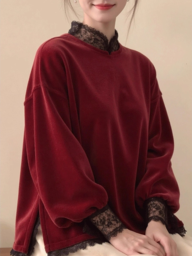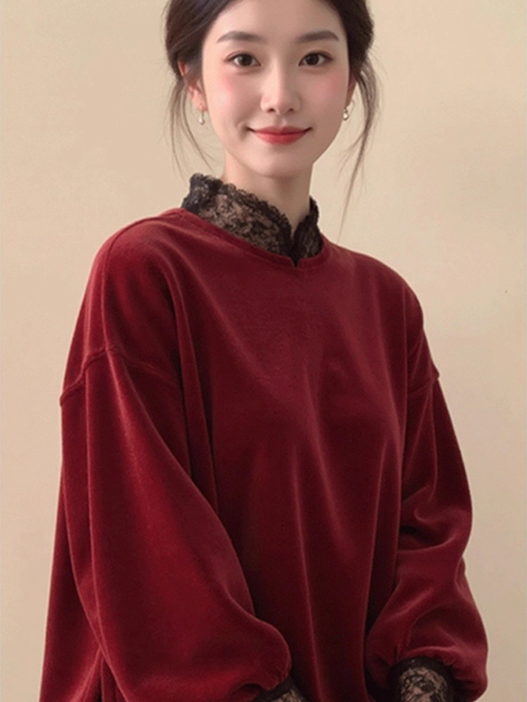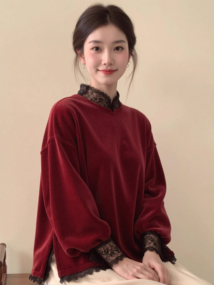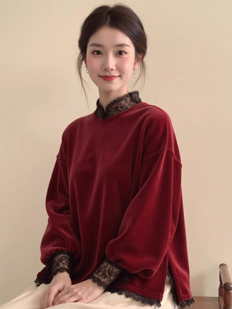 2025秋冬新款中式国风绝美宽松显瘦休闲红色蕾丝花边立领上衣