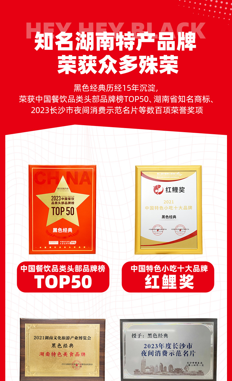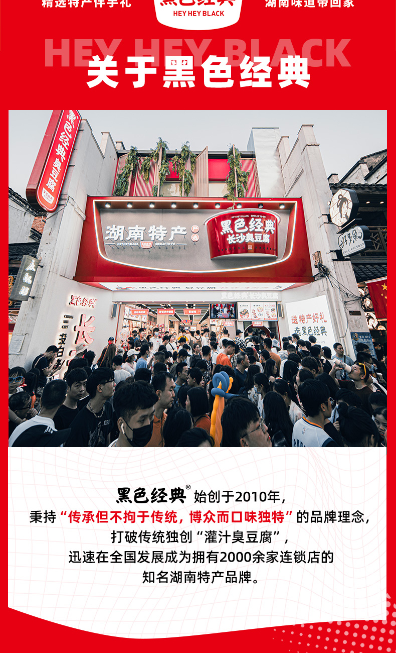 黑色经典湖南特产商城是长沙著名特色小吃“黑色经典长沙臭豆腐”旗下的线上官方商城。黑色经典面向全国,以长沙臭豆腐为核心,辐射覆盖湖南本土特色美食全系列产品,并对所有产品的生产工艺及包装进行了独特的改良。