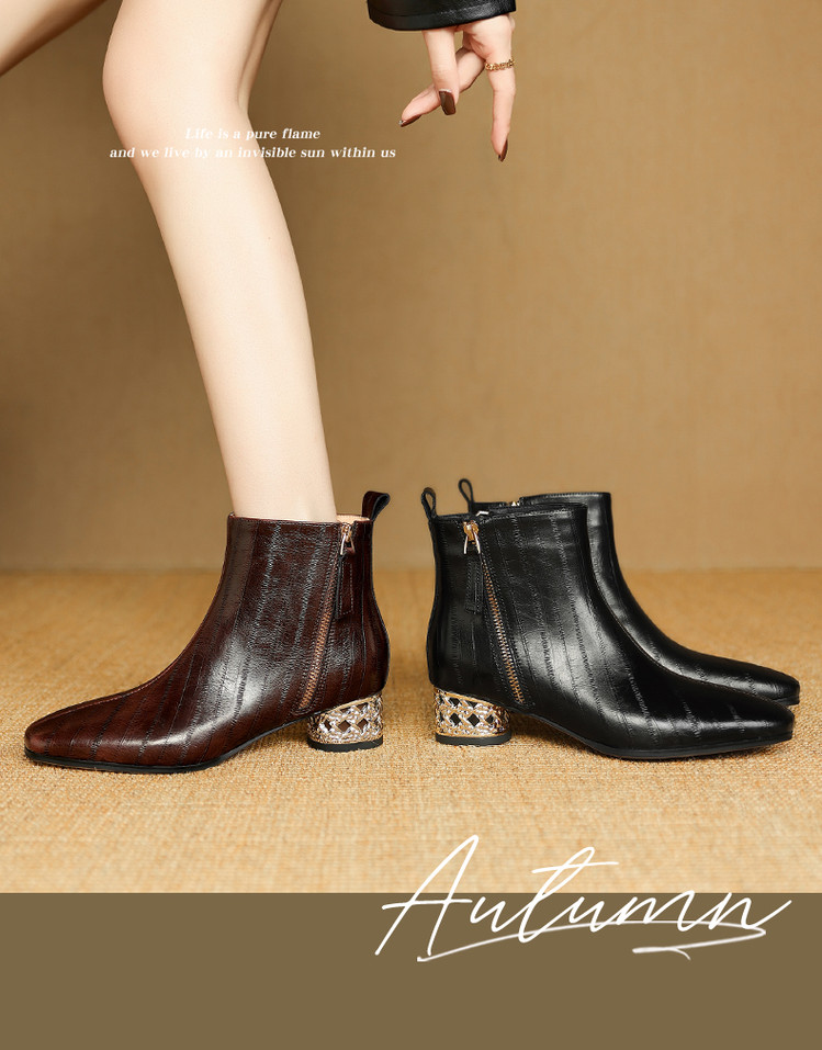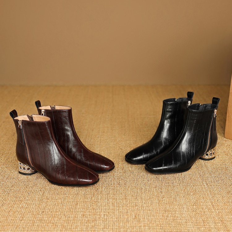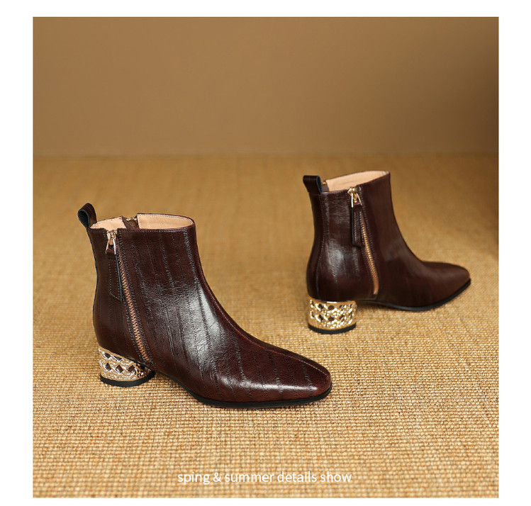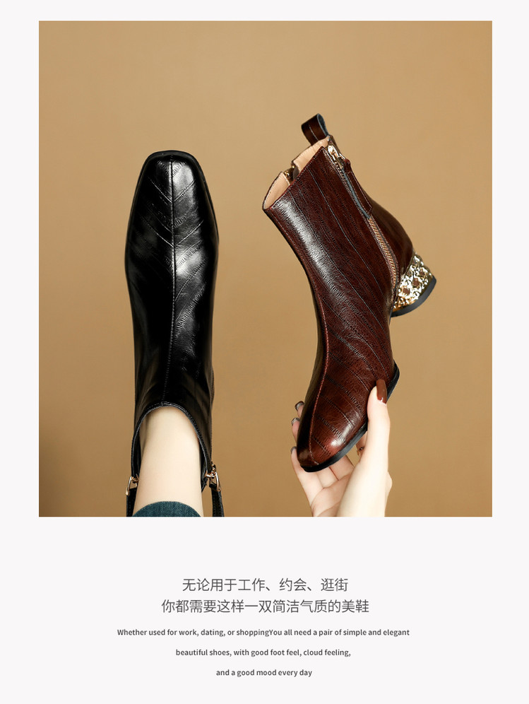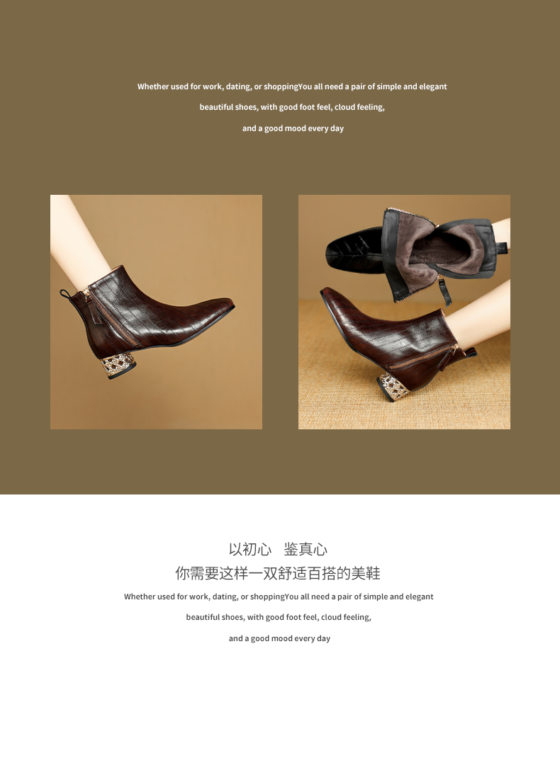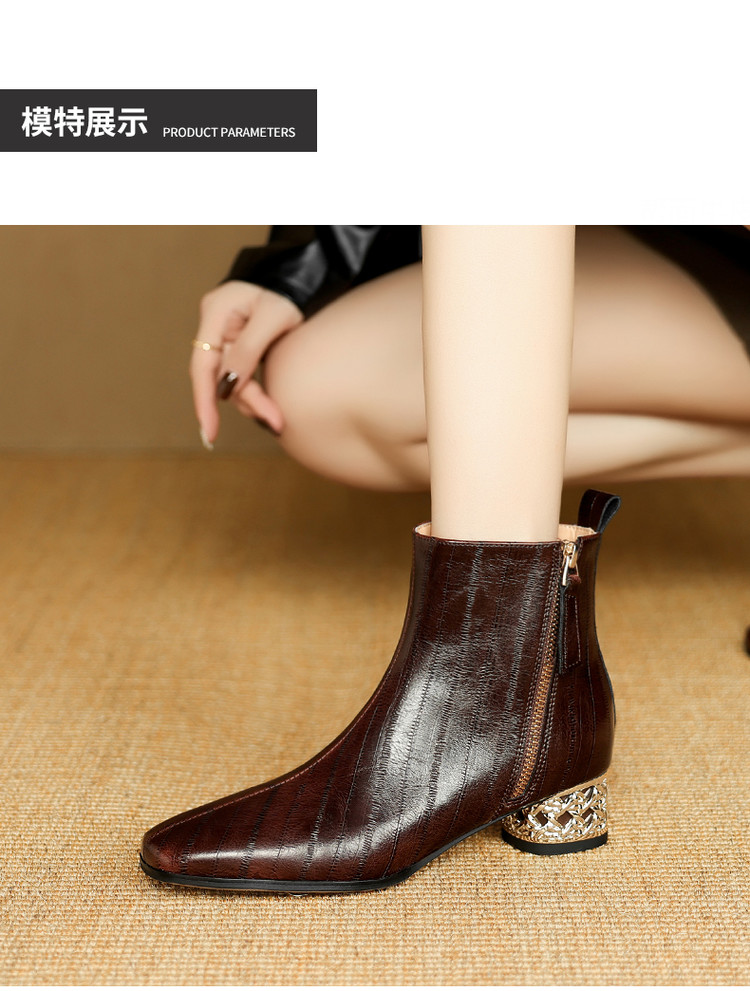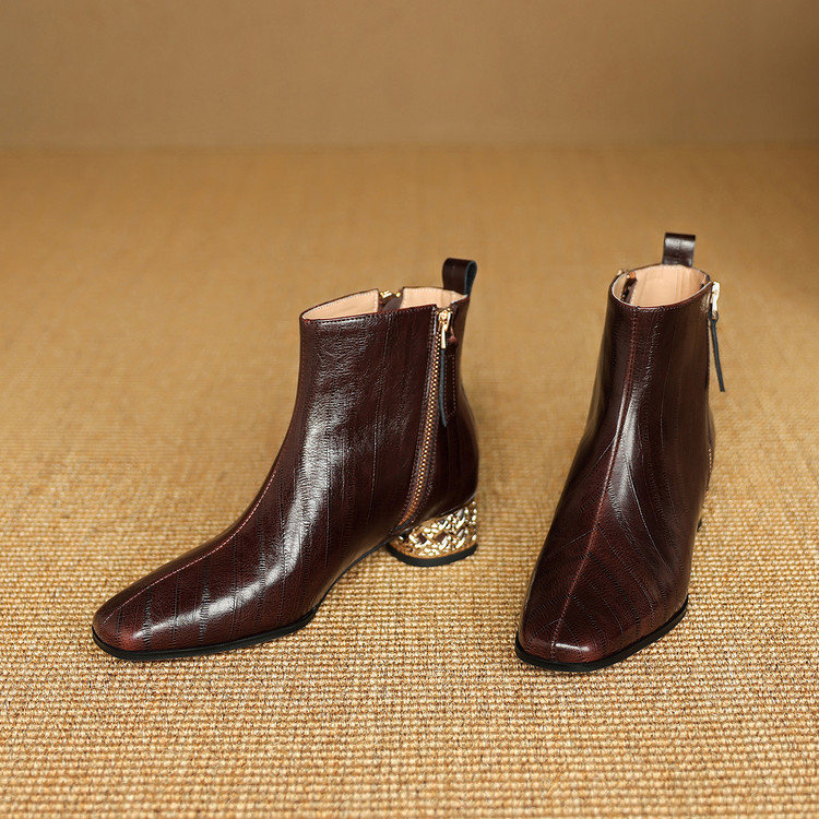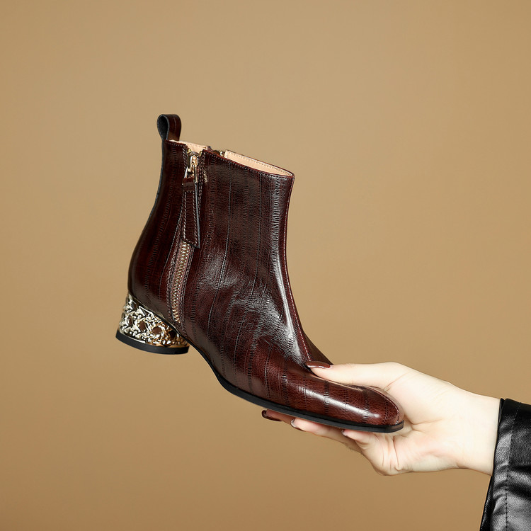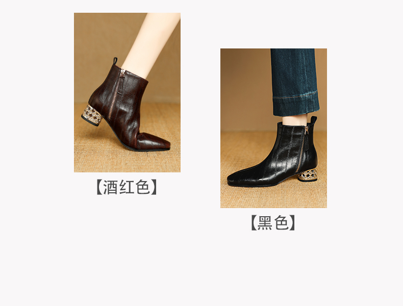 【预售5天】时尚牛皮金属电镀跟短筒时装靴方头侧拉链酒红色加绒中粗跟短靴女NJMK&K1772