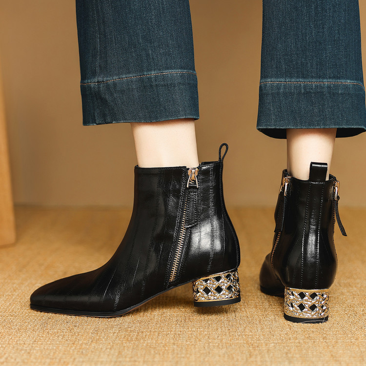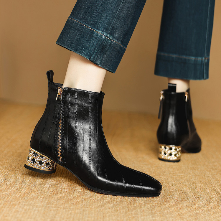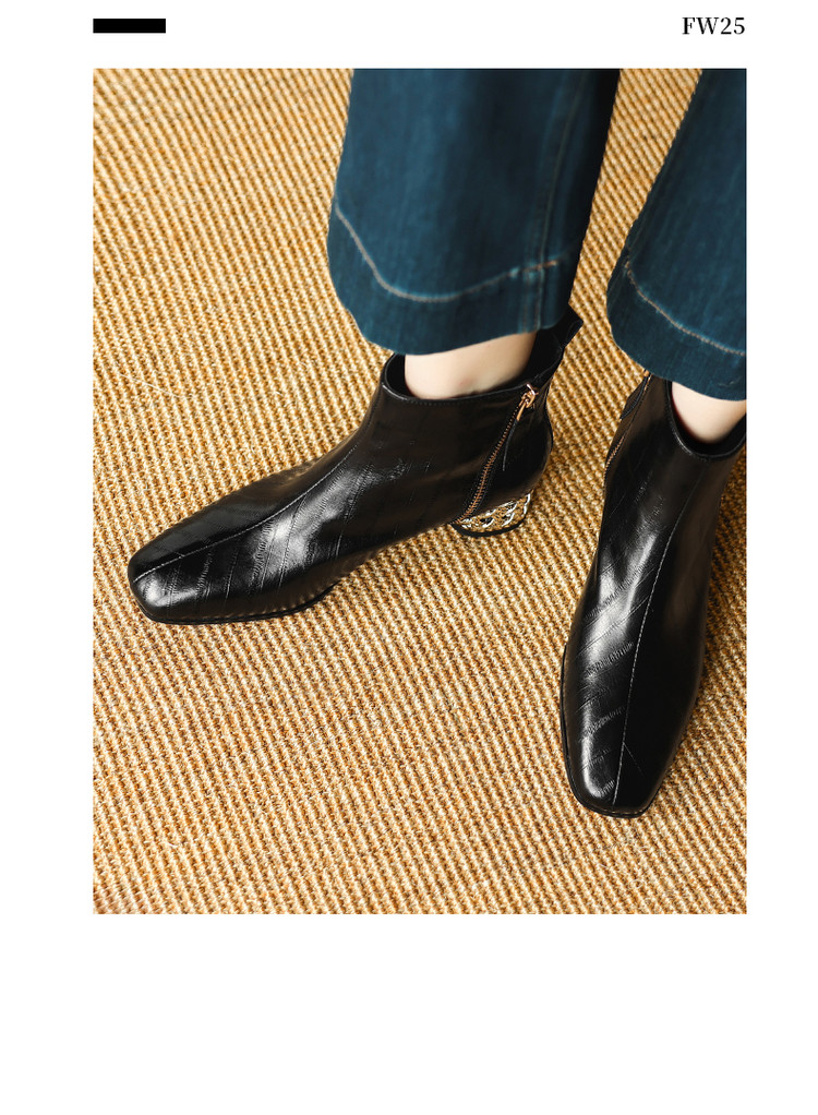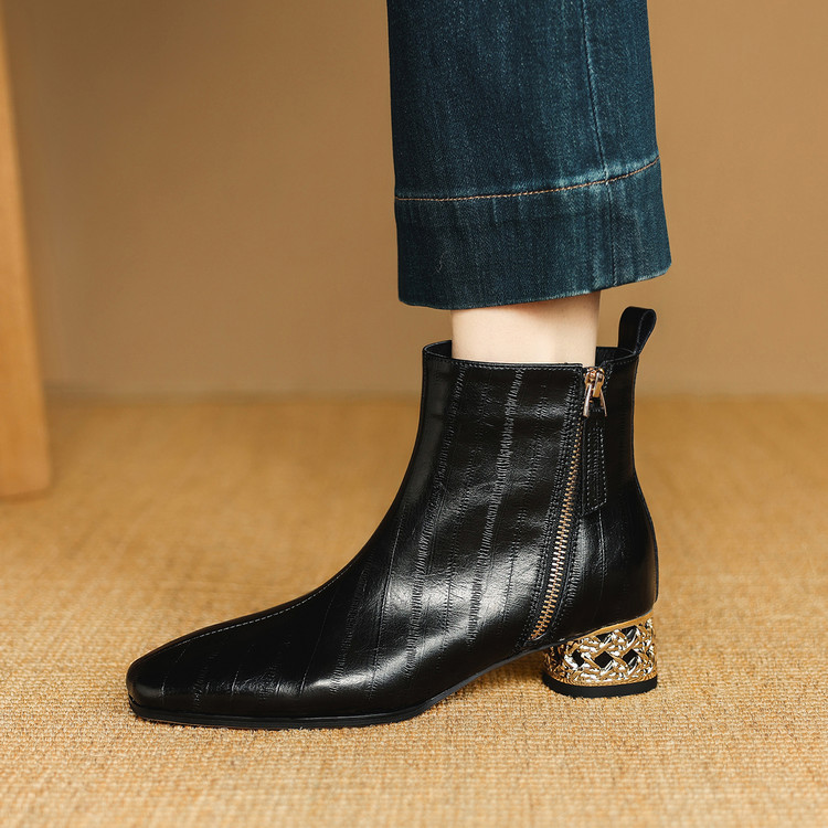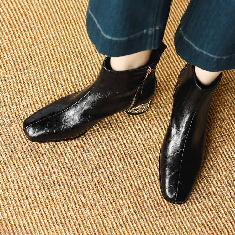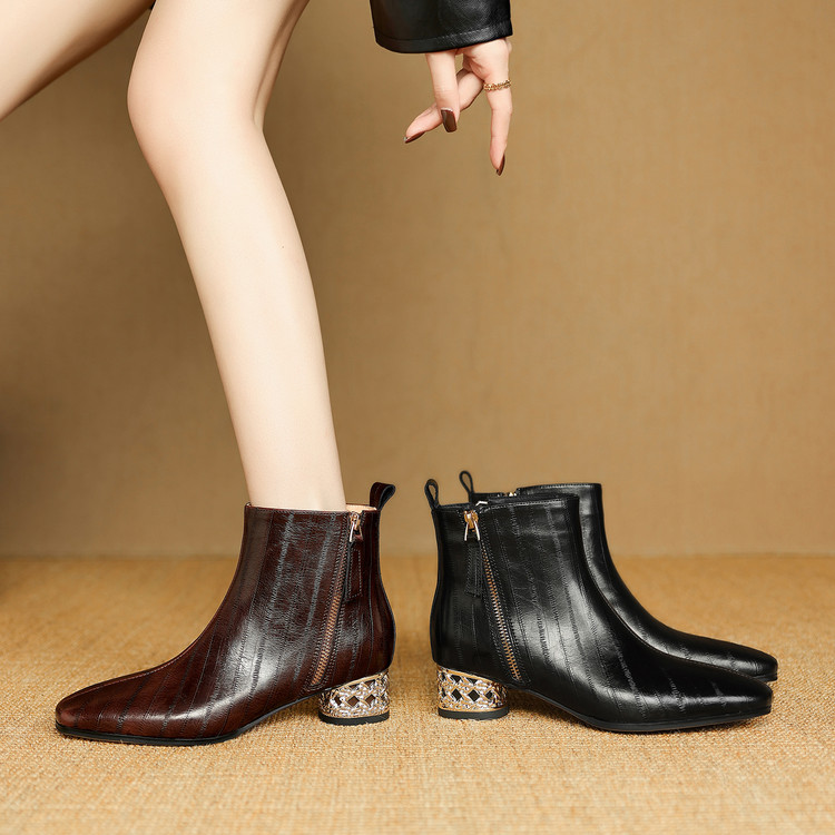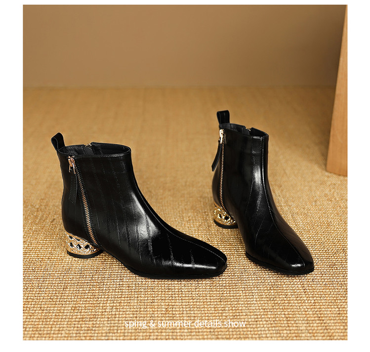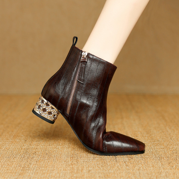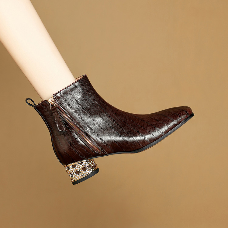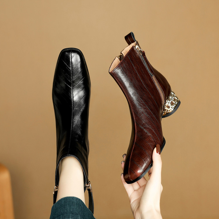 【预售5天】时尚牛皮金属电镀跟短筒时装靴方头侧拉链酒红色加绒中粗跟短靴女NJMK&K1772