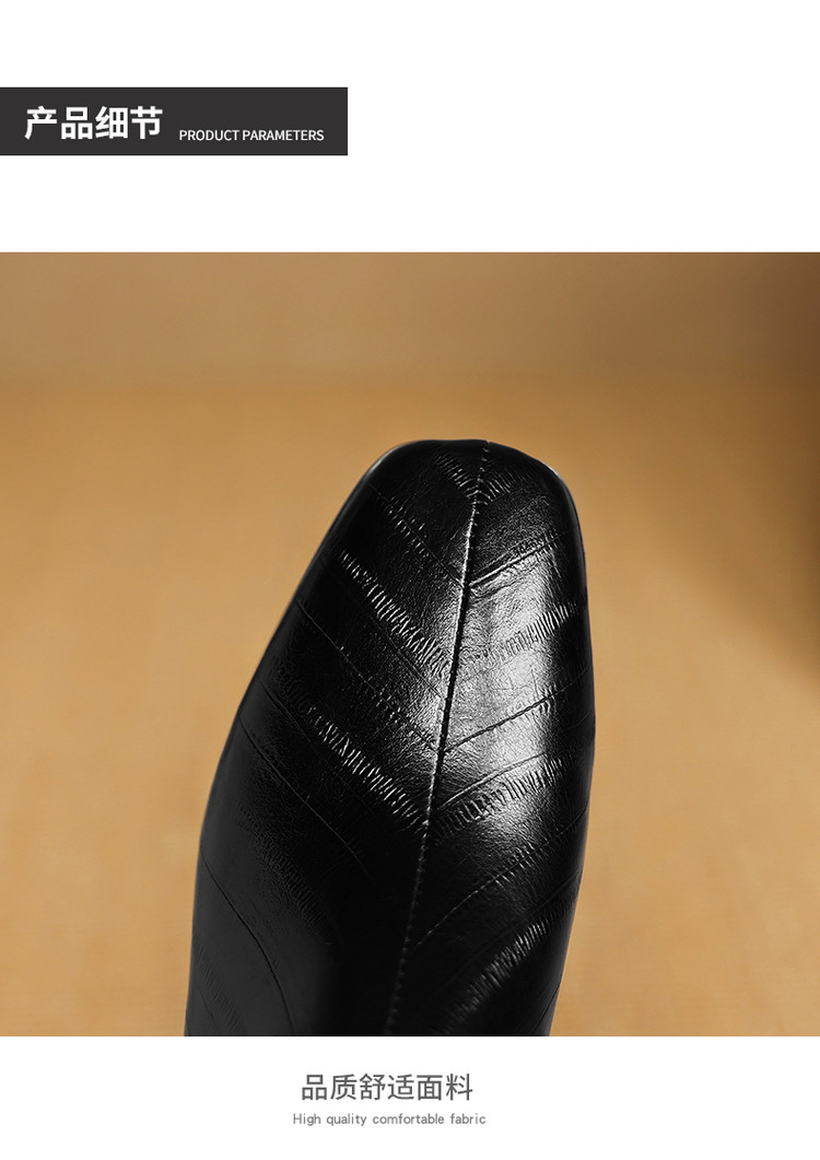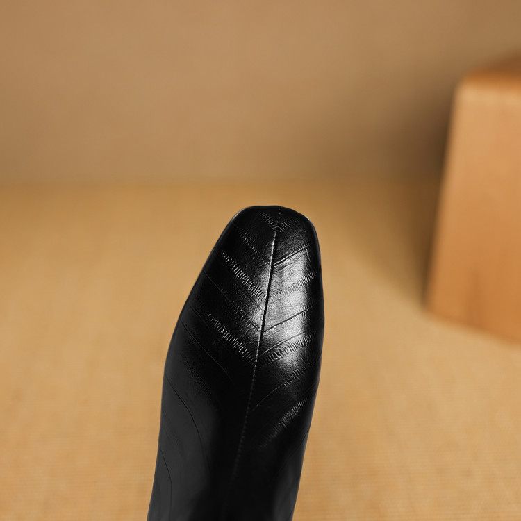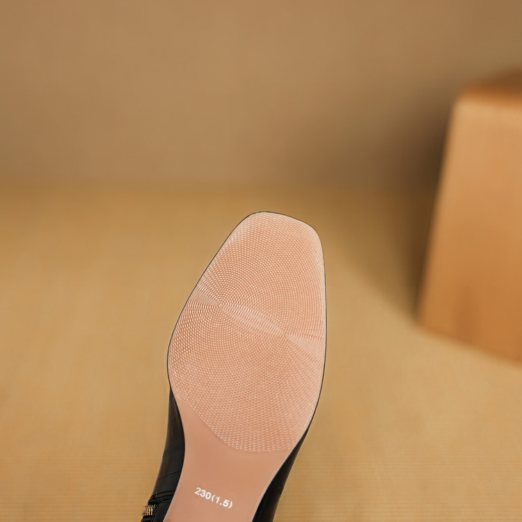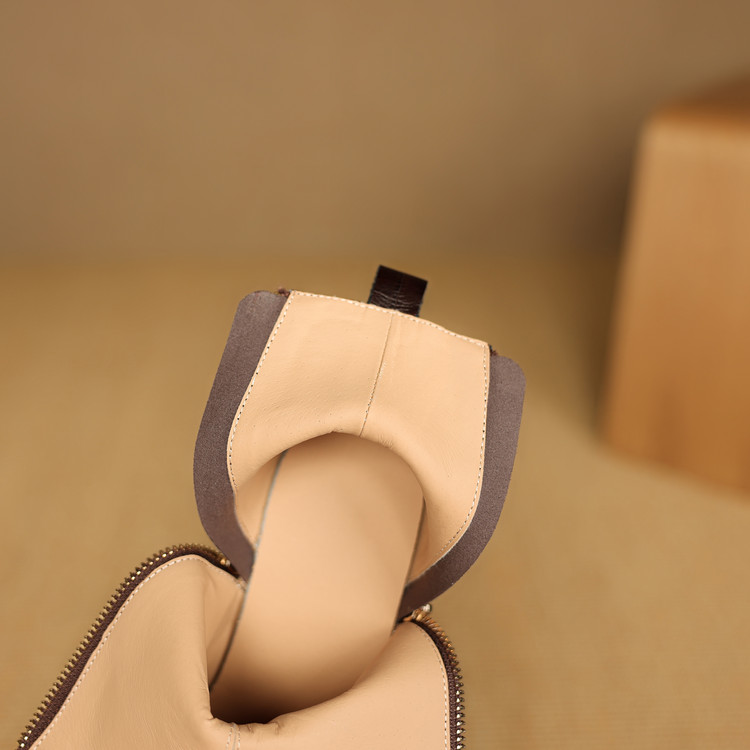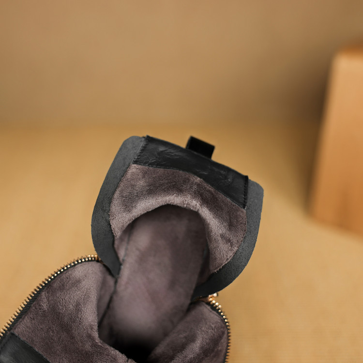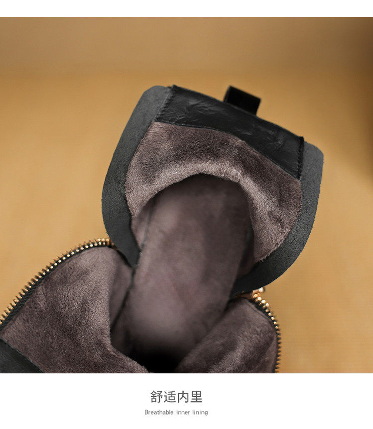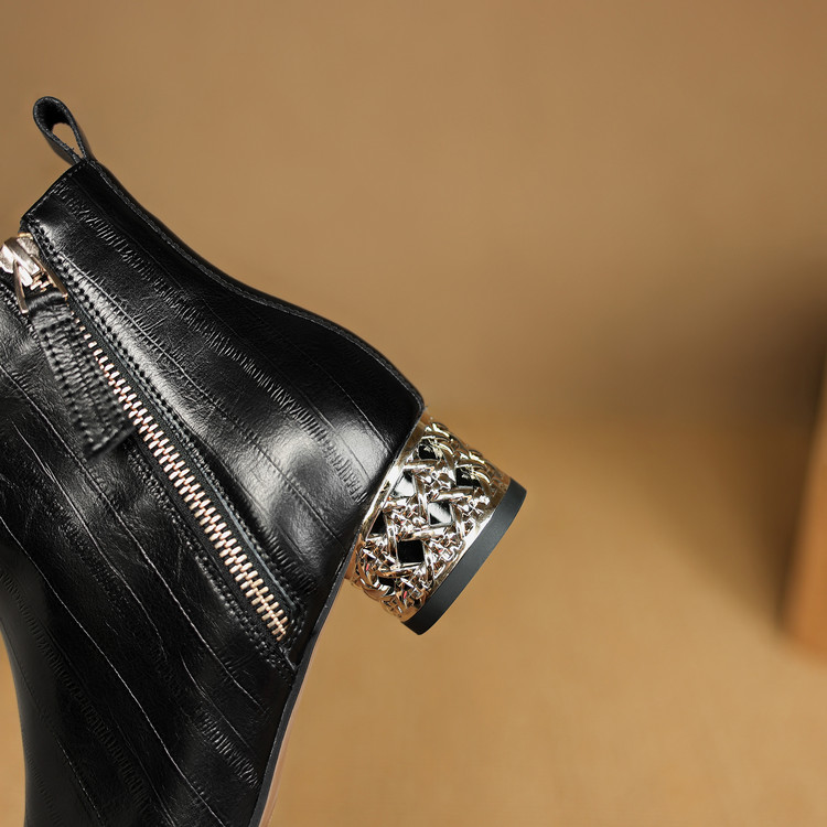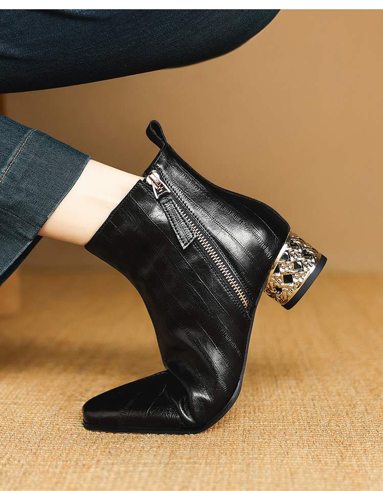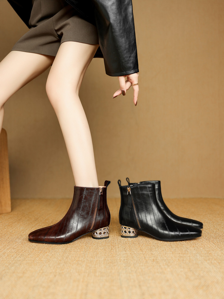 【预售5天】时尚牛皮金属电镀跟短筒时装靴方头侧拉链酒红色加绒中粗跟短靴女NJMK&K1772