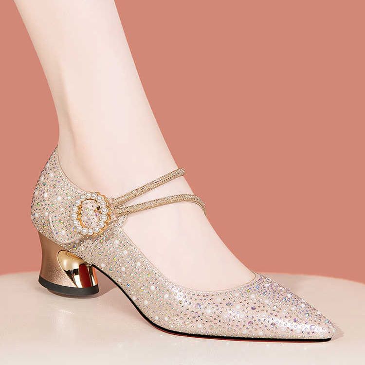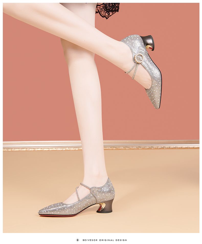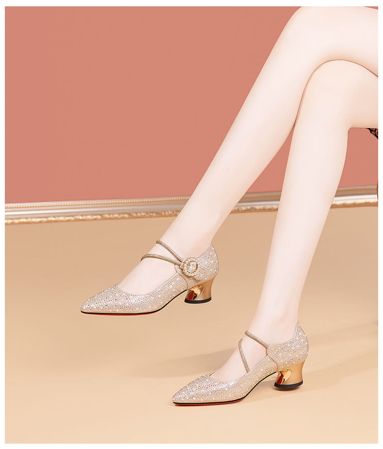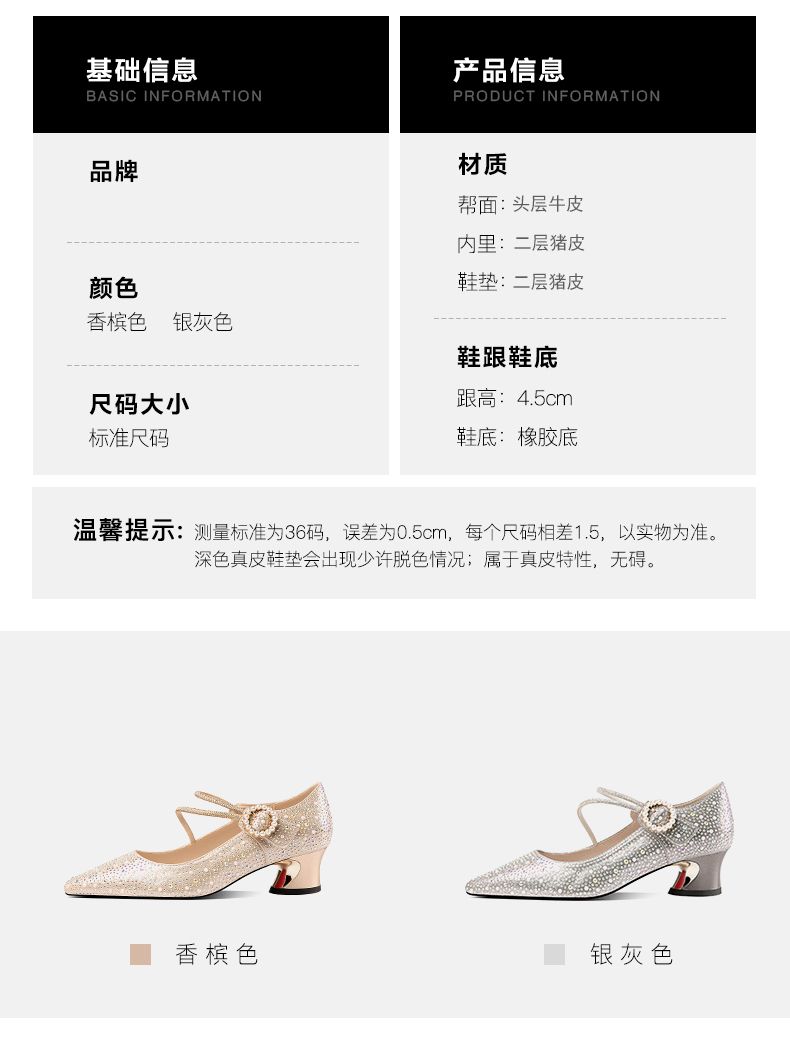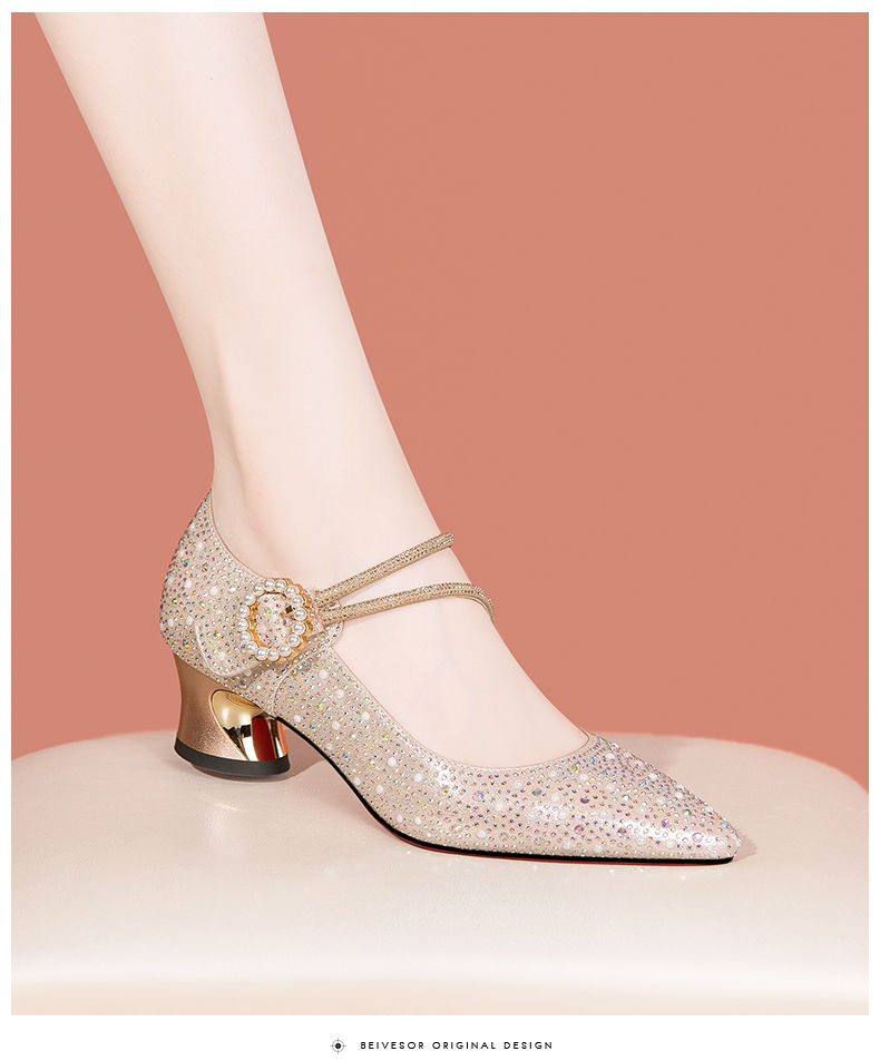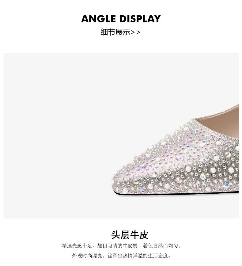 DD-头层牛皮尖头女士满钻高跟鞋2023春季新款中跟魔术贴单鞋