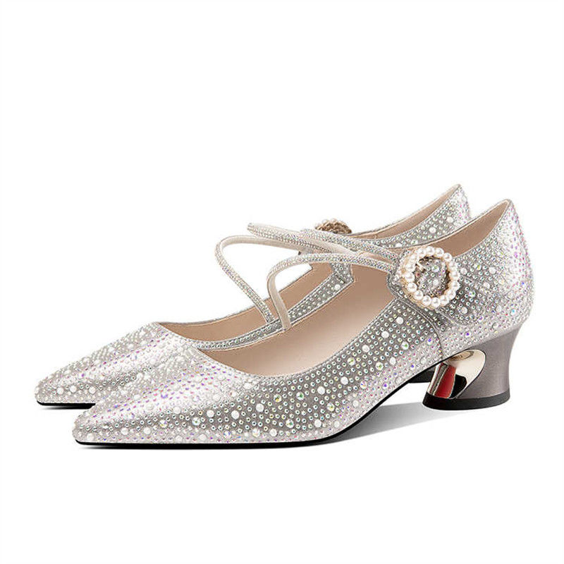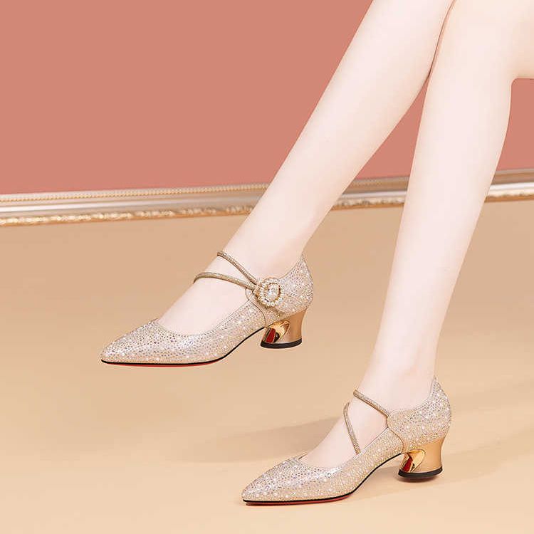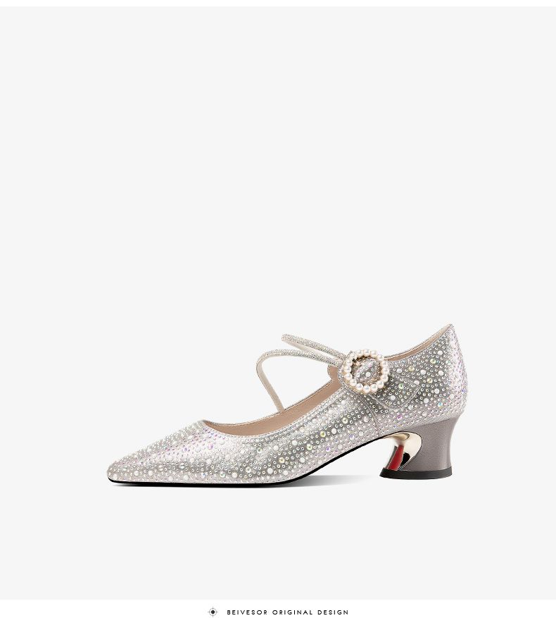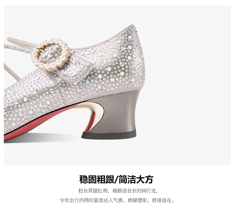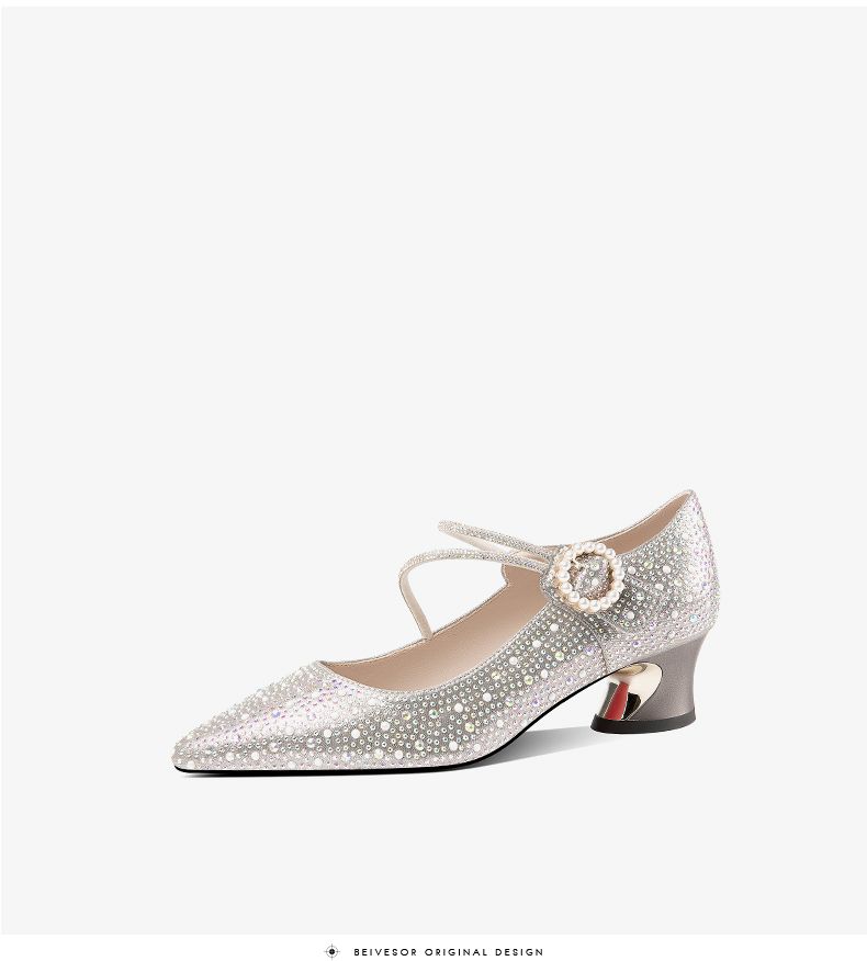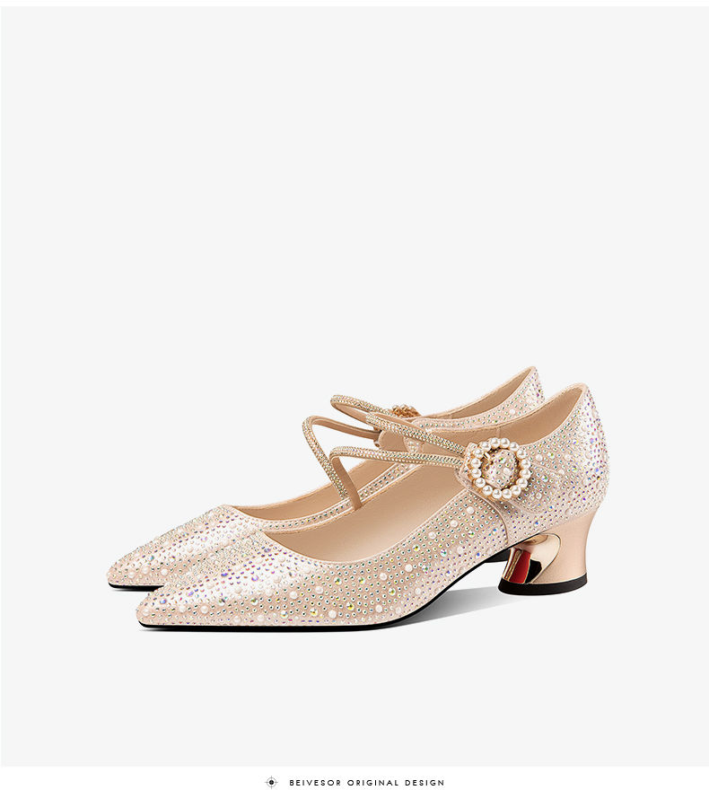 DD-头层牛皮尖头女士满钻高跟鞋2023春季新款中跟魔术贴单鞋