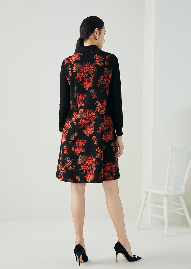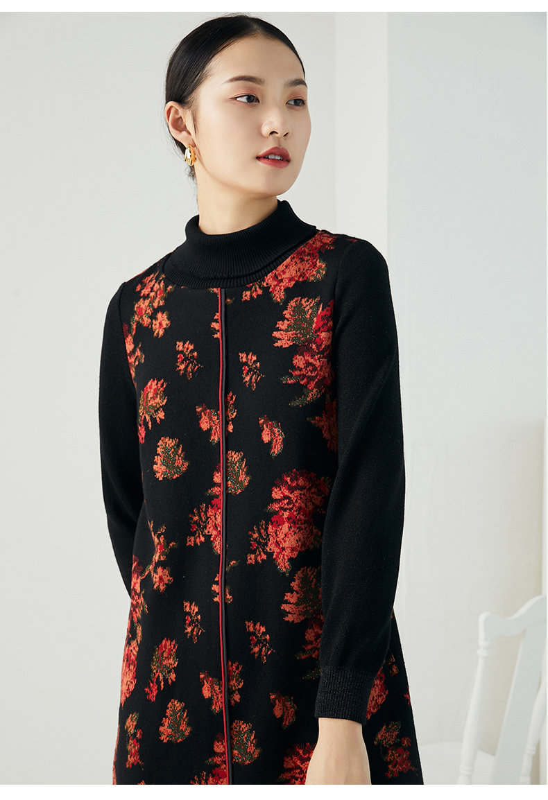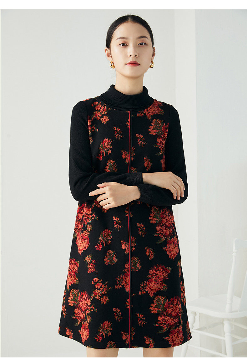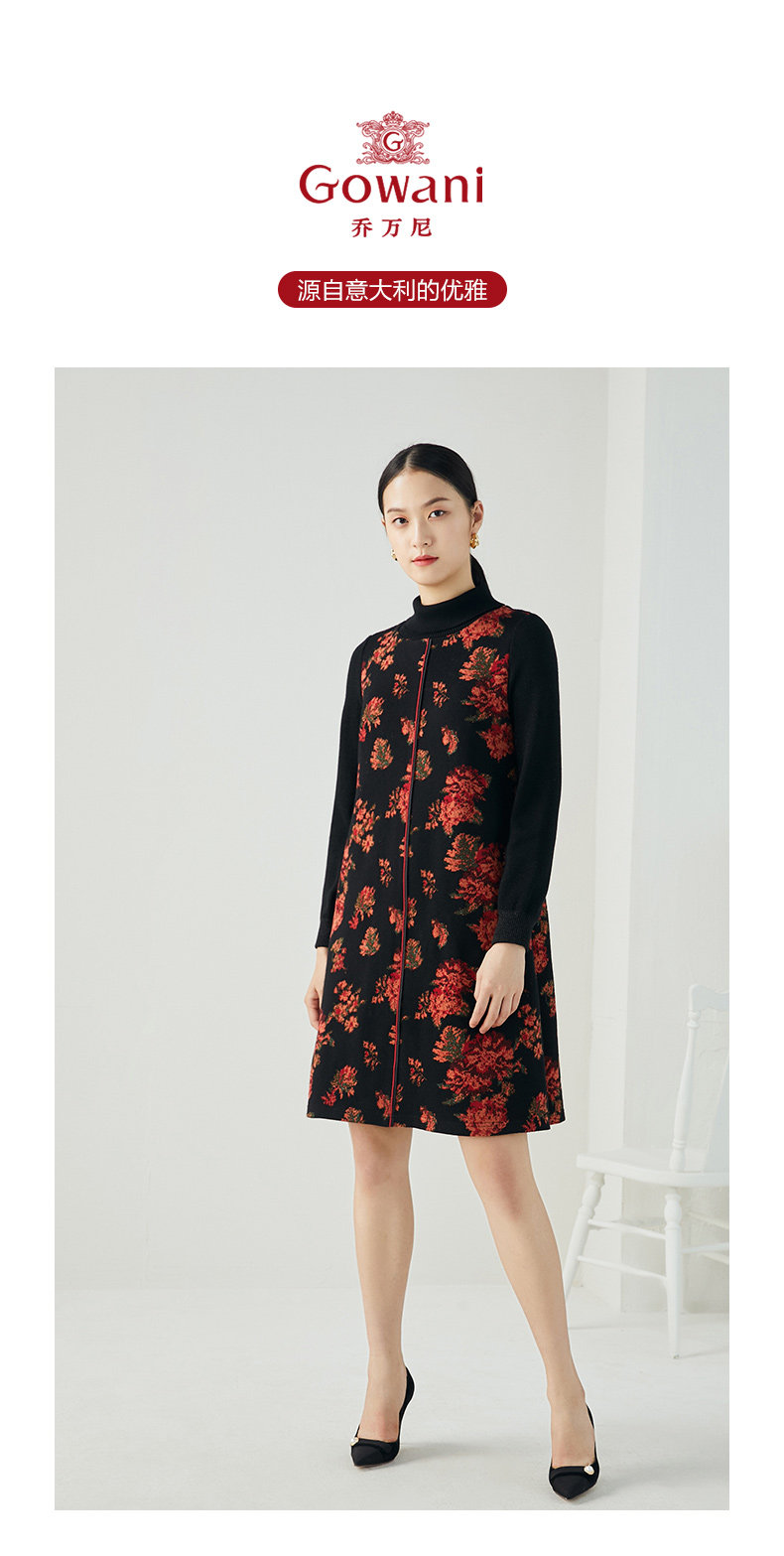乔万尼秋冬新款中长款拼色设计感修身长袖羊毛针织舒适弹力连衣裙ES4E333