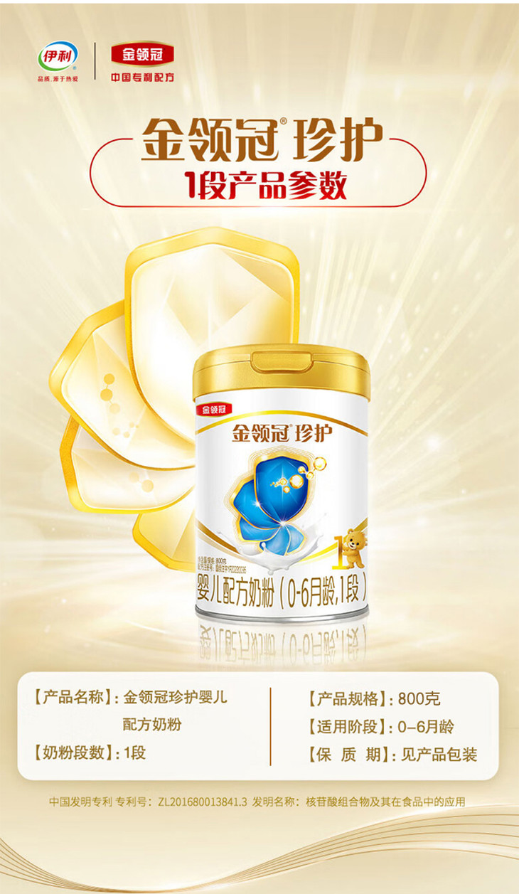 伊利金领冠珍护A2生牛乳奶粉1段800g