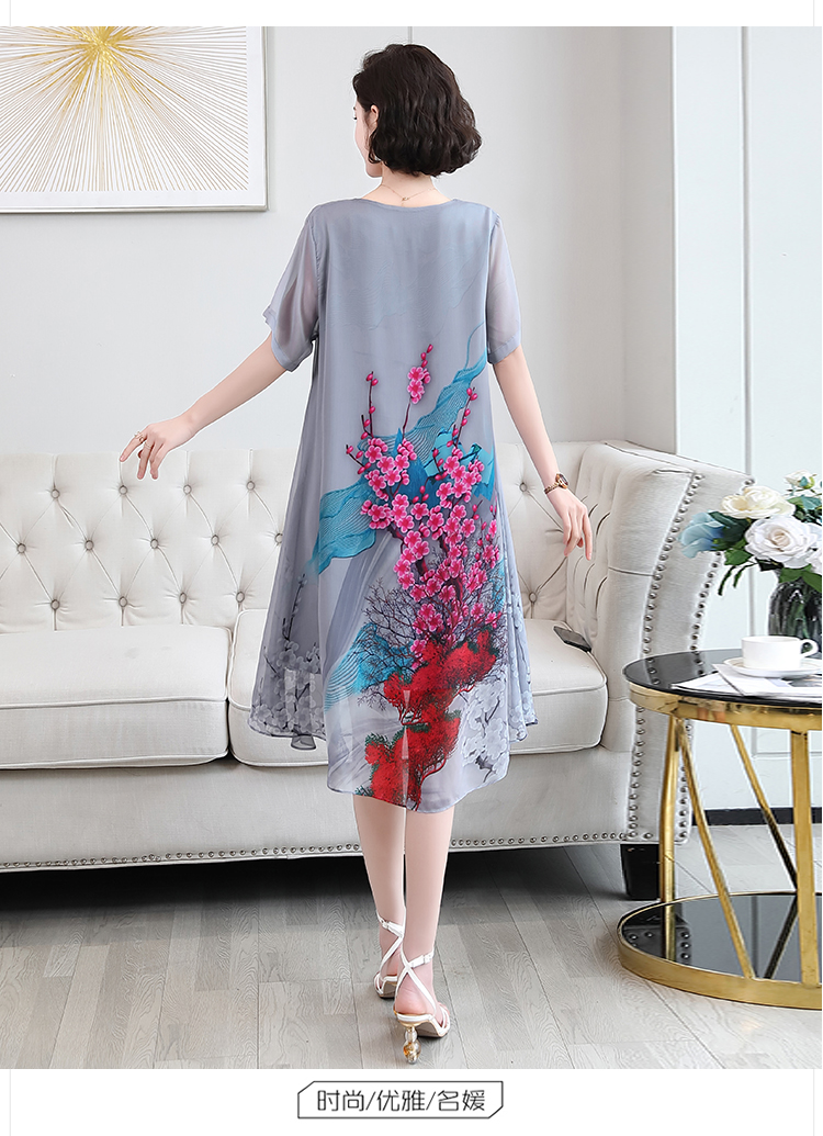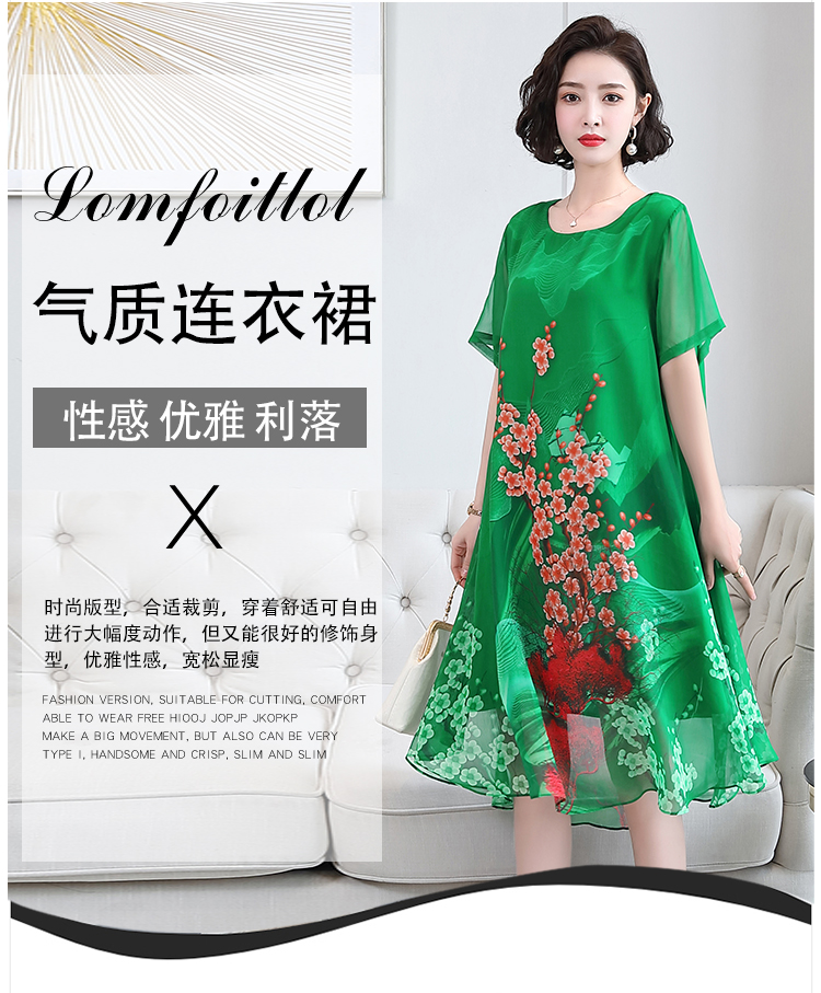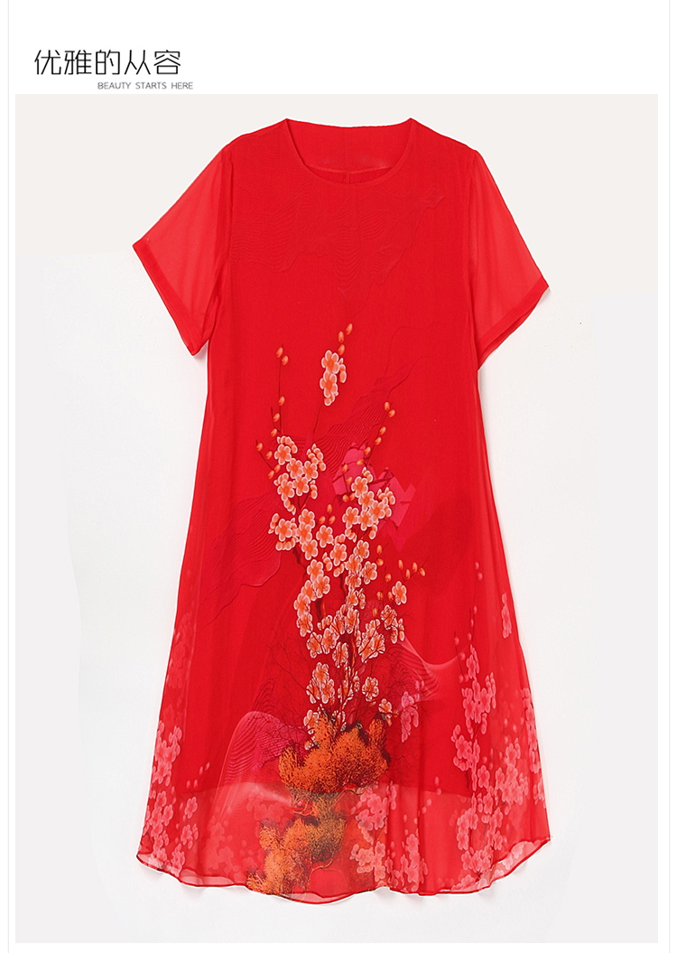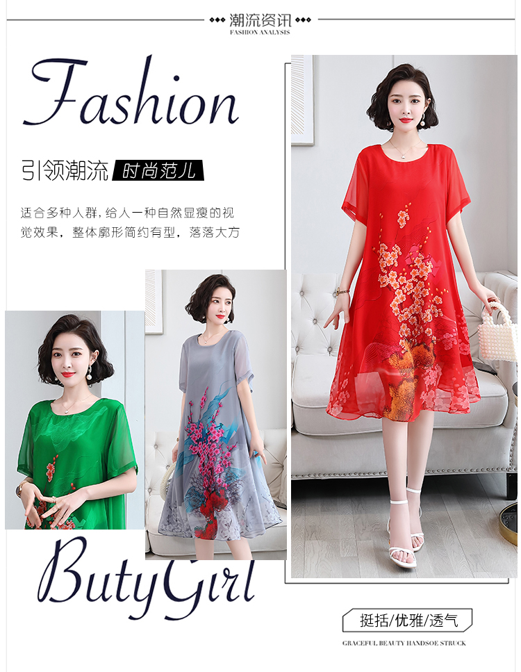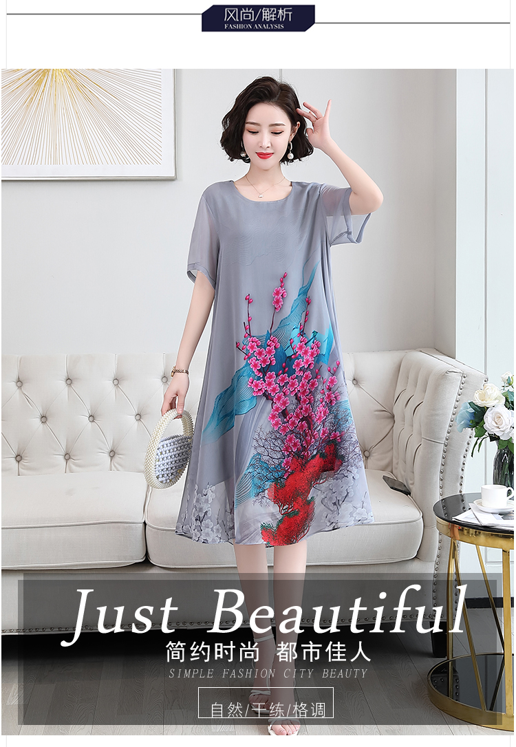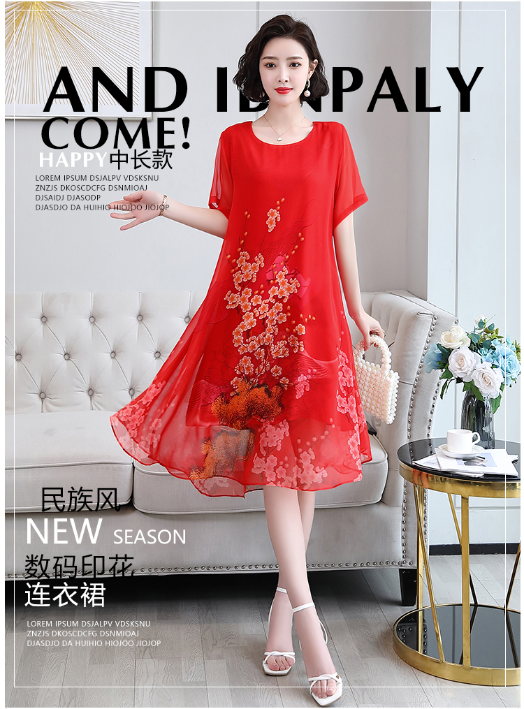 简约时尚优雅仿真丝中长款民族风印花大码女装连衣裙YYG82649-1