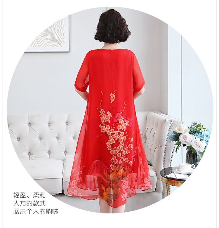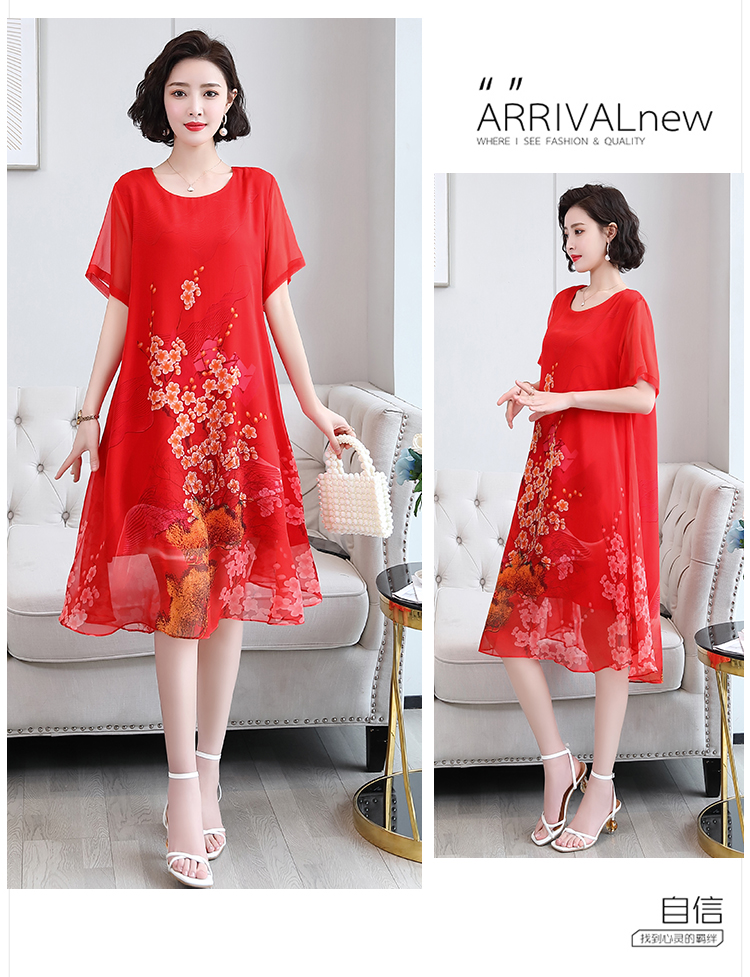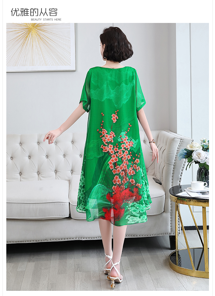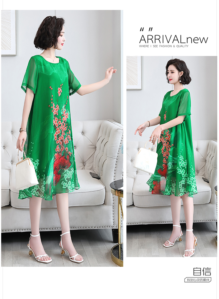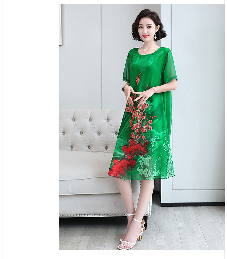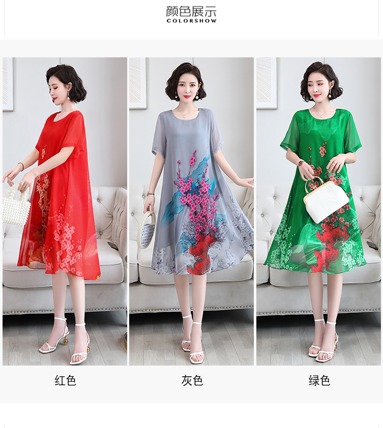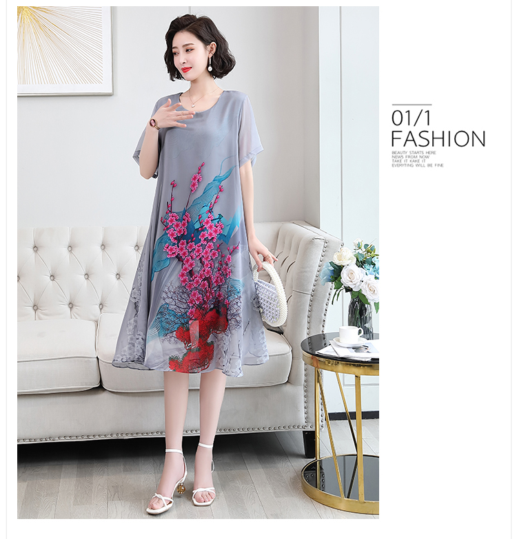 简约时尚优雅仿真丝中长款民族风印花大码女装连衣裙YYG82649-1