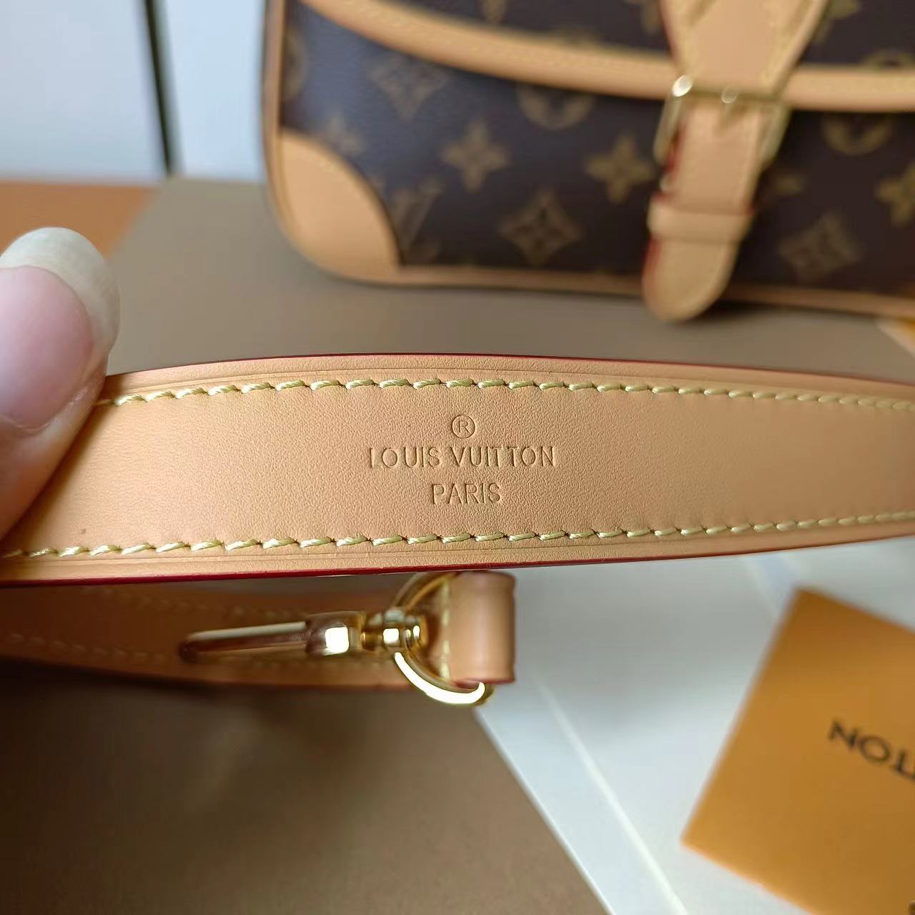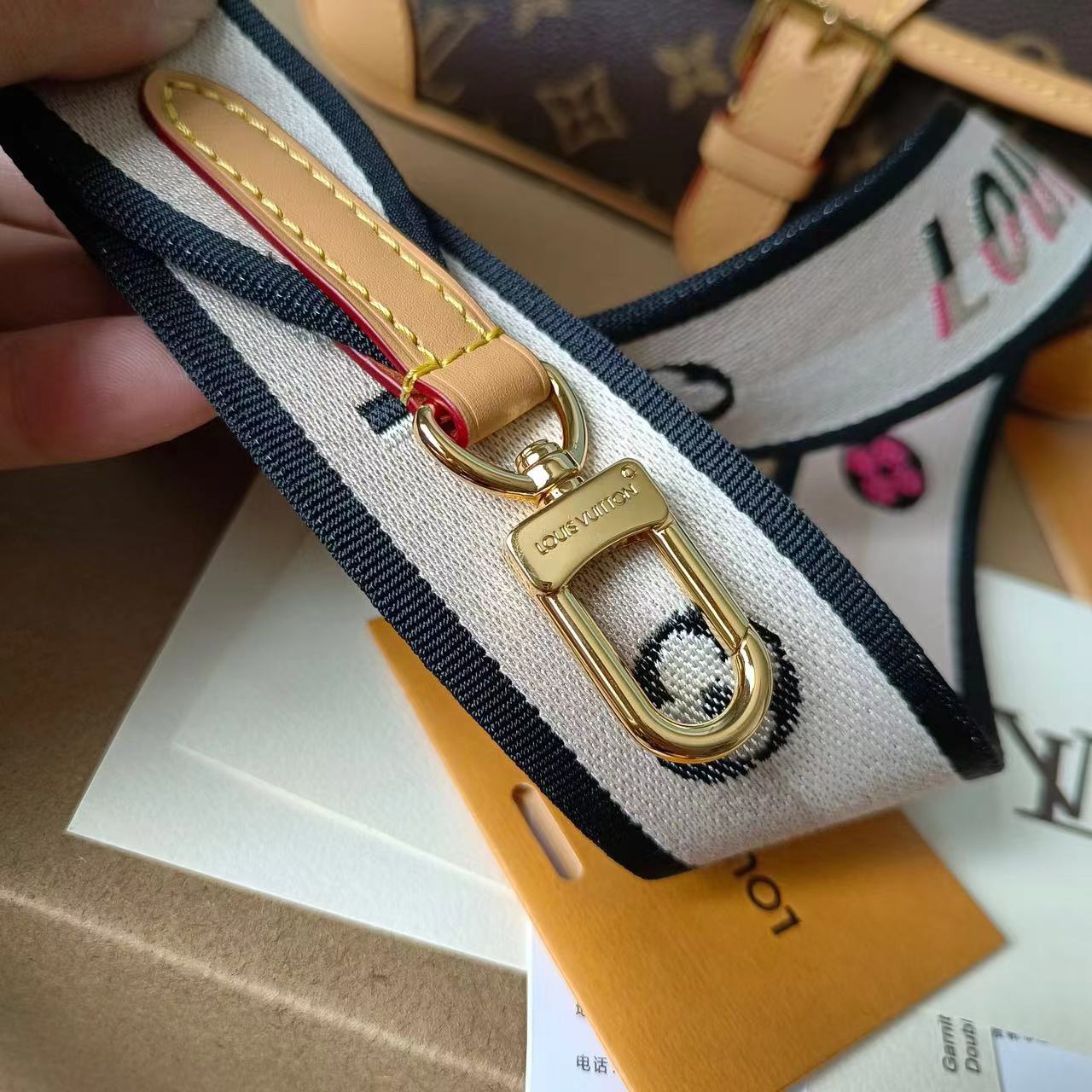 M45985。Diane 手袋重塑 1990 年代的经典设计,为 Monogram 帆布包身融入皮革边角和传统搭扣等复古元素,搭配口袋和齐整内层。宽幅提花肩带两面分别呈现醒目标识和 Monogram 花卉。