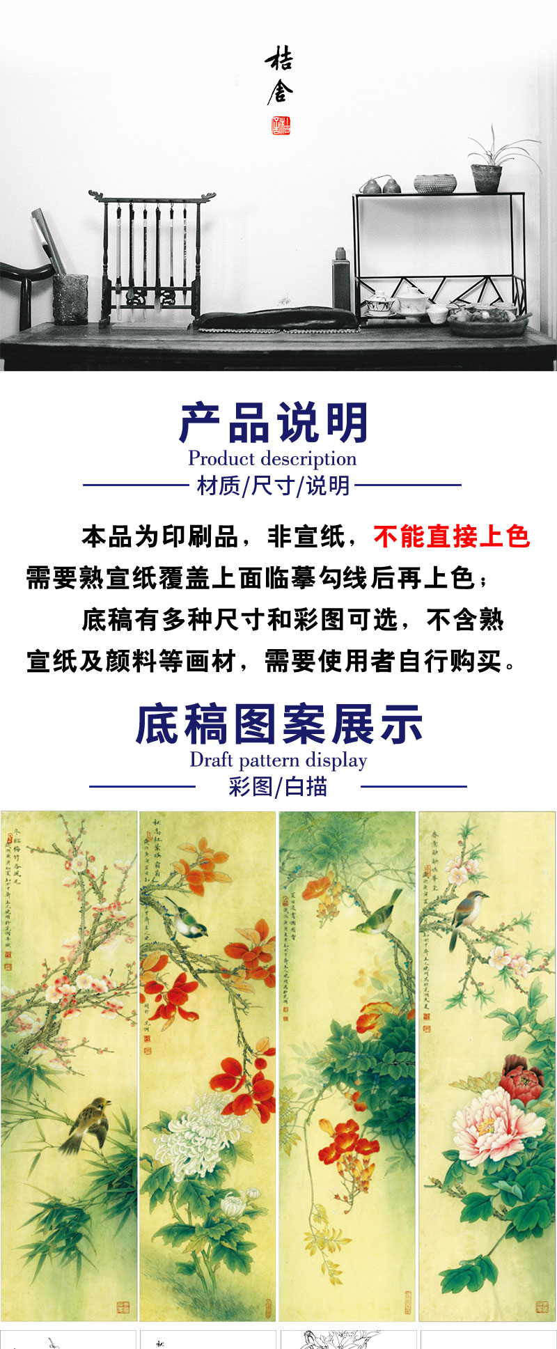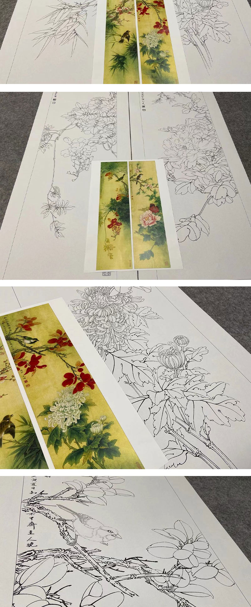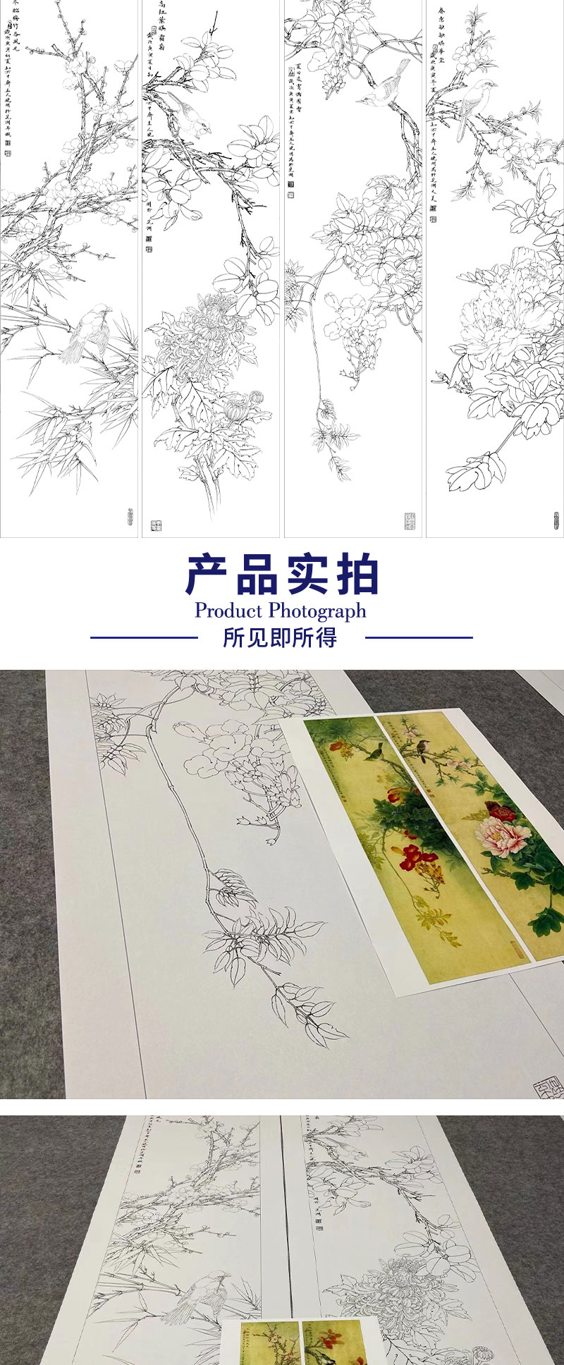 【四条屏】李晓明工笔花鸟画白描底稿《花开四时》临摹勾线花鸟线稿KA31