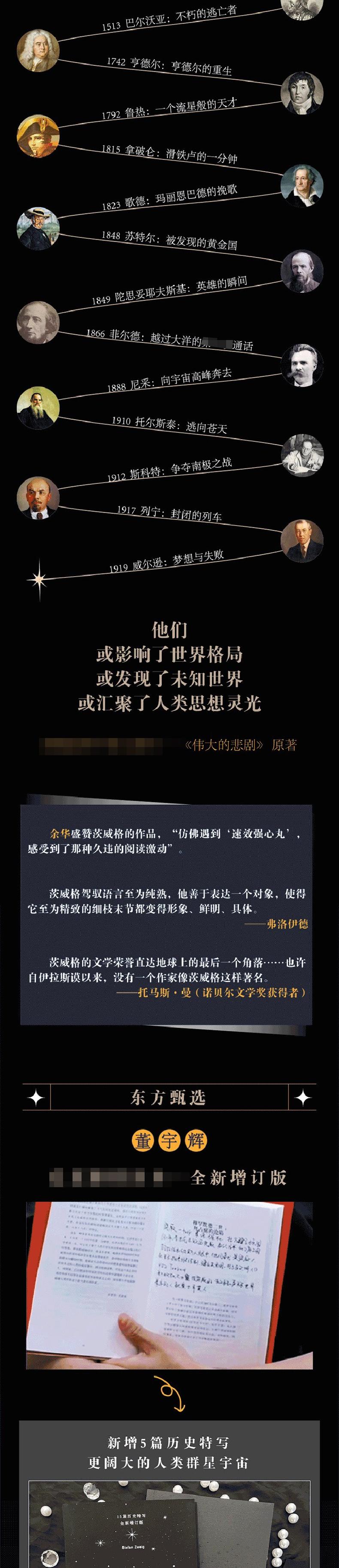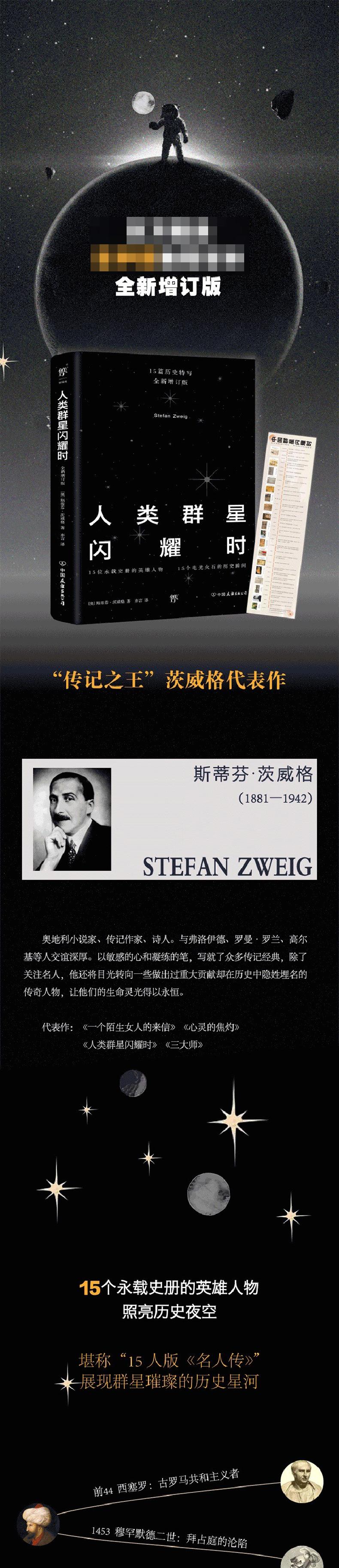 茨威格以艺术家的视角和诗歌般的语言,在尊重历史真相的基础上,创作了这一精彩的作品。15个历史瞬间的特写,展现的是人类的渺小与伟大,旁观者的共情与悲悯,以及对历史的尊重与敬畏。