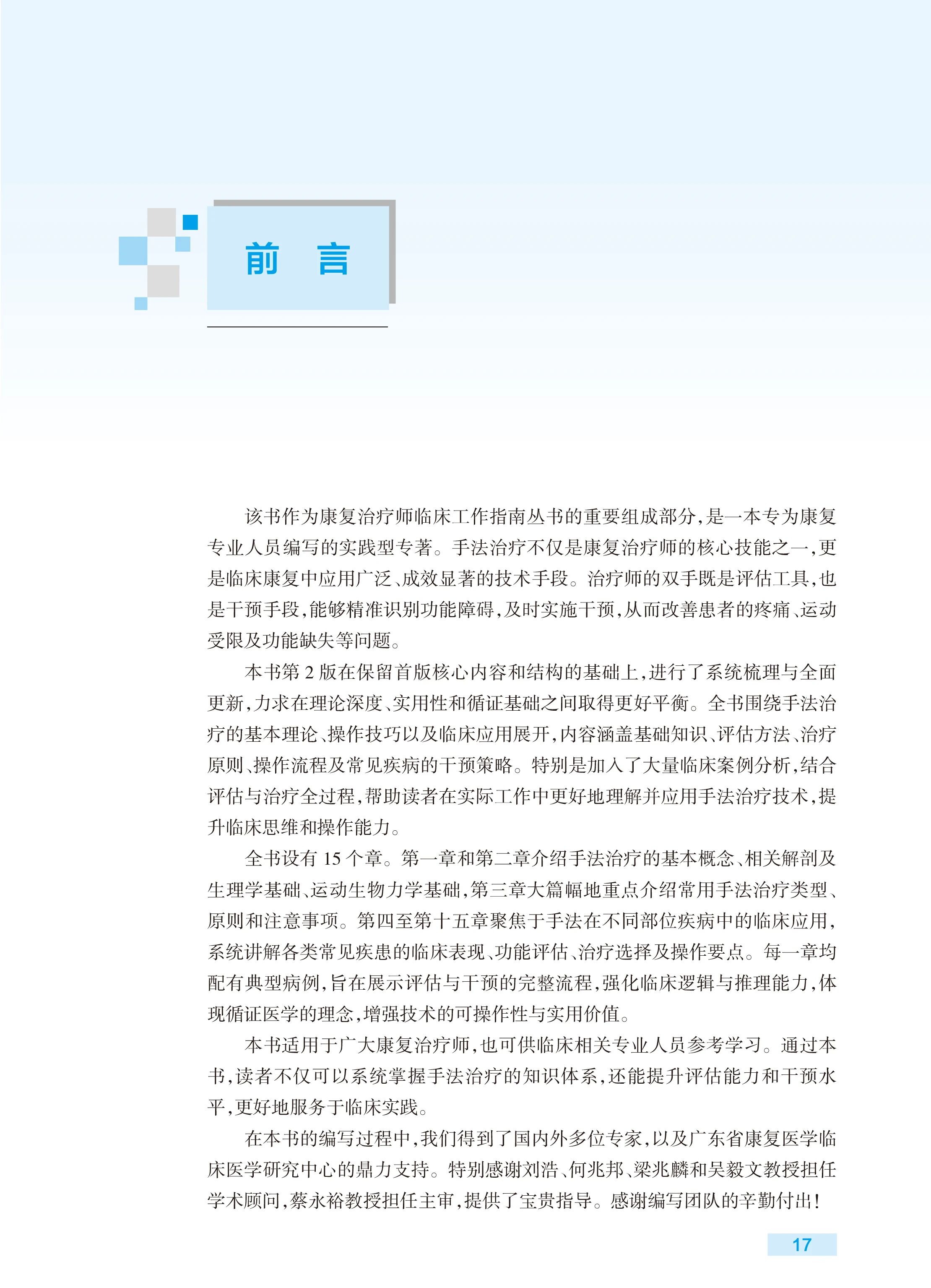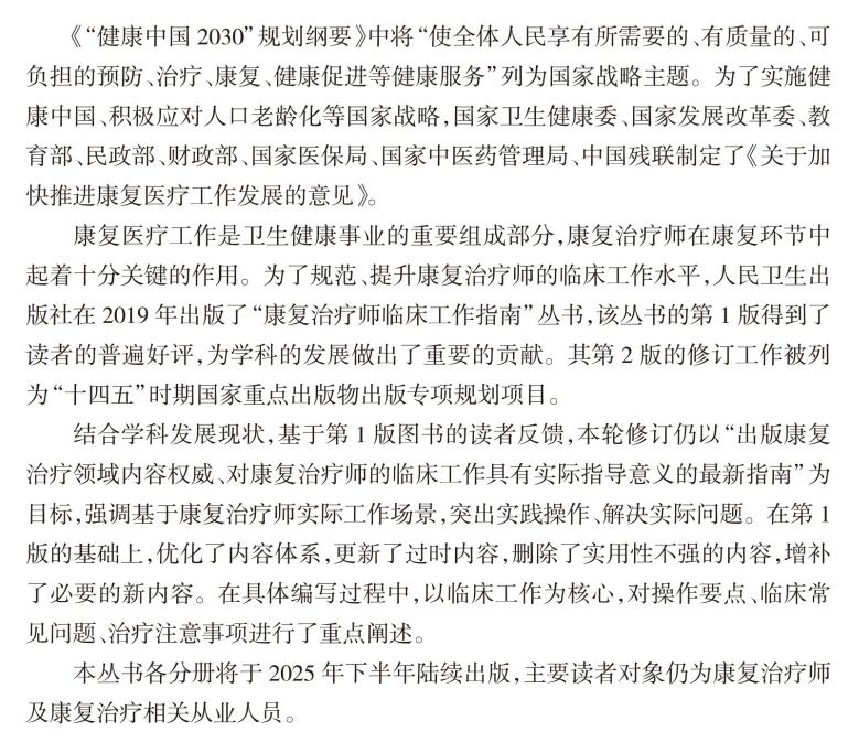 该书的第1版得到了读者的普遍好评,为学科的发展做出了重要的贡献。第2版的修订工作被列为“十四五”国家重点出版物出版规划项目。本书既可以成为康复治疗师开展手法治疗工作的指南,还可以作为康复治疗及相关专业规培生及实习生非常实用的业务参考用书。