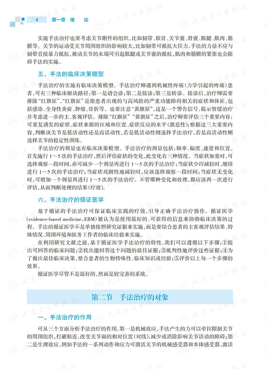 本书第2版在保留首版核心内容和结构的基础上,进行了系统梳理与全面更新,在理论深度、实用性和循证基础之间取得了更好的平衡。全书围绕手法治疗的基本理论、操作技巧以及临床应用展开,内容涵盖基础知识、评估方法、治疗原则、操作流程及常见疾病的干预策略。全书设有15章。前二章介绍手法治疗的基本概念和原理,第三章重点介绍常用治疗手法的类型、原则和注意事项。第4-15章聚焦于手法在不同部位疾病中的临床应用。每一章均配有典型病例,旨在展示评估与干预的完整流程,强化临床逻辑与推理能力,体现循证医学的理念,增强技术的可操作性与实用价值。