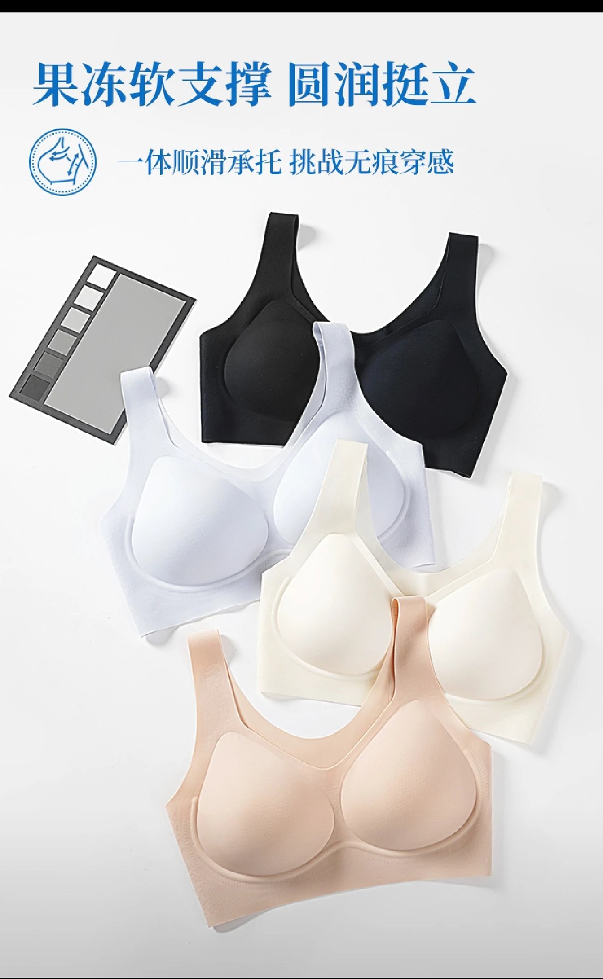 2、软支撑更挺拔,W型果冻胶软支撑,不用钢圈也能稳稳托胸,胸型圆润聚拢,加高侧比把副乳都收进去,显瘦又好看!