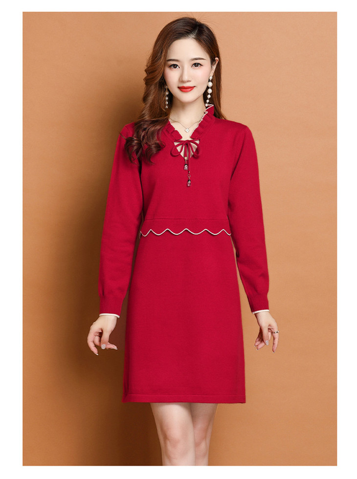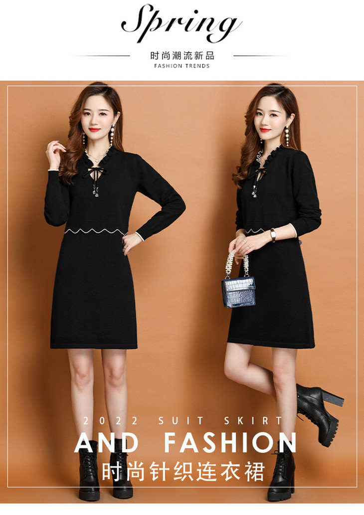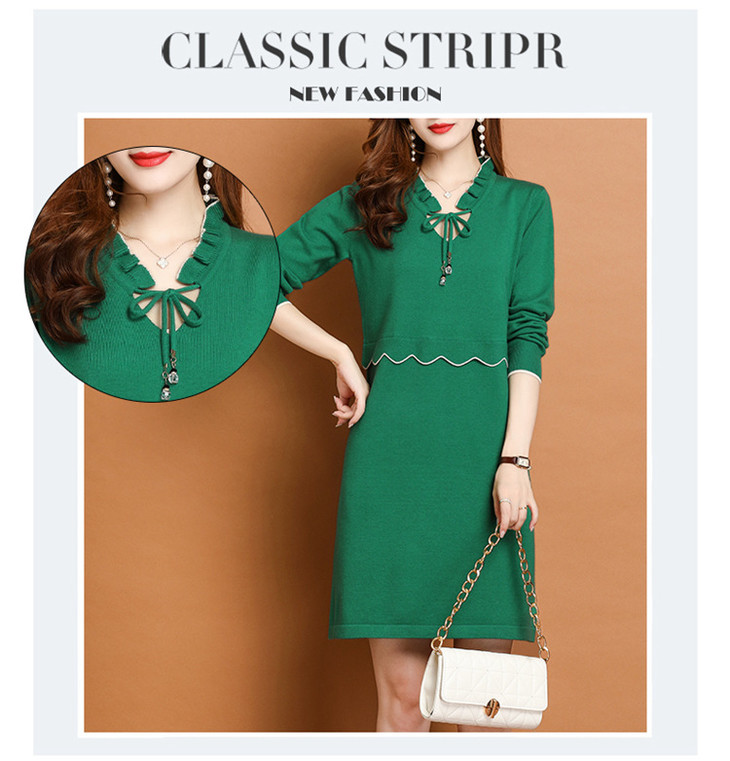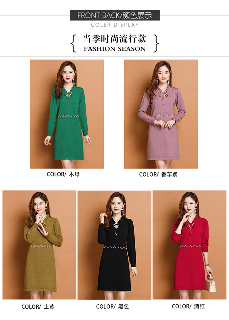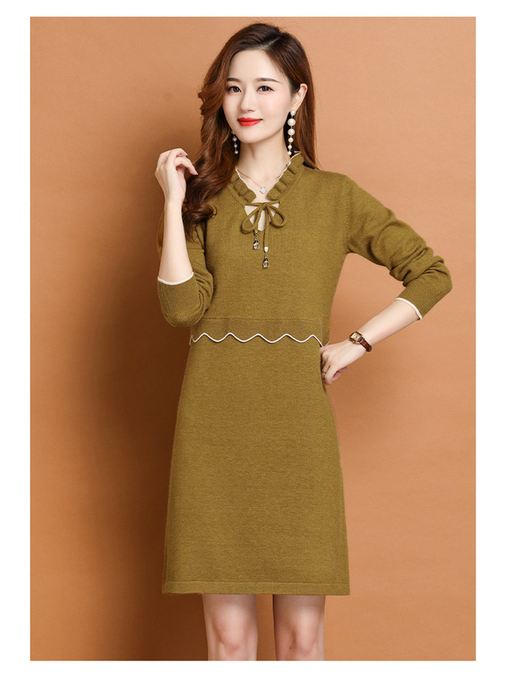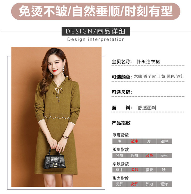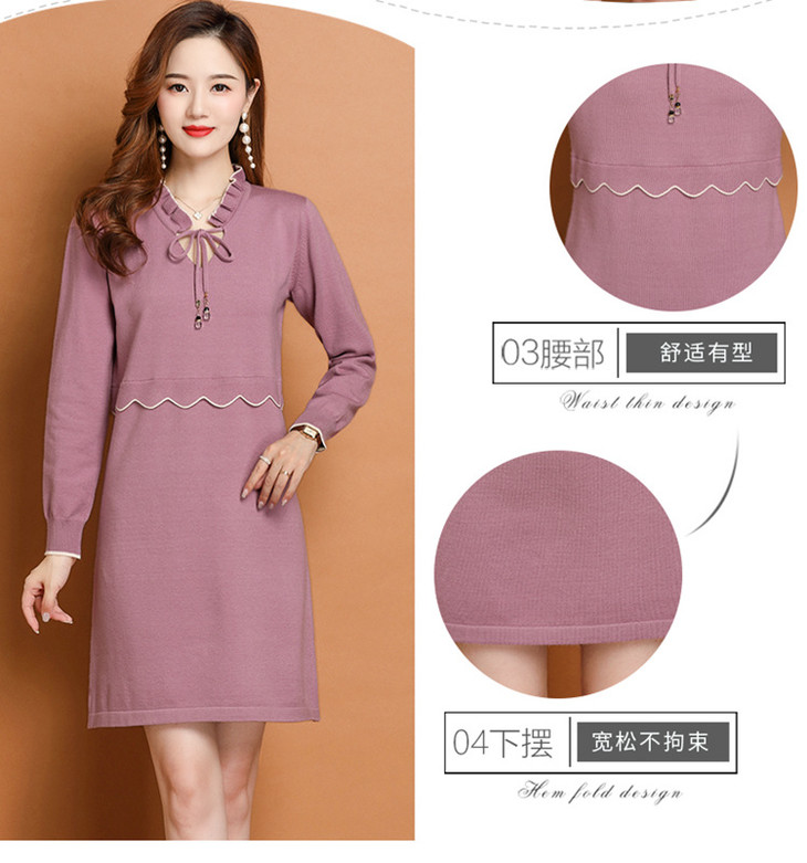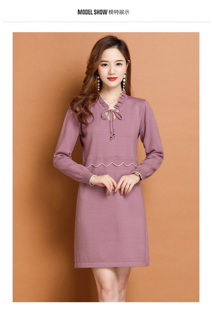 FCY-FQ8521新款时尚优雅气质修身显瘦减龄V领长袖木耳边针织百褶连衣裙
