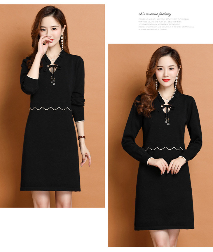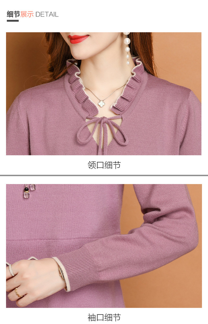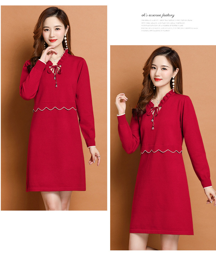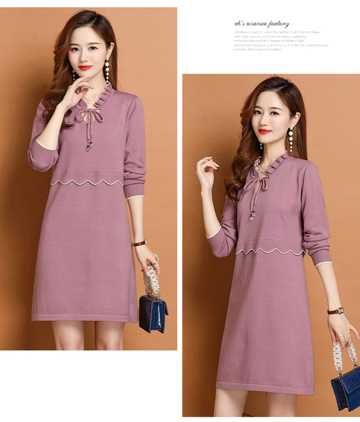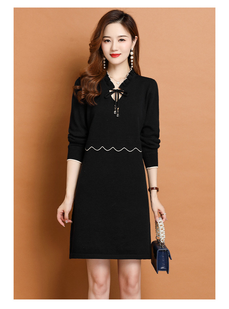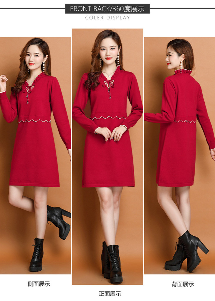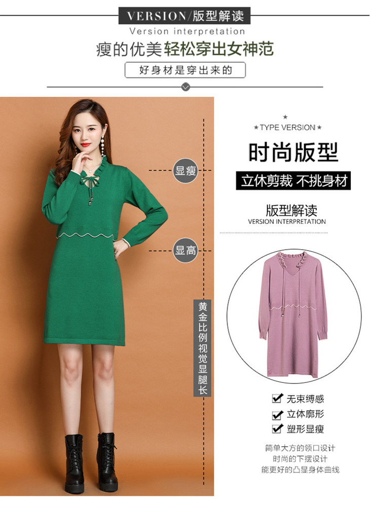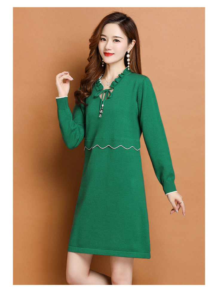 FCY-FQ8521新款时尚优雅气质修身显瘦减龄V领长袖木耳边针织百褶连衣裙