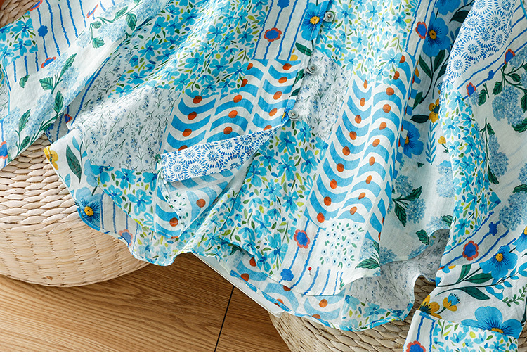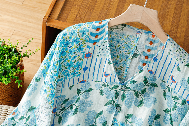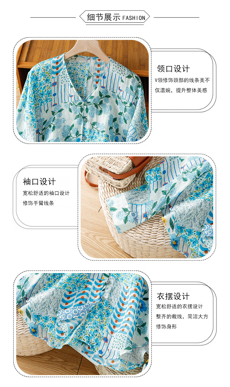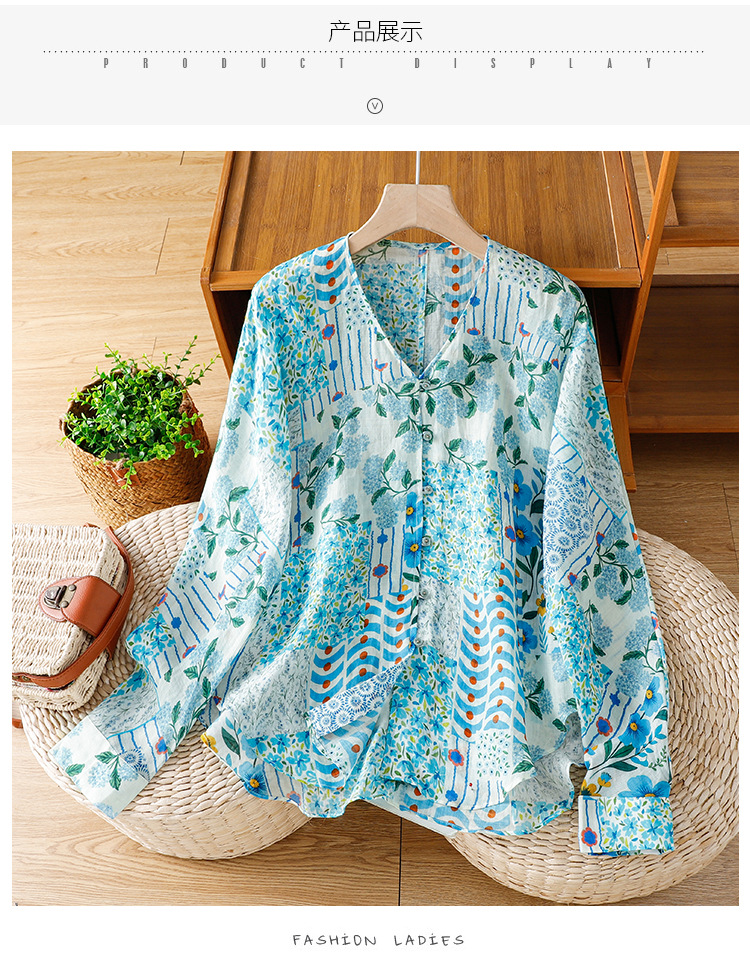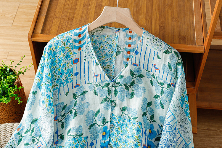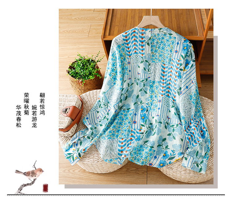 雀说文艺度假风宽松大码女装显瘦v领蓝色碎花长袖衬衫AL9358